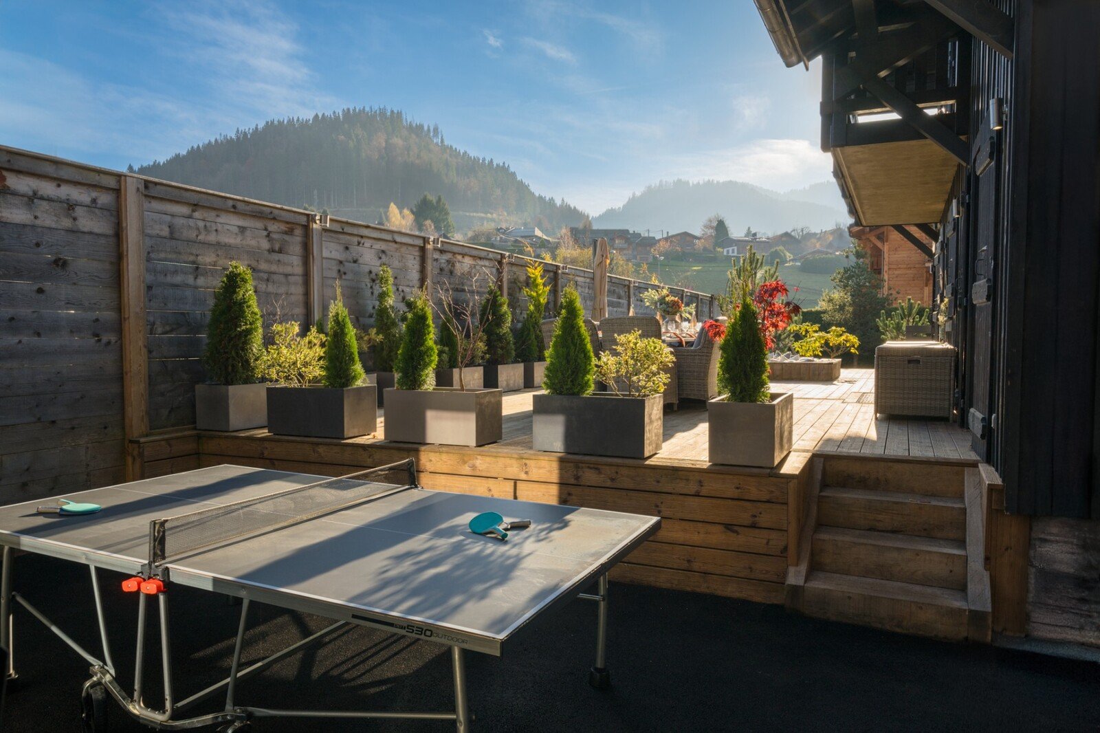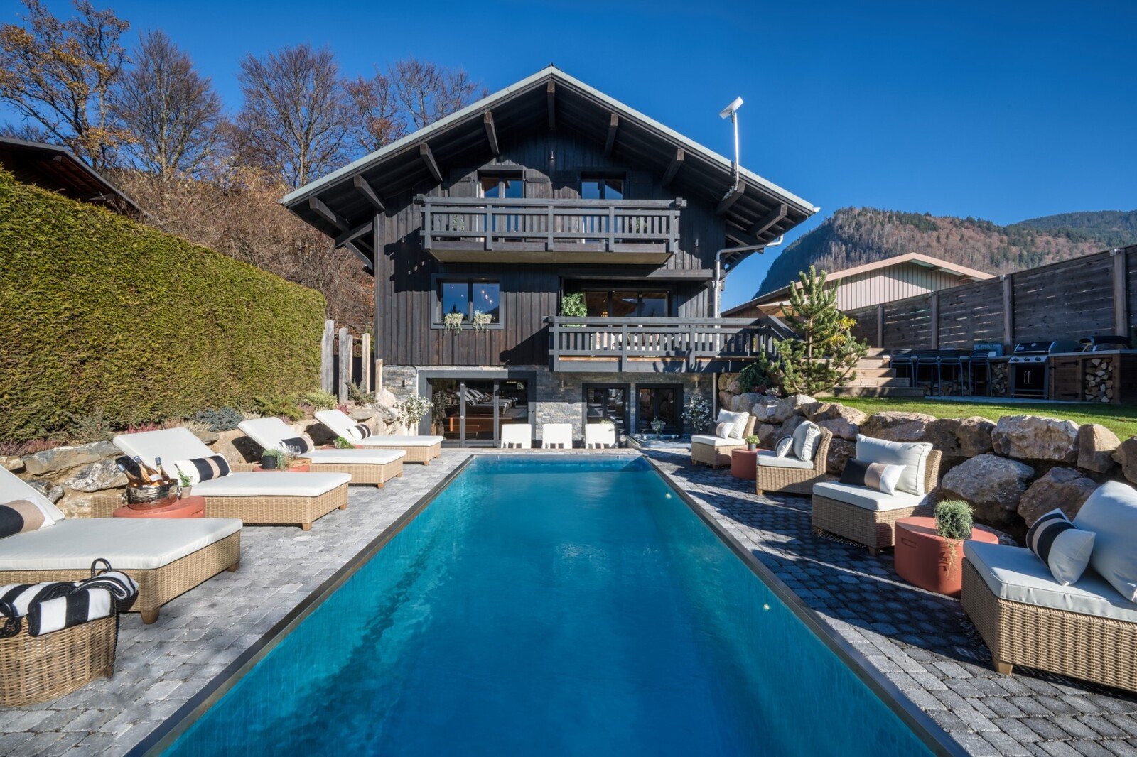 The chalet has been perfectly integrated into its plot with wooden decked terraces, an outdoor kitchen area, seating around a fire pit, a jacuzzi, swimming pool and garden. On flat ground and well orientated to profit from all day sunshine.