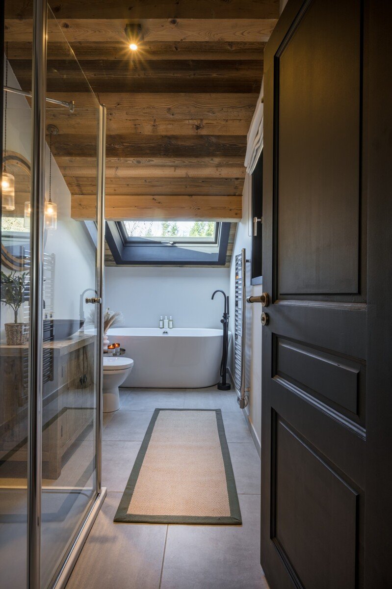 A private driveway provides space for at least 3 cars, and access to a separate garage building, with two garage spaces, including an electric car charging point and bike storage. One of these has been equipped as a large ski and boot room with benches, boot dryers, shelves for helmets and gloves, and hanging space for drying wet gear.