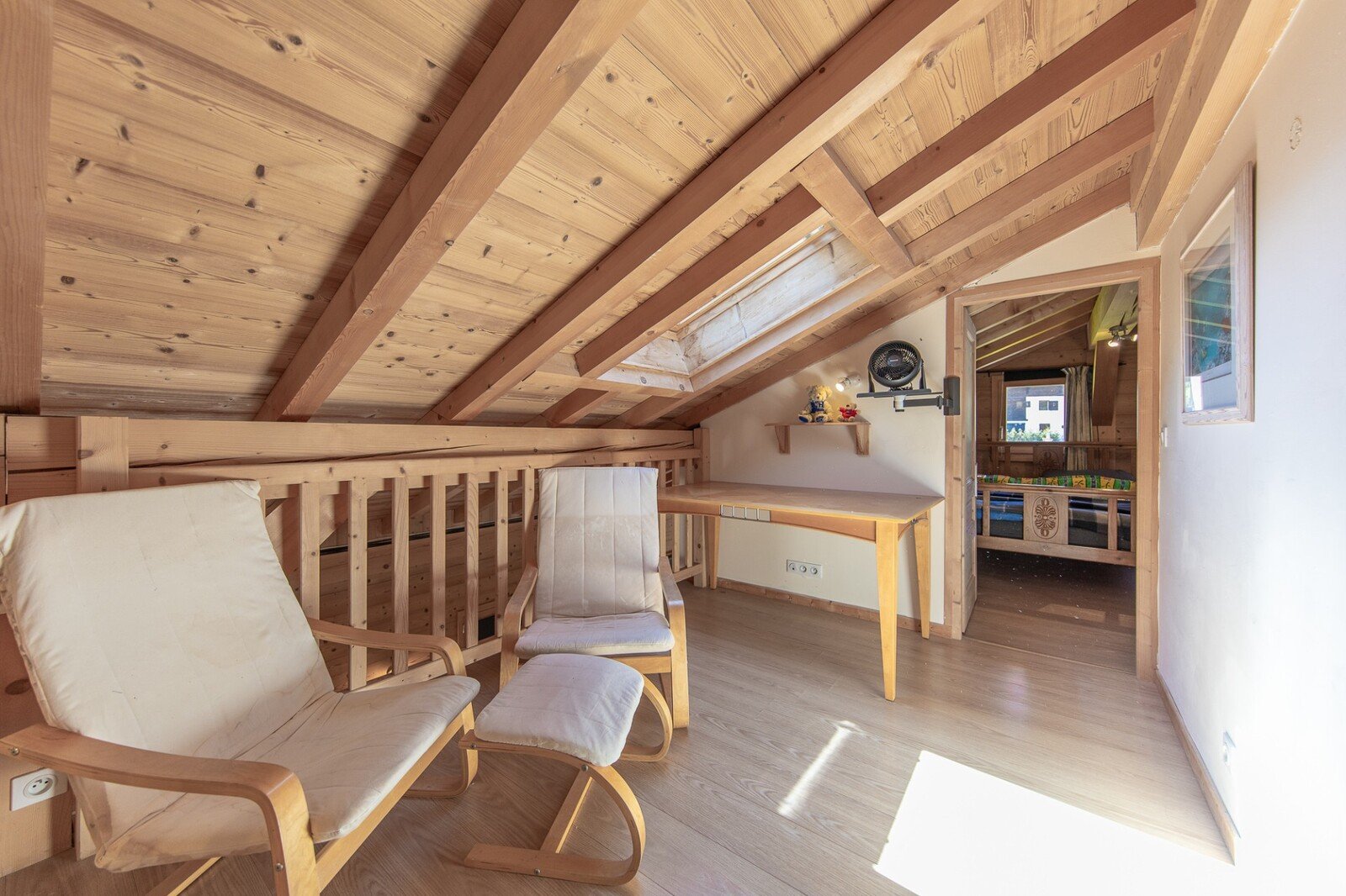 The upper part of the property boasts spacious living areas with open-plan kitchens. High ceilings and exposed beams add traditional charm to this chalet. There are also five bedrooms, five bathrooms, a covered balcony, separate WCs, a laundry room and storage space.