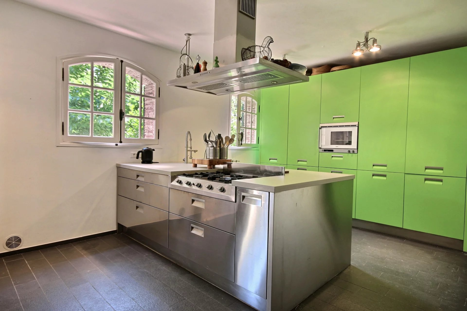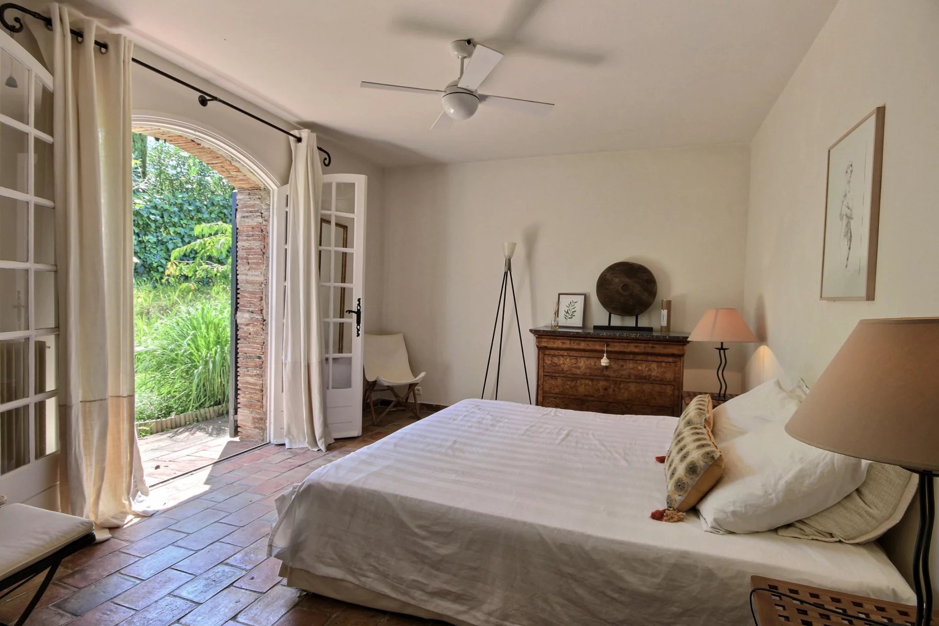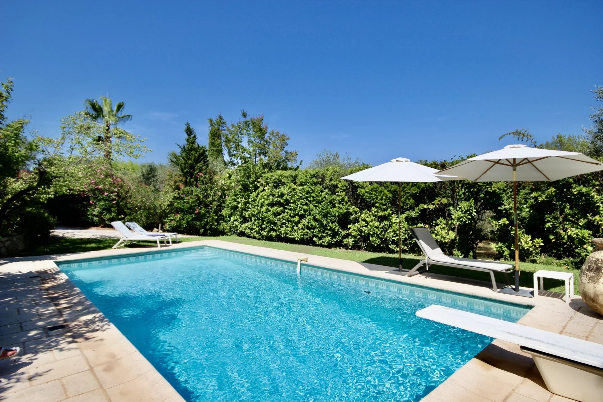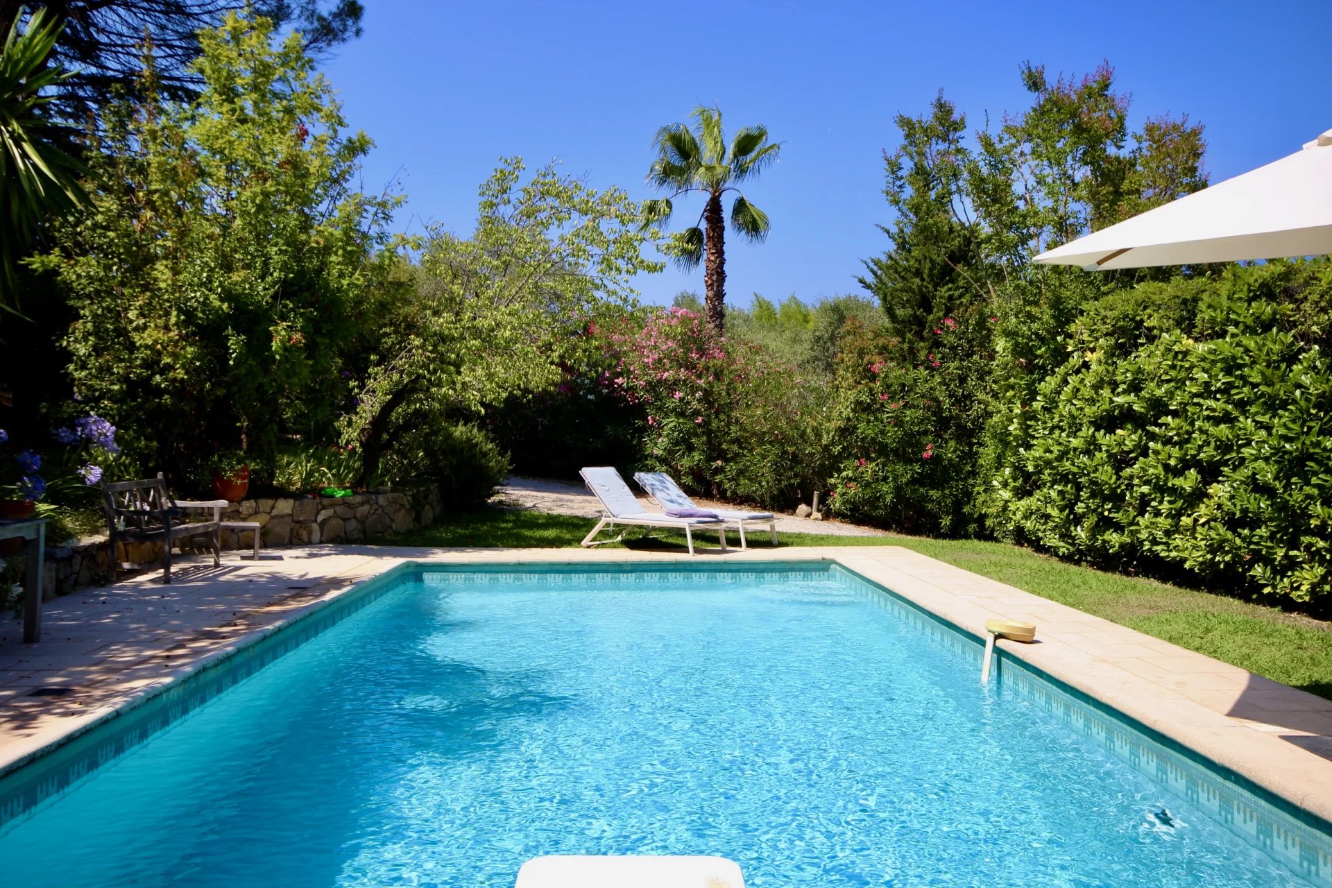 This residence with its timeless charm and character also benefits from a pleasant swimming pool area surrounded by beautiful vegetation, an ideal place to enjoy the mild Cote d’Azur weather in summer under the shade of a tree.