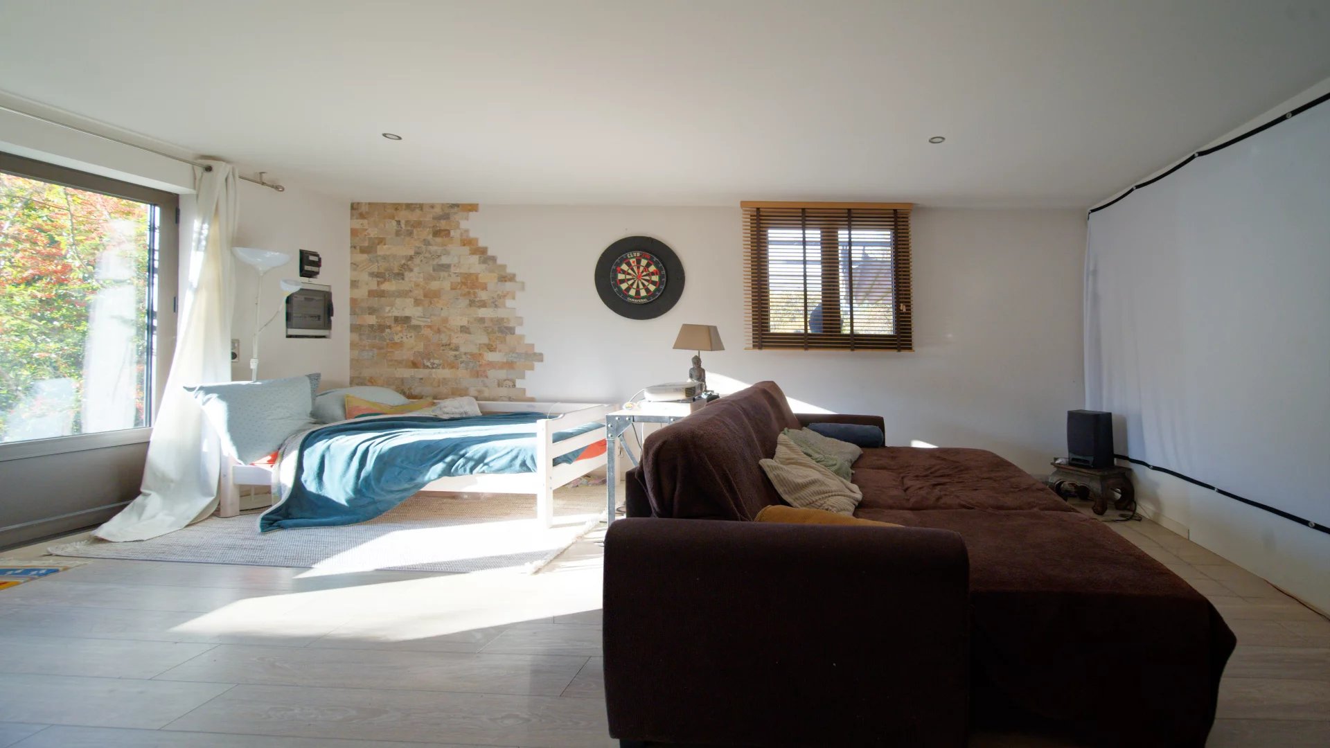 The garden level features a living room with kitchen, two bedrooms, a large convertible room, and two shower rooms with toilets, one of which can be made independent.