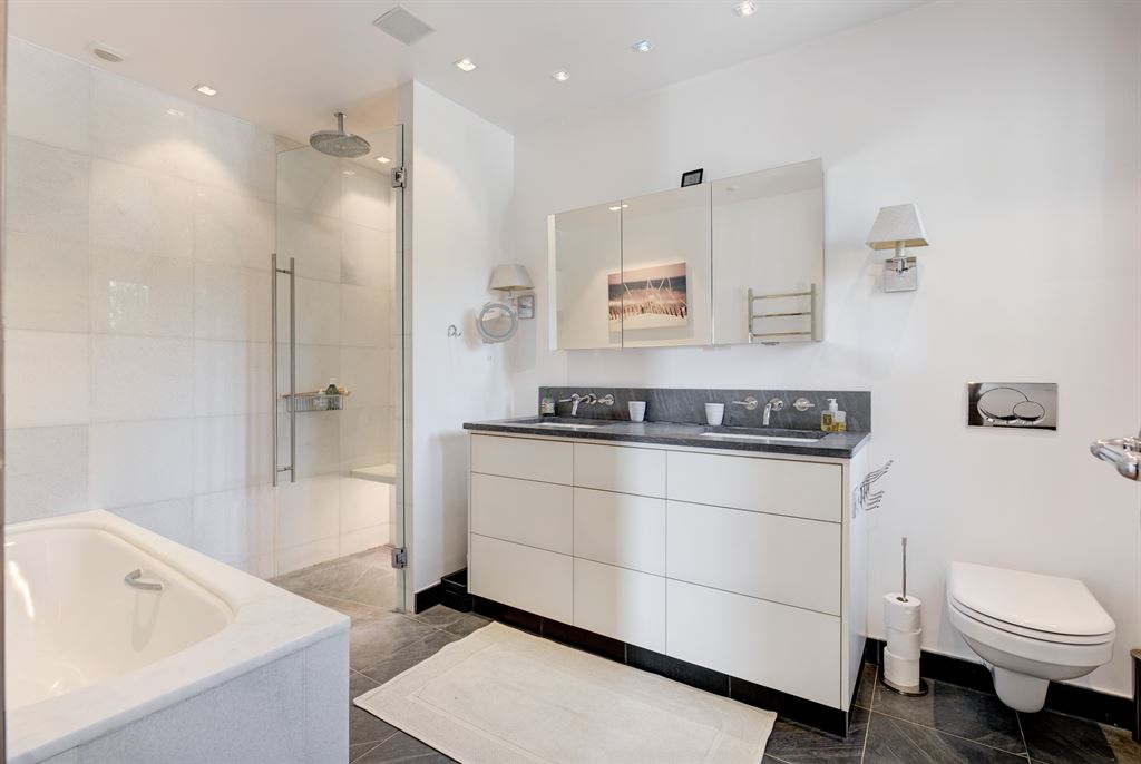 Inside, the ground floor features four stunning en-suite bedrooms, including a spacious master suite. The bright and open living spaces offer a seamless flow, with each room opening onto a large balcony spanning the entire facade, providing unobstructed views of the surrounding landscape.
