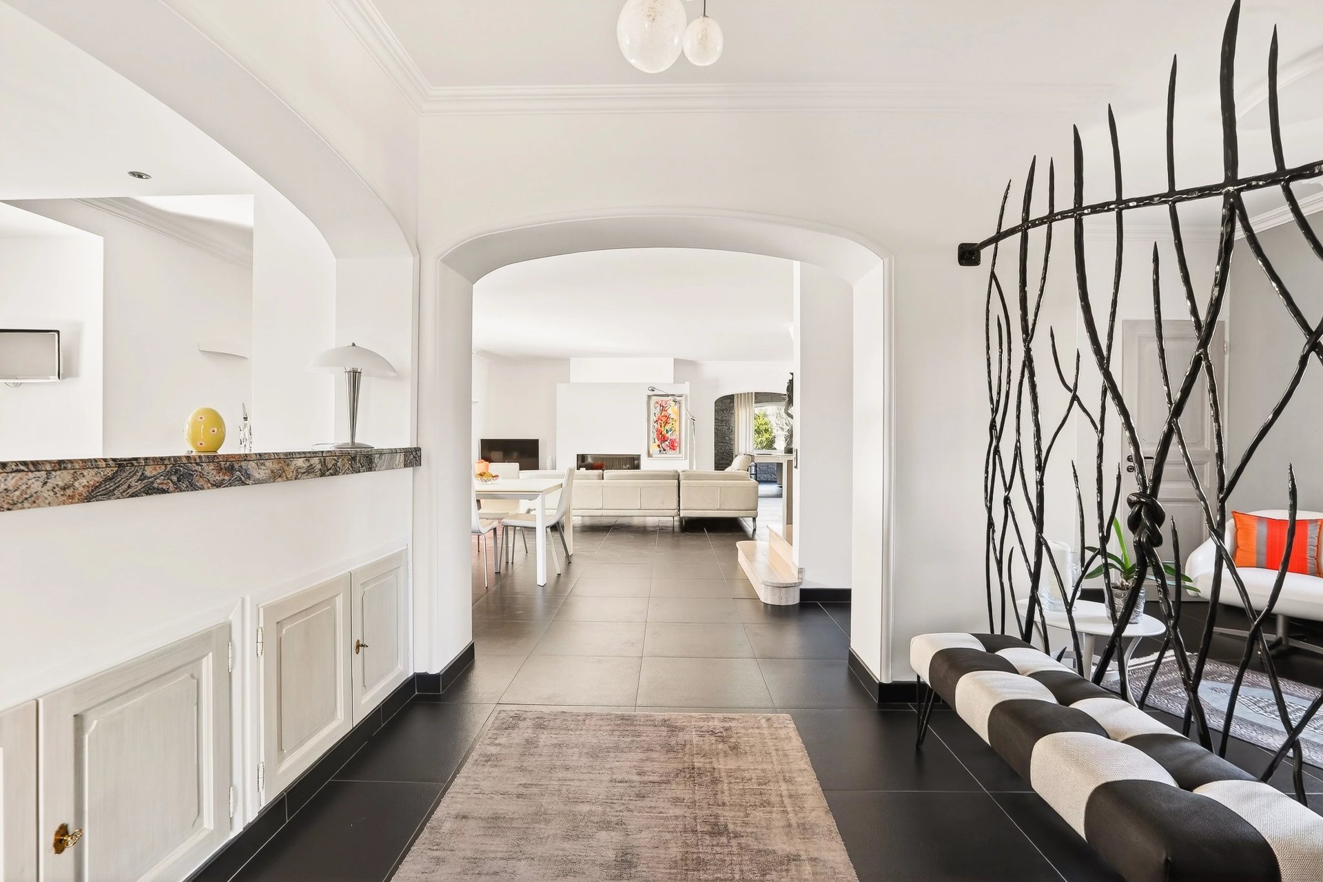 From the entrance, the house offers a warm and balanced atmosphere, with spacious and functional living areas. The living room, enhanced by a fireplace, extends into a billiard area, creating a friendly space, while the spacious kitchen seamlessly integrates into the whole.