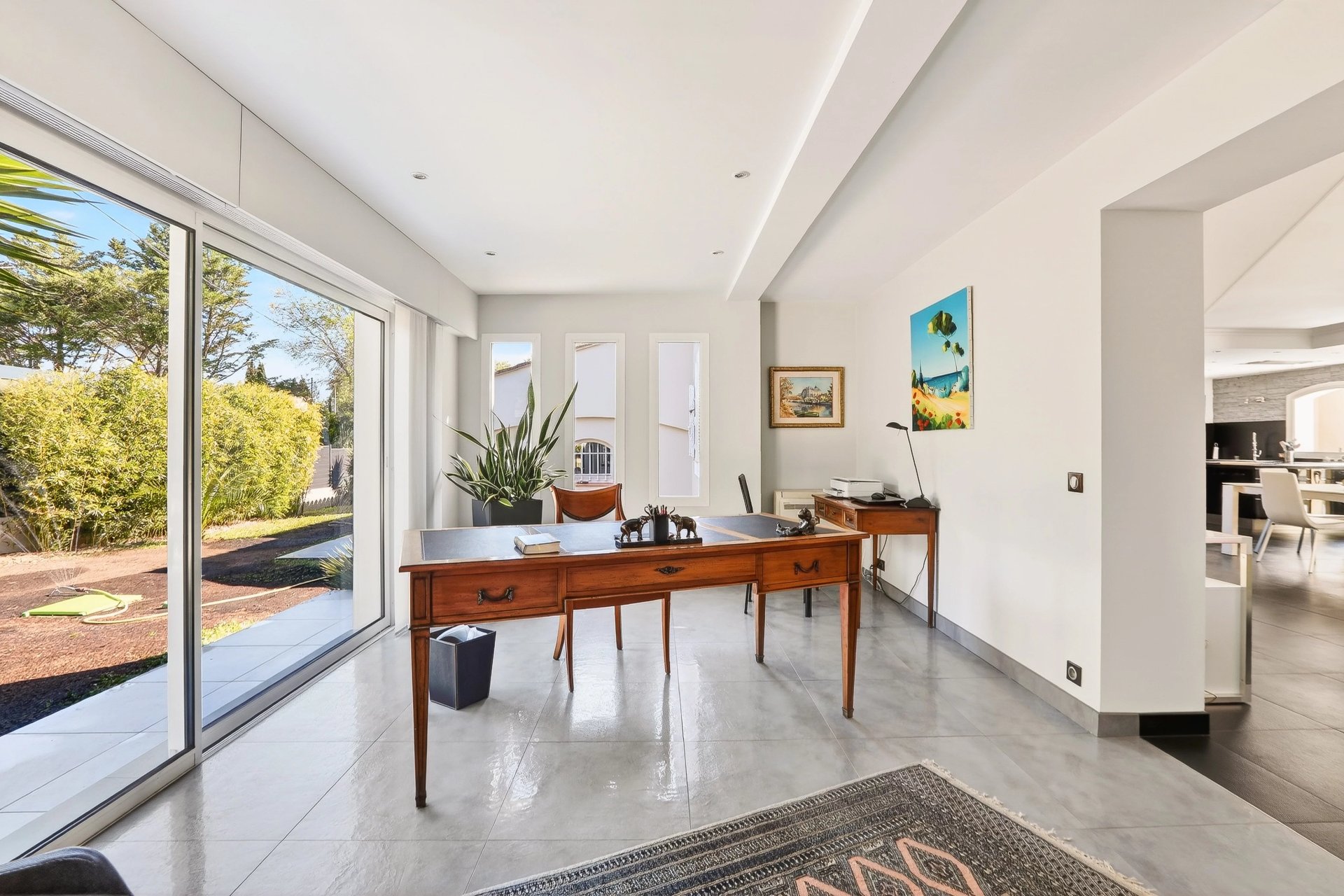 Mainly single-story, the villa also features a large office, easily convertible into an additional bedroom with an en-suite shower room, as well as a bedroom with a private bathroom.