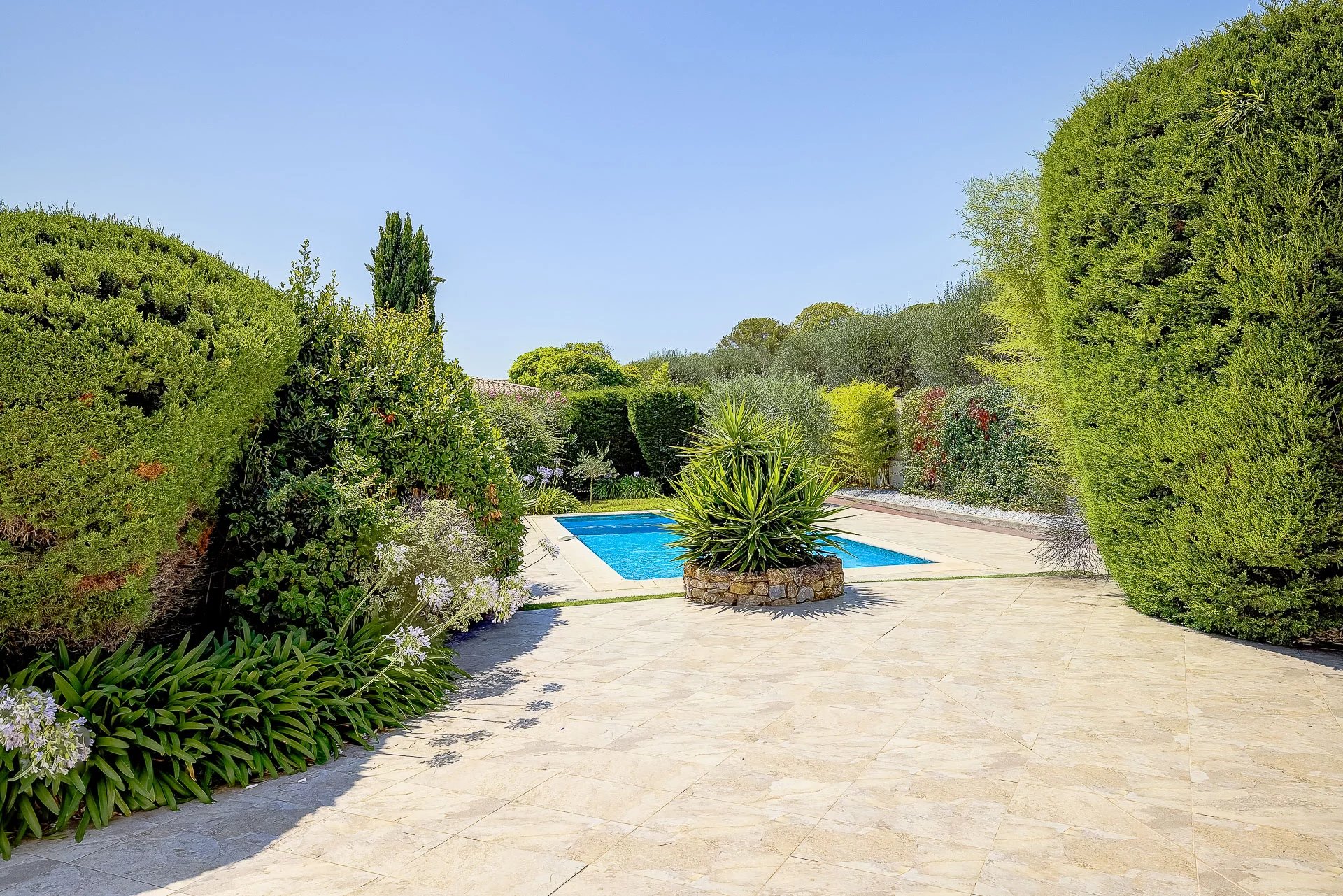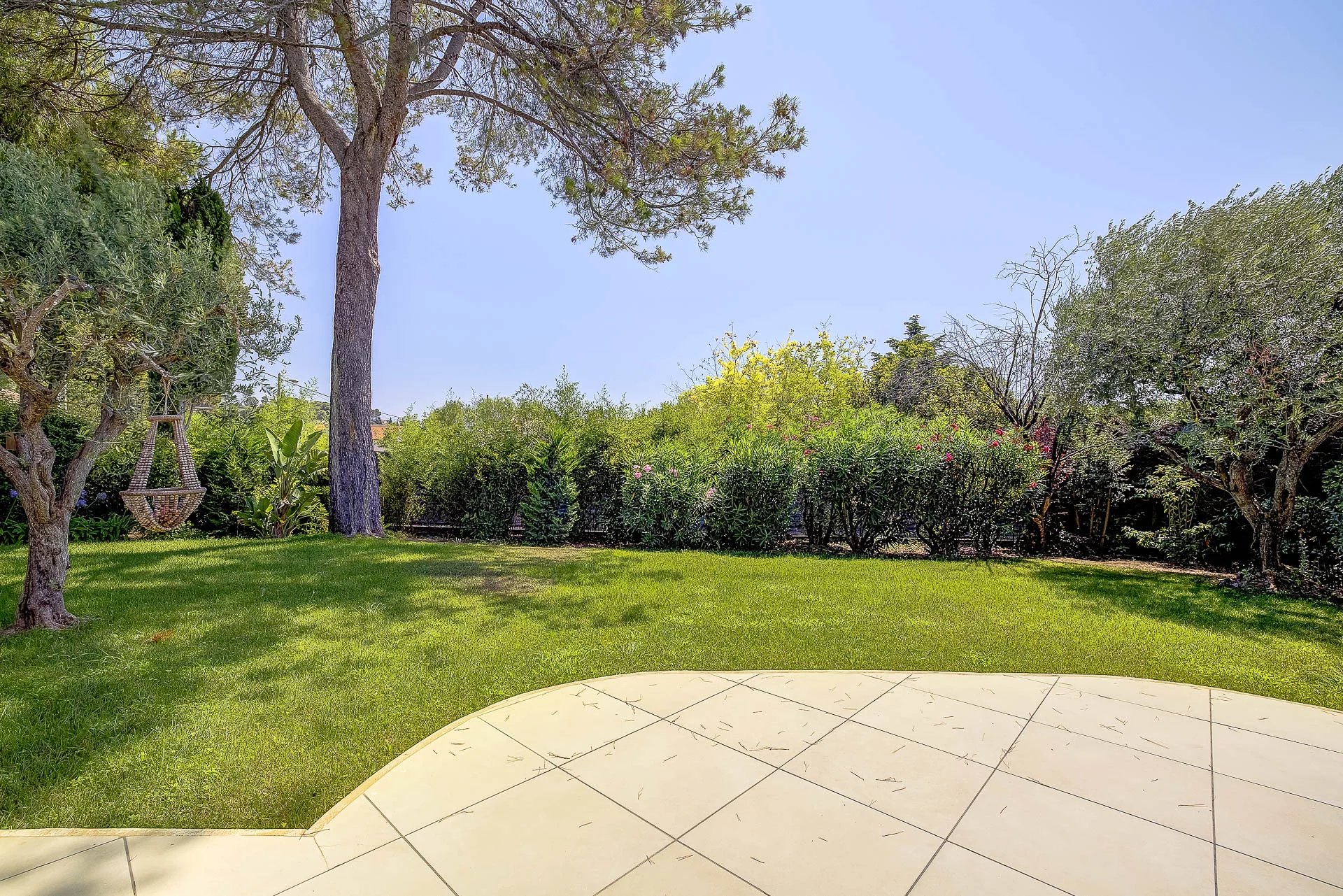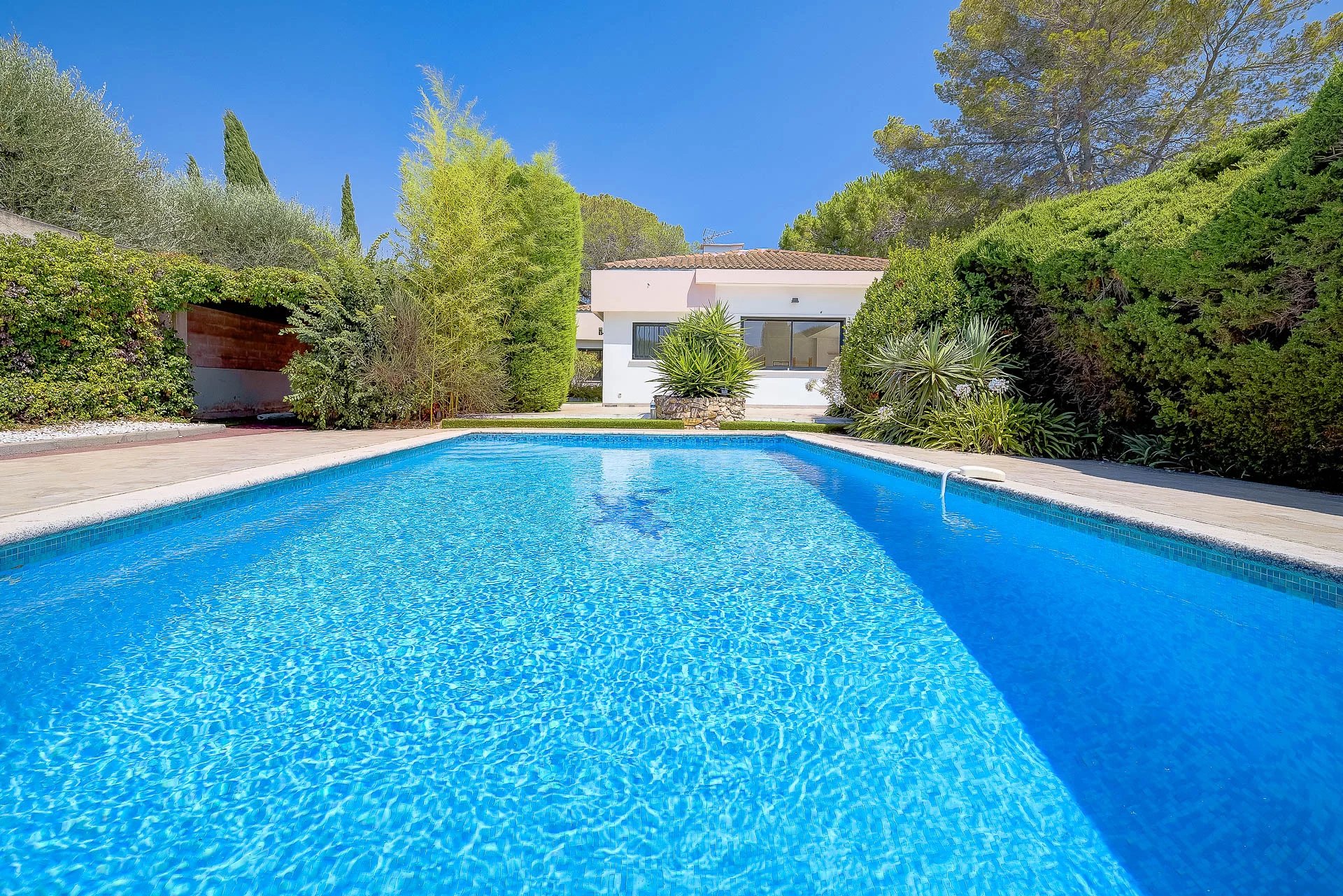 The flat land with approximately 1400 m2 of surface offers on one side, its garden with a multitude of Mediterranean species, pleasantly shaded, and on the other – its swimming pool facing south.
