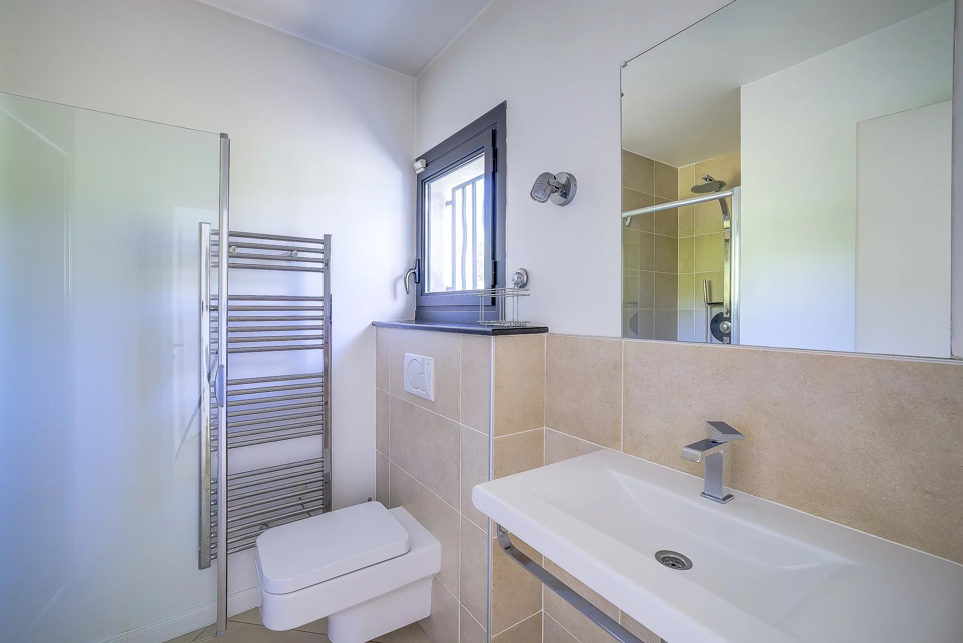 With its living area of approximately 163 m2, it is composed as follows: entrance, large living room with bay windows opening onto the garden, open kitchen, laundry room, 3 bedrooms, each with its own bathroom or shower/WC. The house, perfectly equipped – air conditioning, alarm, centralized home automation, etc. – is very easy and pleasant to live.