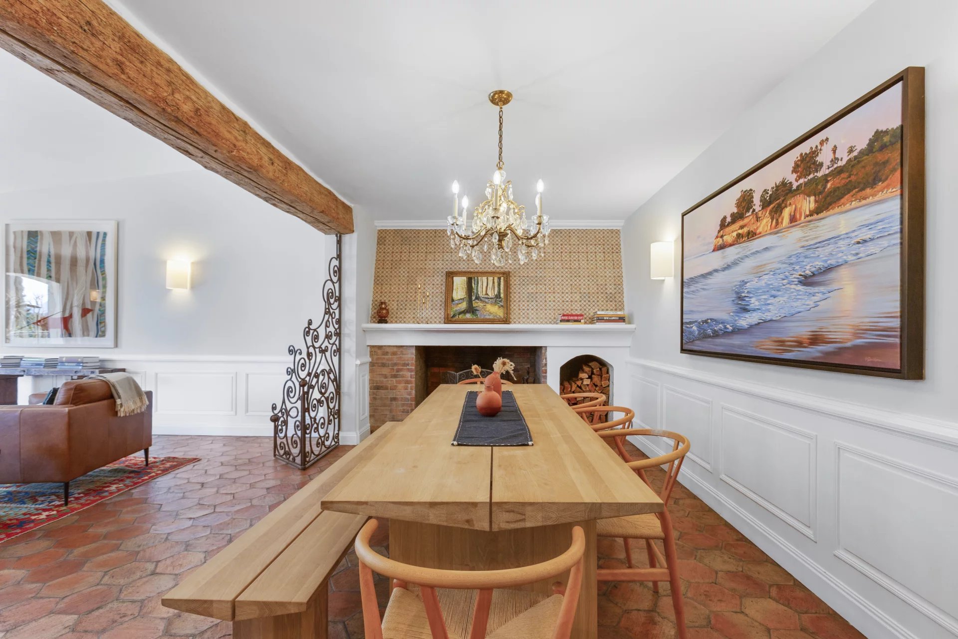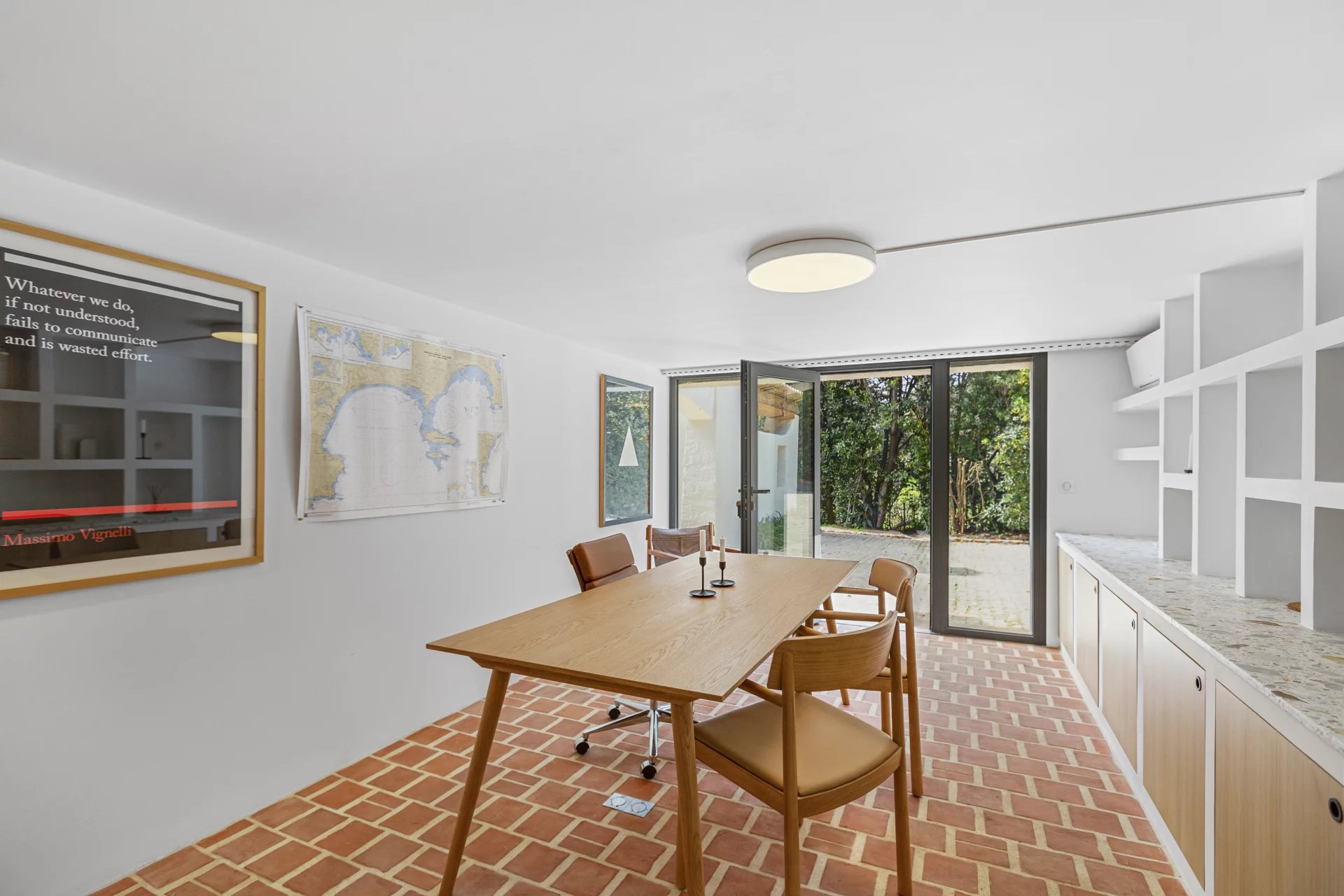 The blend of contemporary and traditional makes the large living space both cosy and luminous. An inviting living room and dining room with fireplace sits next to a modern and bright kitchen with breakfast nook and access to the south facing dining terrace.