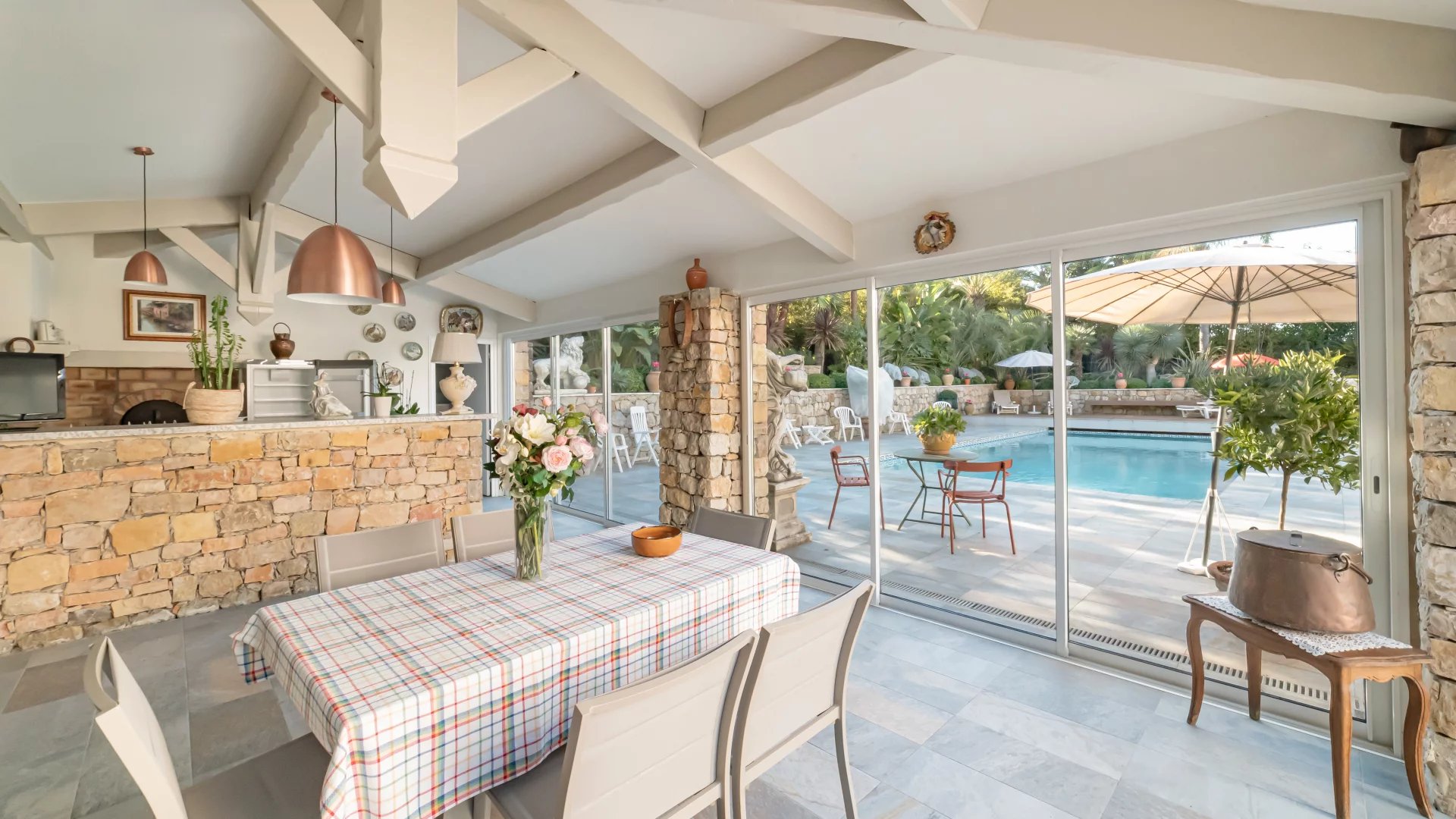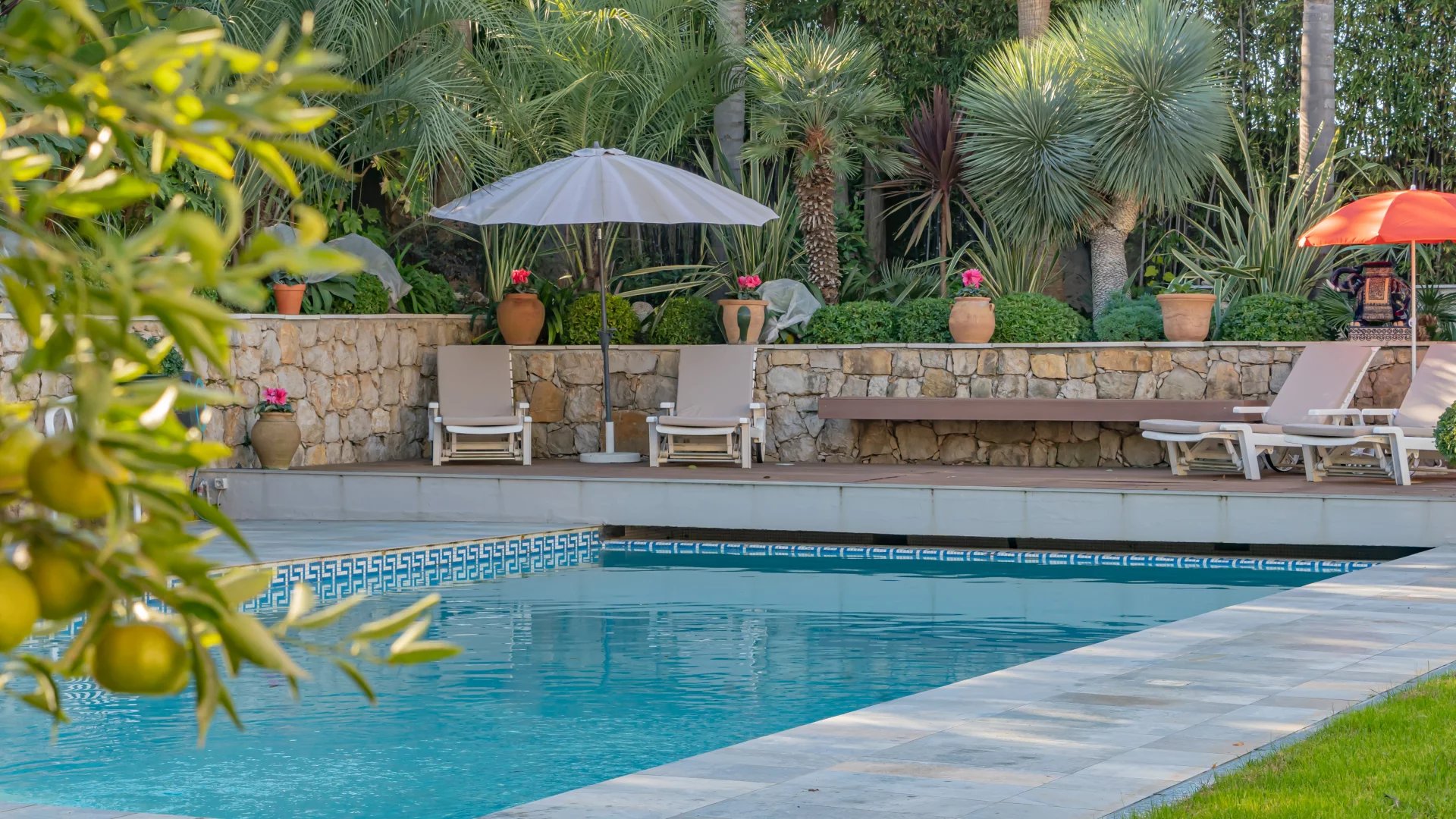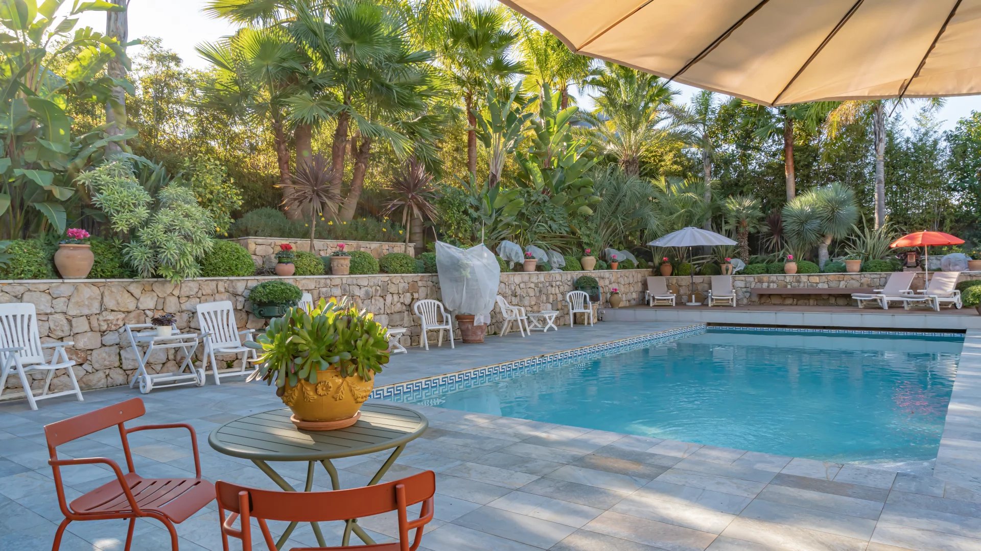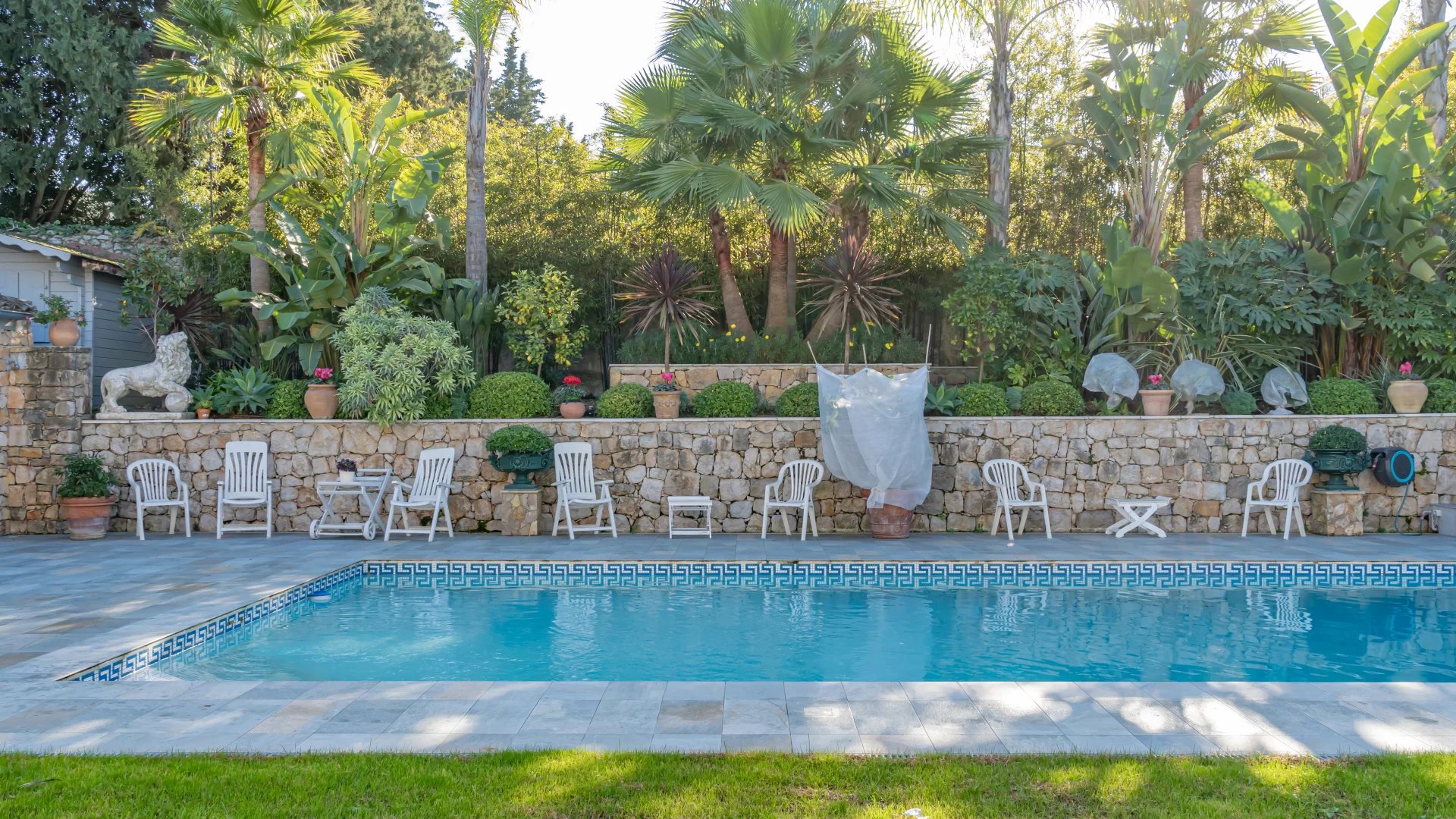 The 1,650 m2 Mediterranean-style park features a stunning heated pool (11.5 x 5.5 meters) with an electric cover for optimal safety, as well as two garden sheds.