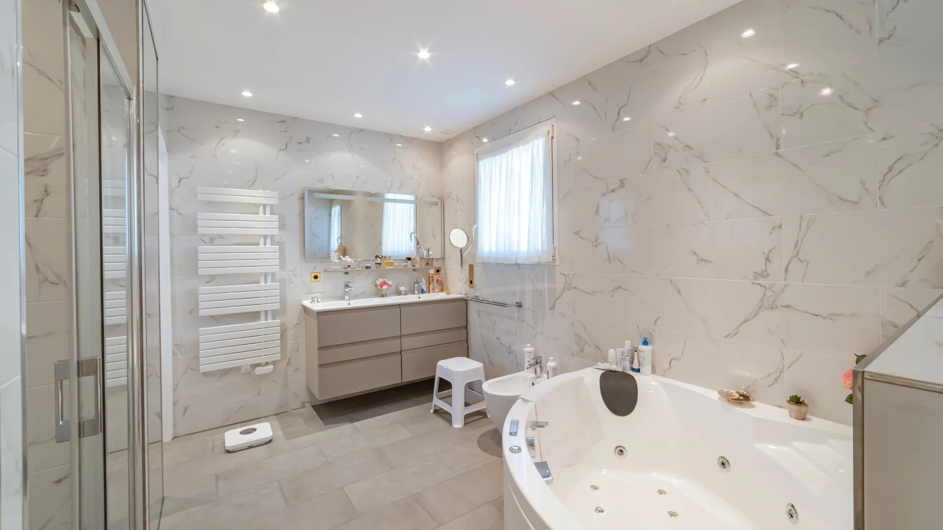 On the upper floor, two additional suites, along with a large dressing area, offer direct access to a very large terrace with views over the garden.