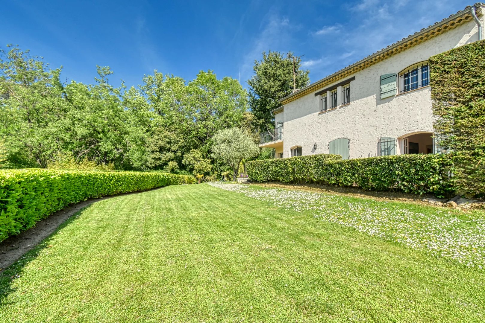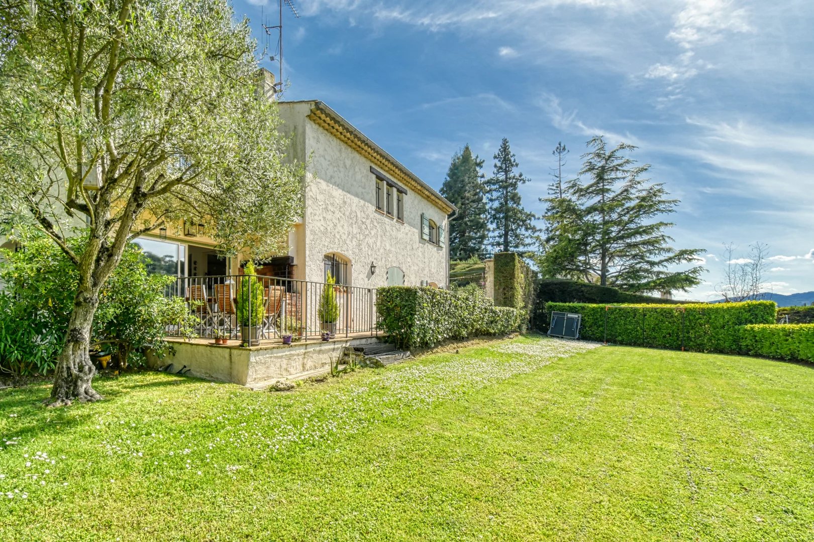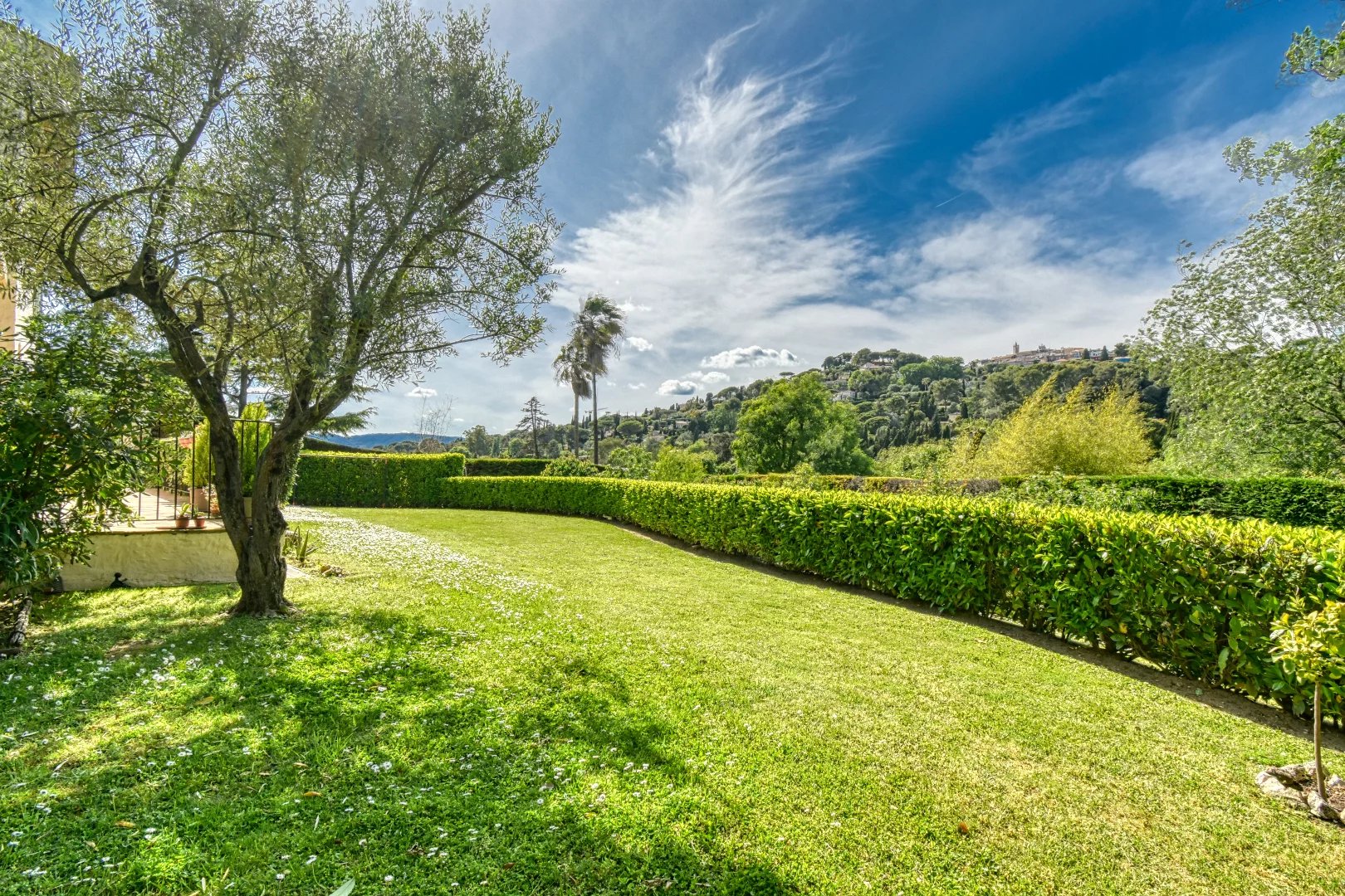 Charming villa of 180 m2 built upon a superb a flat fully landscaped plot dotted with large lawns, olive trees and other Mediterranean essences of 2016 m2 with a magnificent view of the old village of Mougins, situated in a private and closed estate.
