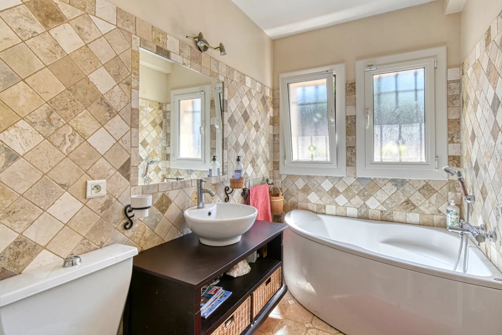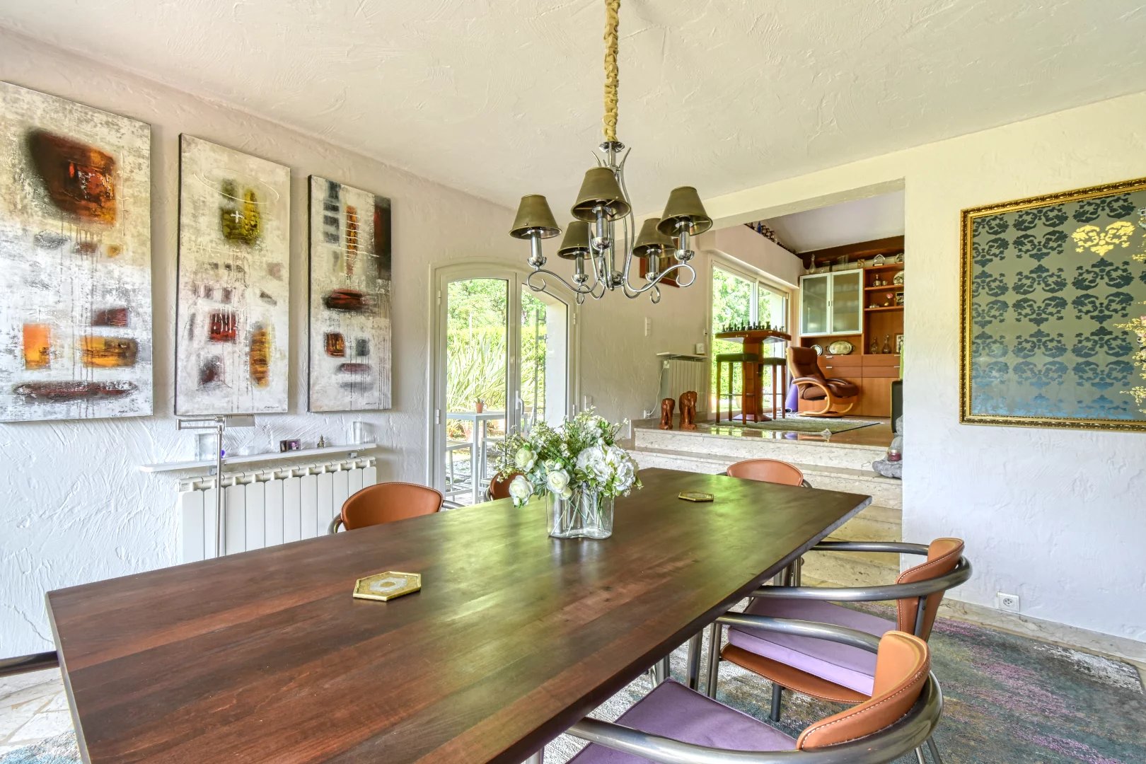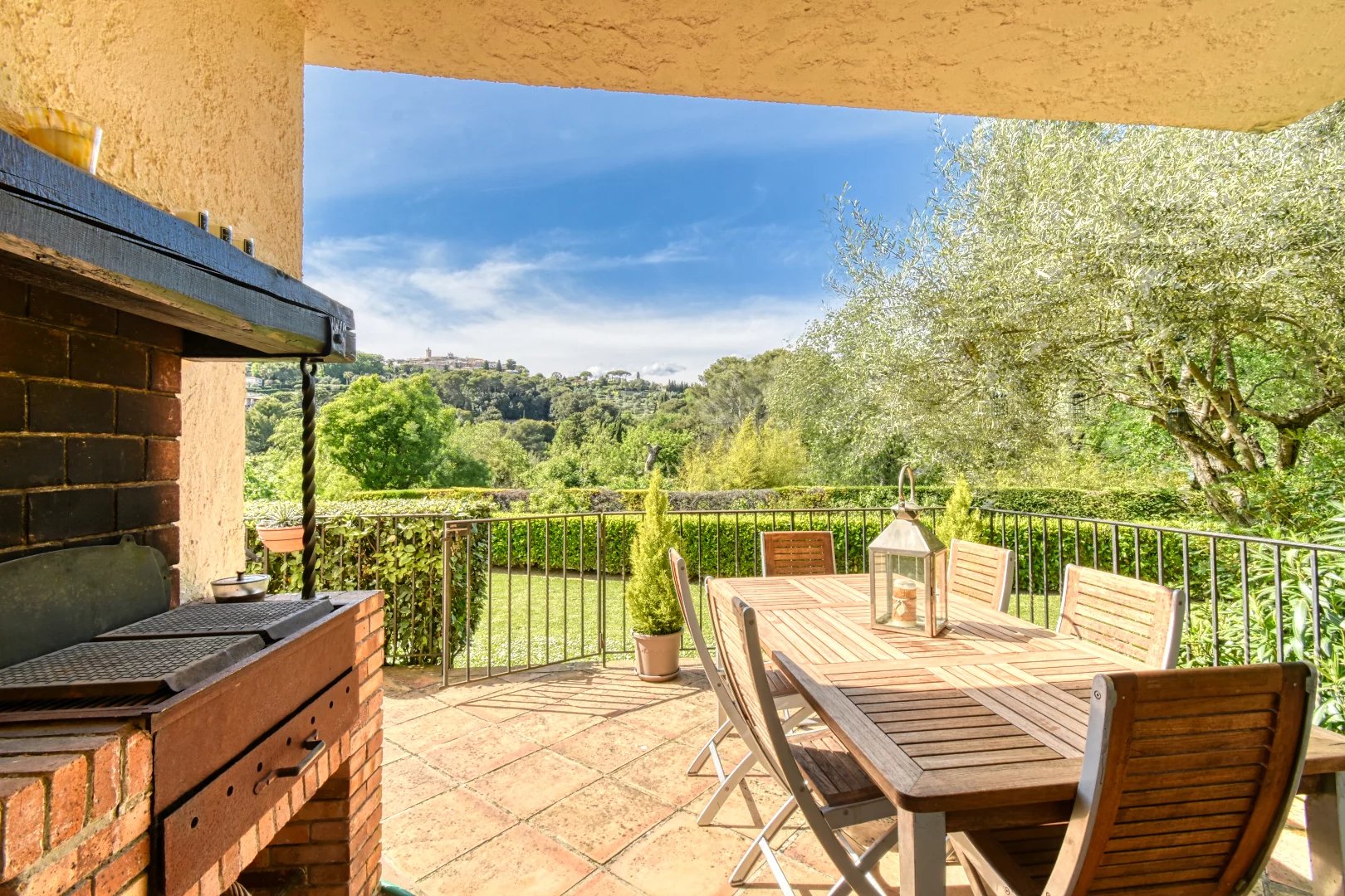 Charming villa of 180 m2 built upon a superb a flat fully landscaped plot dotted with large lawns, olive trees and other Mediterranean essences of 2016 m2 with a magnificent view of the old village of Mougins, situated in a private and closed estate.