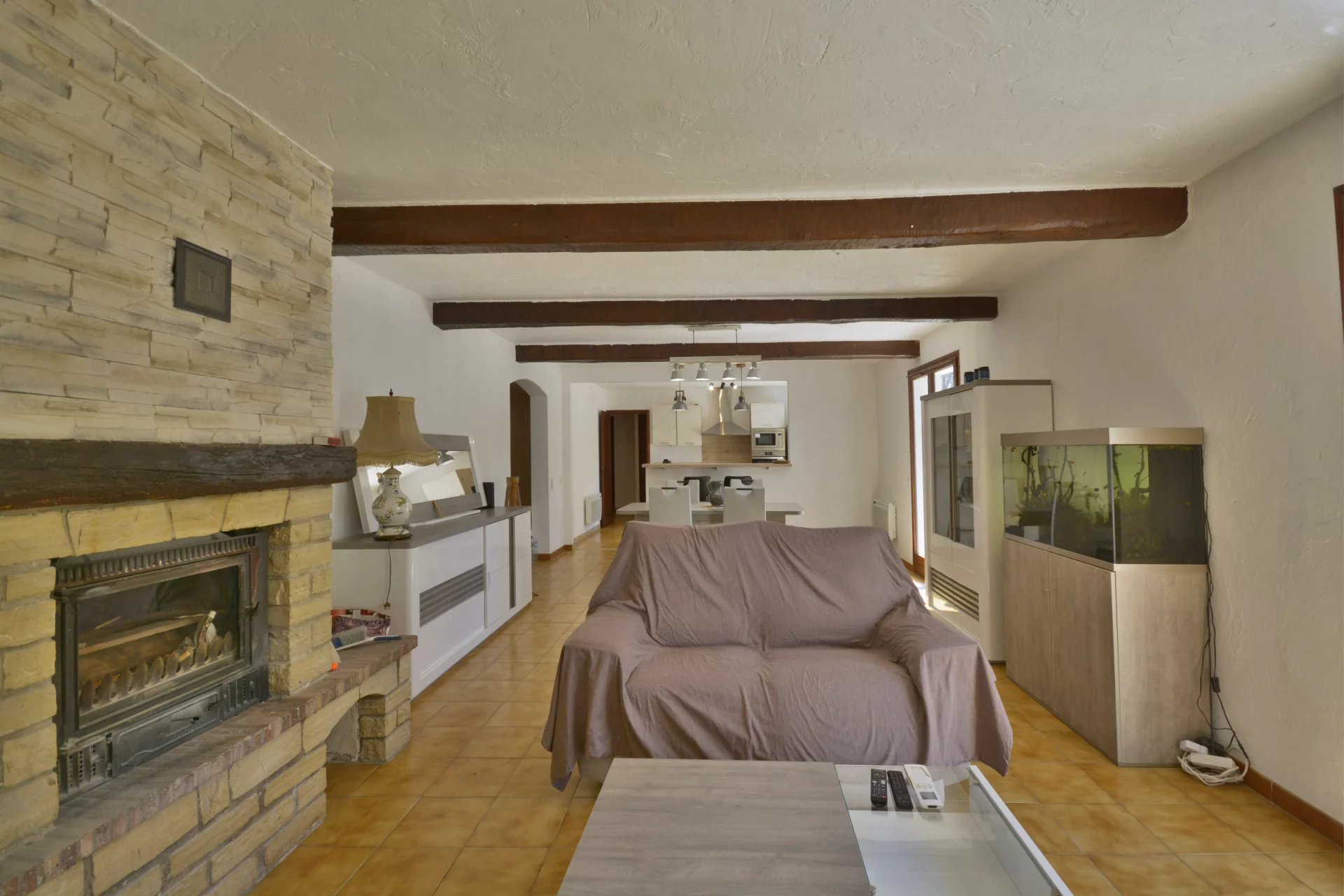 – Bright and spacious living/dining room with fireplace, opening onto the garden