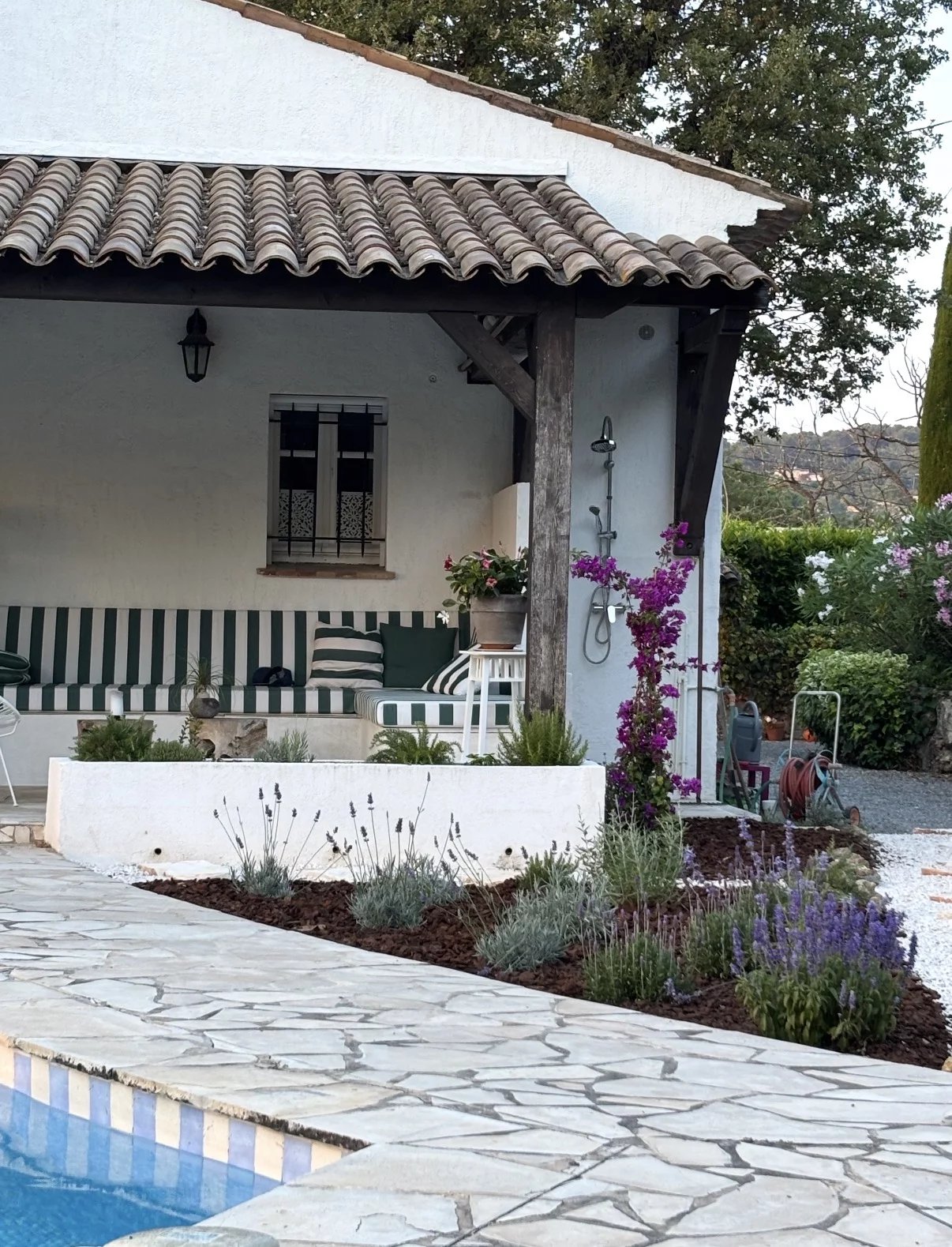 Outside area is covered and has a BBQ place + sofa lounge. Evening sun until the last ray alongside the pool.