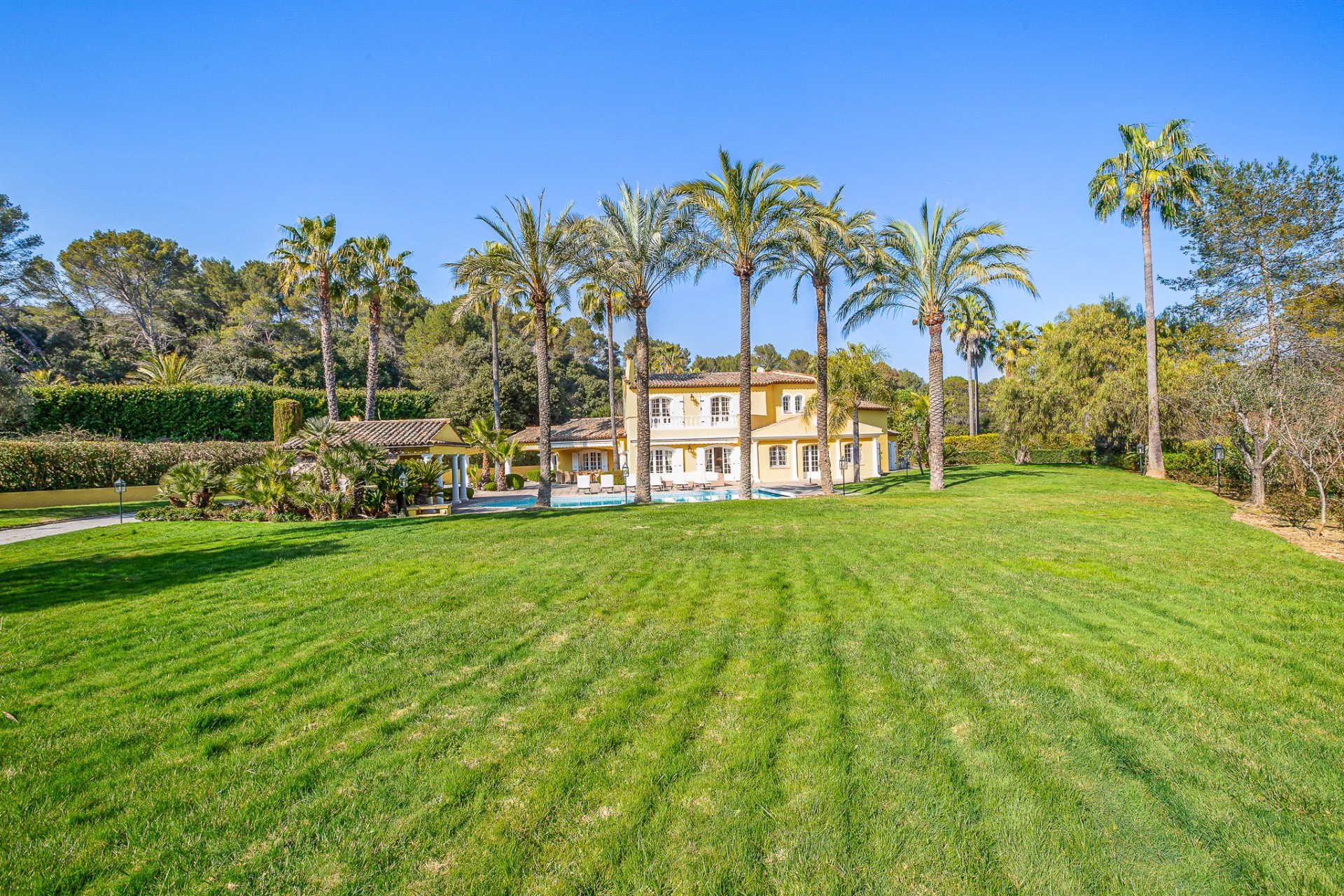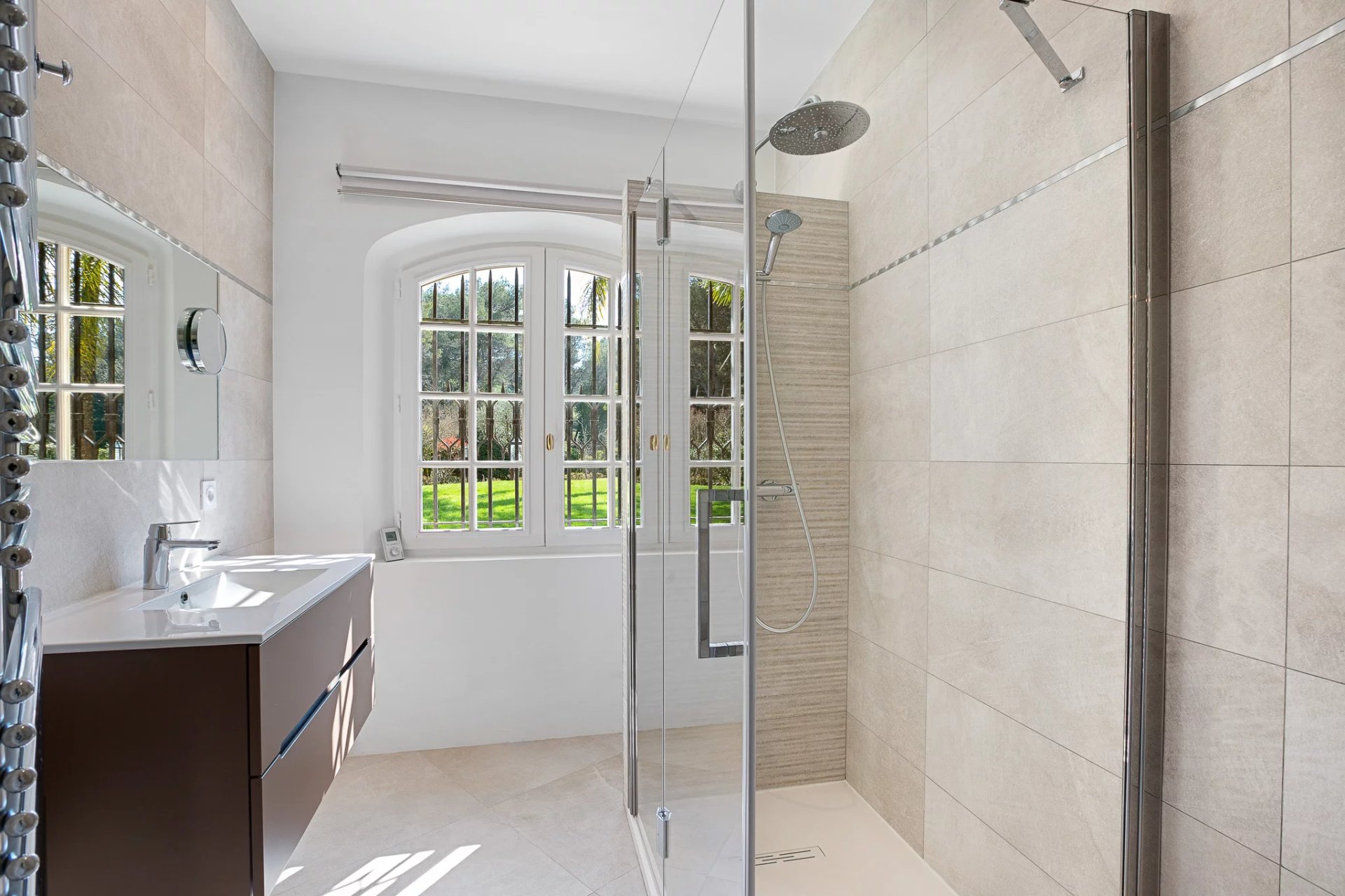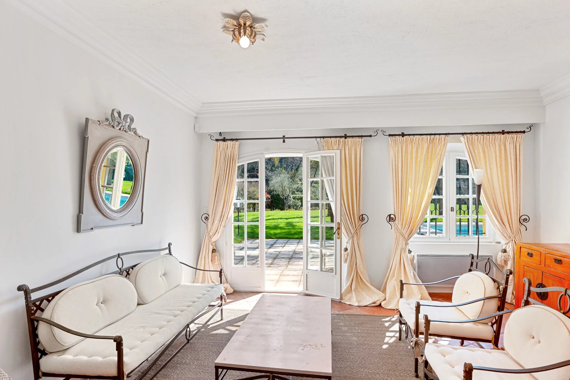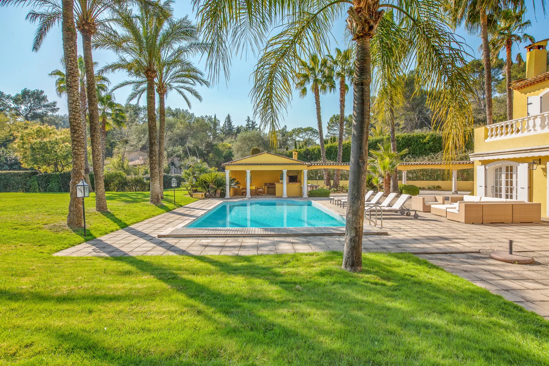 Located in a sought-after, secure neighborhood just minutes from Mougins village, this stunning quality villa offers over 270 m2 of living space (excluding annexes and basement) and is set on a private, enclosed plot of approximately 3000 m2, without any overlooking neighbors.