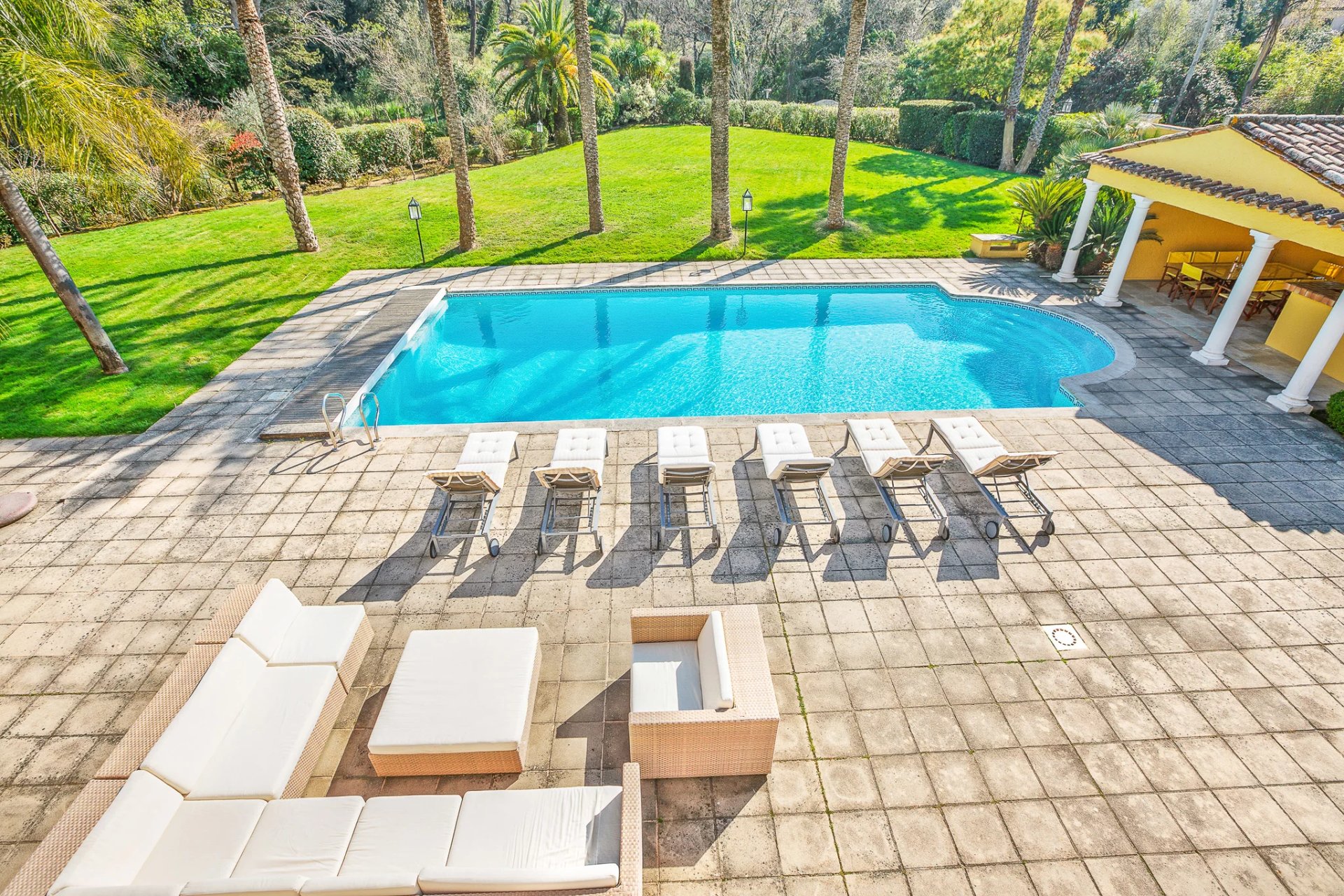 By the pool, a pool house with a kitchenette and barbecue area offers a perfect setting for hosting guests in a peaceful and pleasant environment. At the back of the villa, there is a closed garage and plenty of parking spaces.