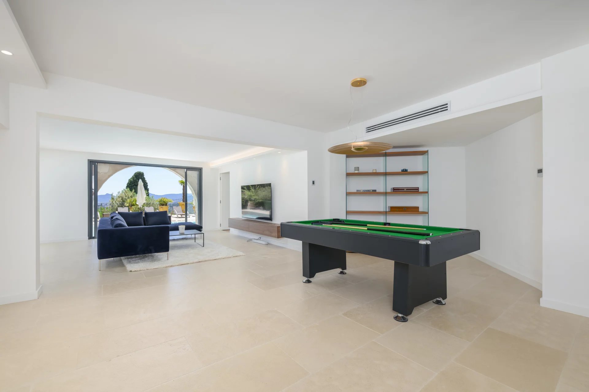 The garden level reveals the Riviera spirit in all its generosity: a vast space dedicated to pleasure and relaxation, with a bar, billiards table, TV lounge and direct access to the pool. The pool house extends this summery atmosphere, inviting you to enjoy outdoor moments over a meal, a barbecue or a game of petanque.