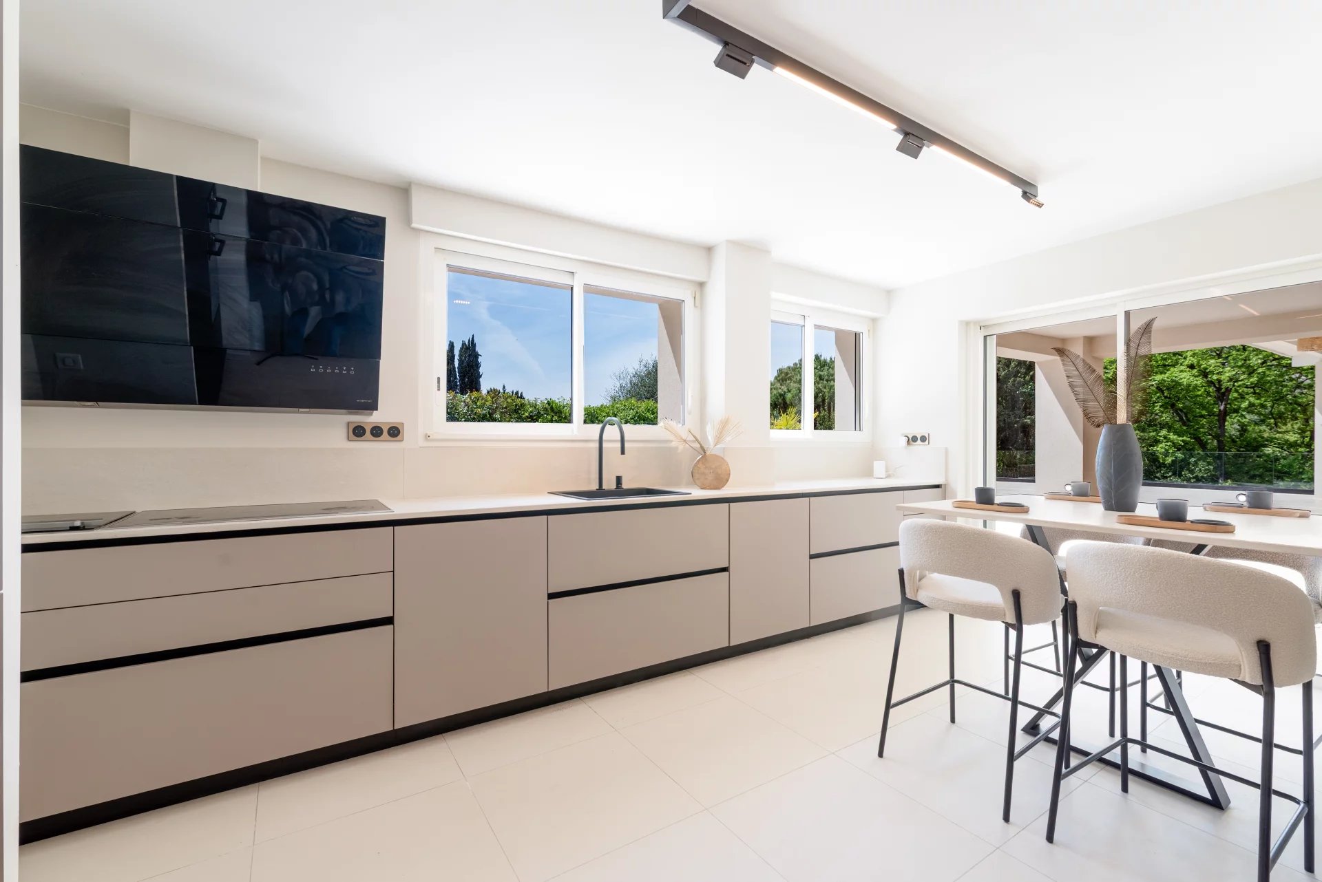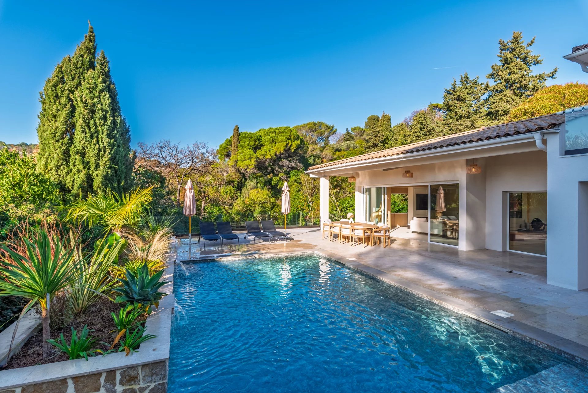 Exceptional location, in peace and quiet, walking distance from all amenities of Val de Mougins, for this magnificent renovated villa with refined decoration enjoying a panoramic view of the surrounding hills.
