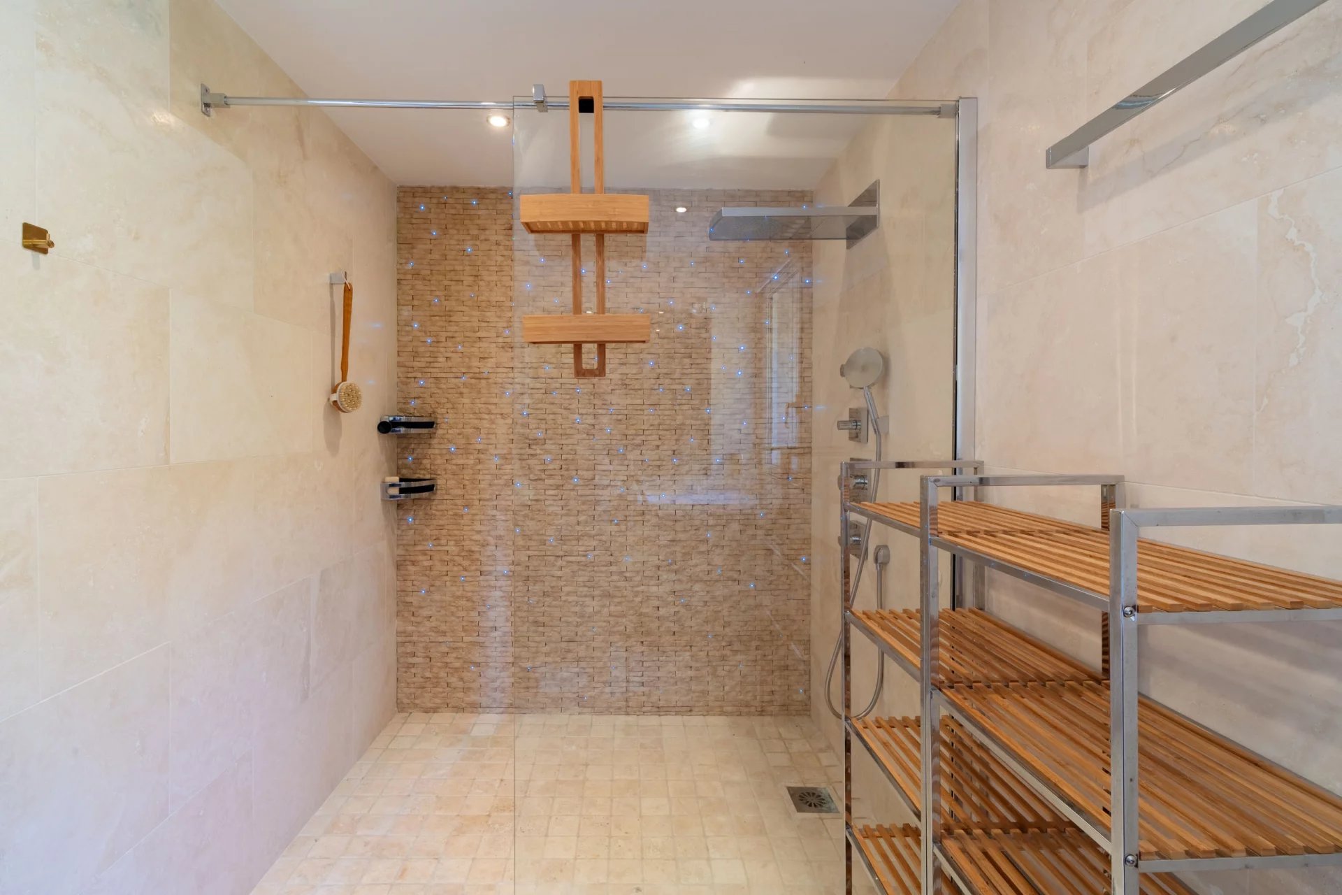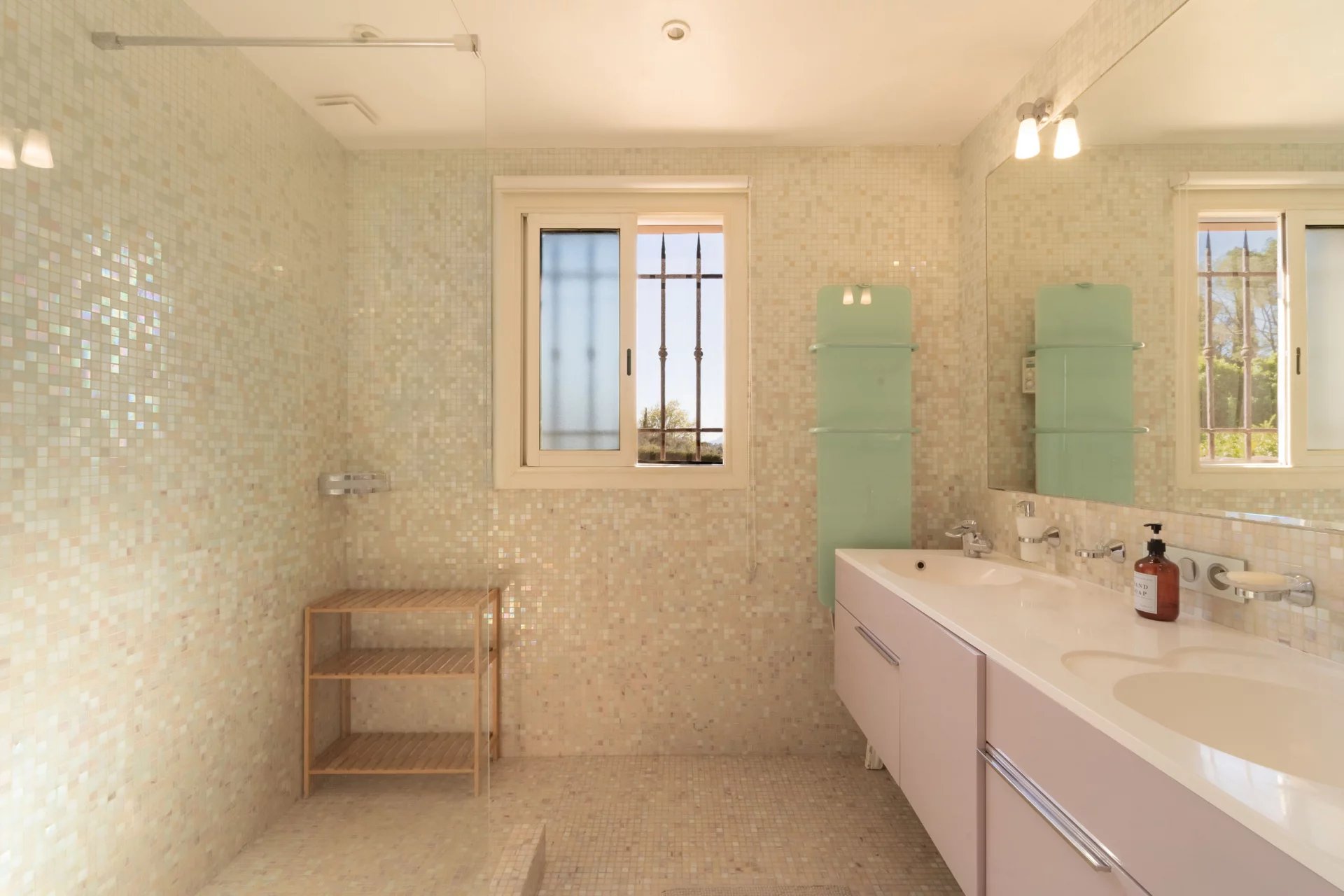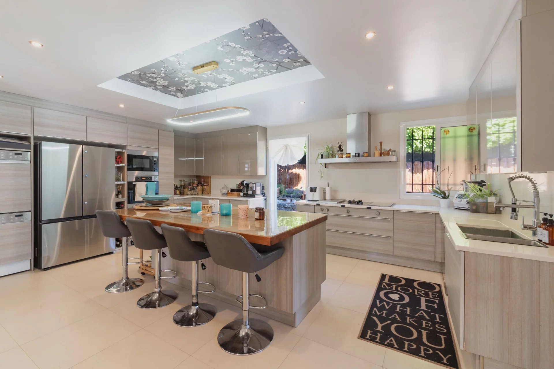 Set over two levels, the villa impresses with its harmonious volumes and fluid layout. The garden level features a bright reception area comprising a living room with fireplace and an open-plan kitchen, all seamlessly opening onto terraces and the garden. A master suite on this level ensures comfort and privacy.