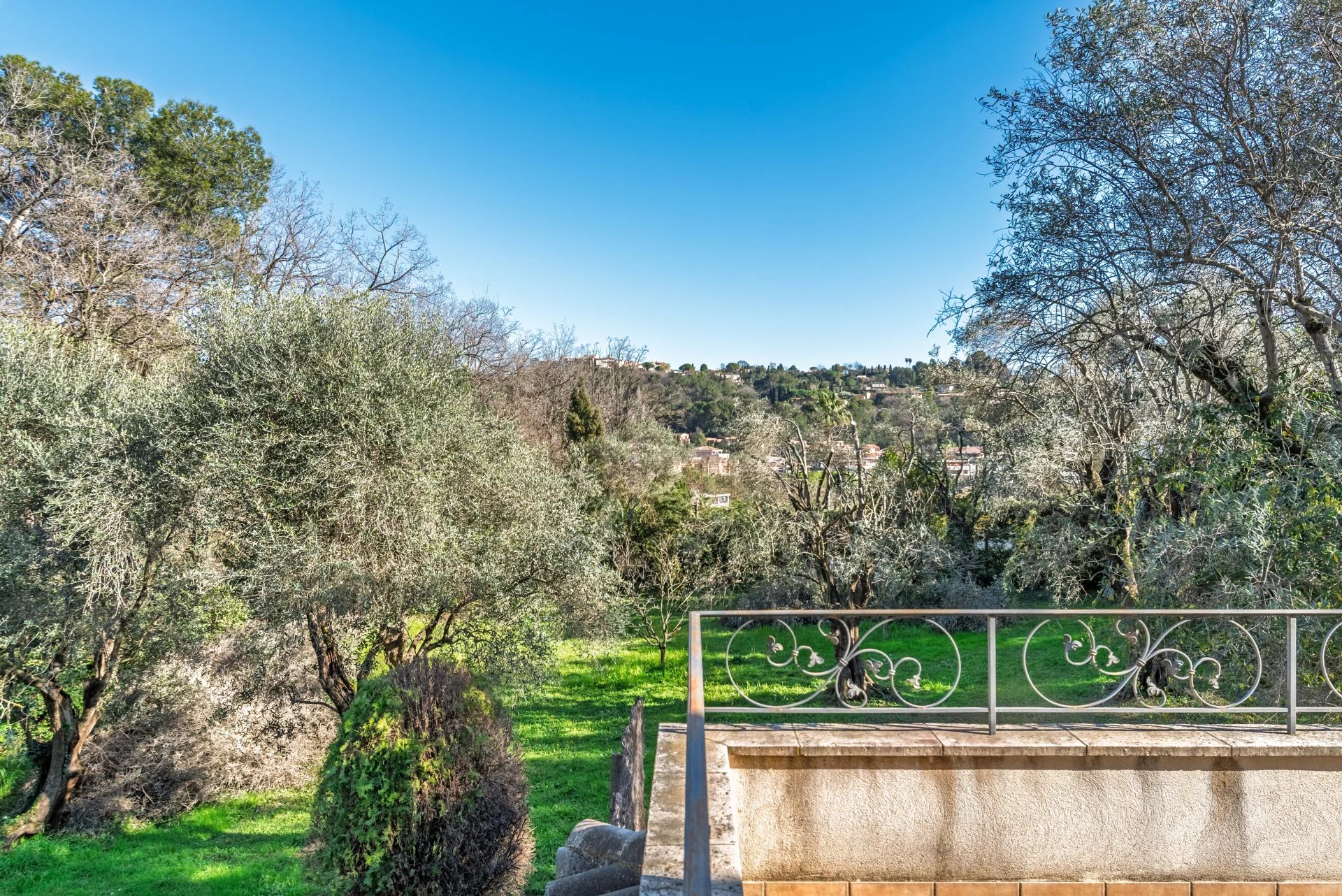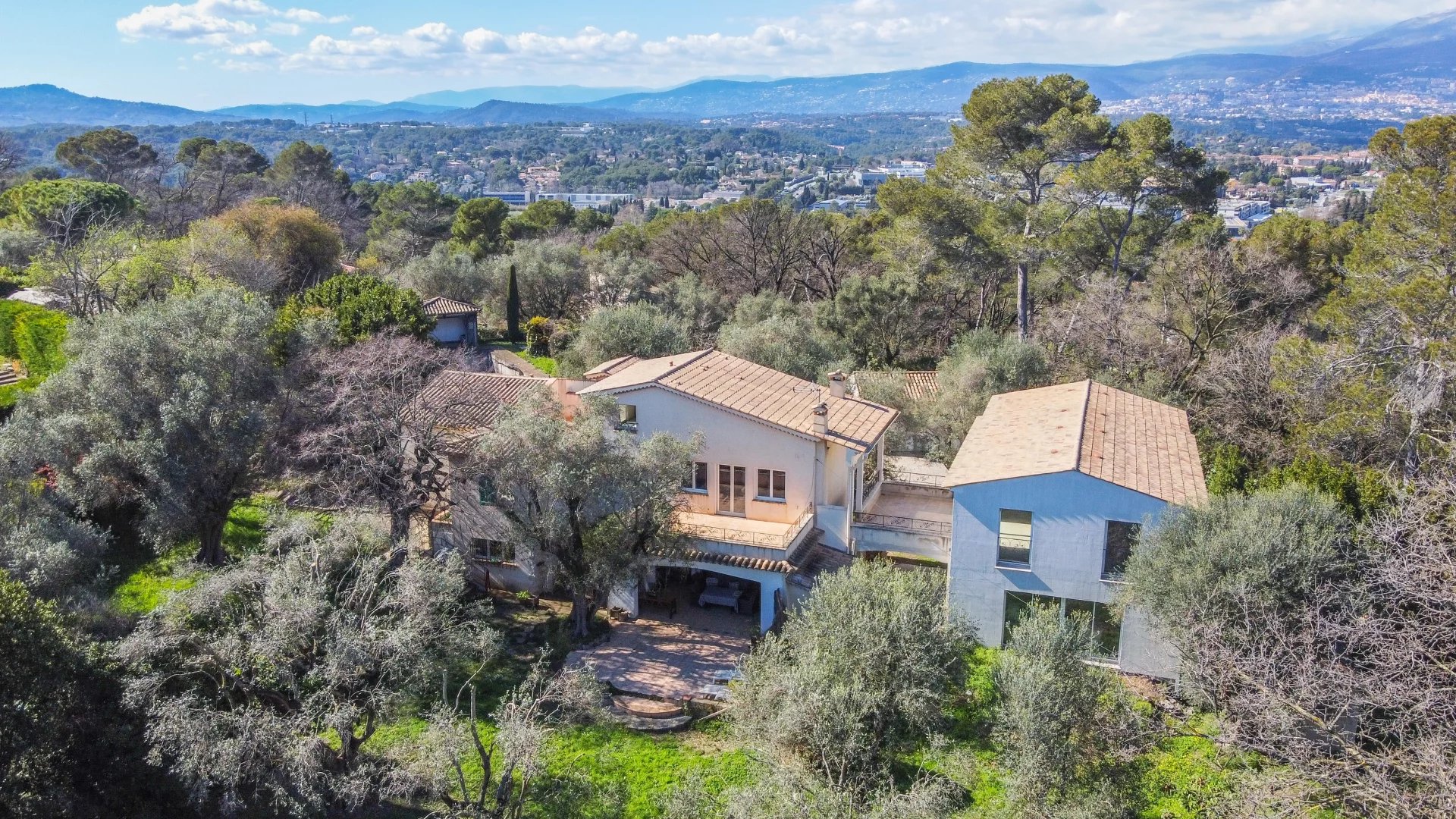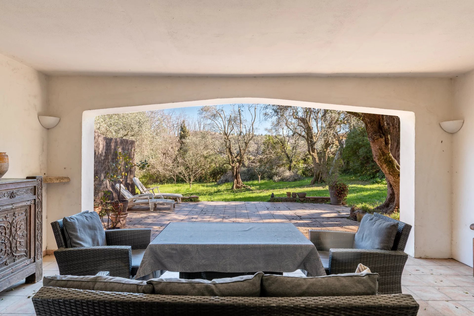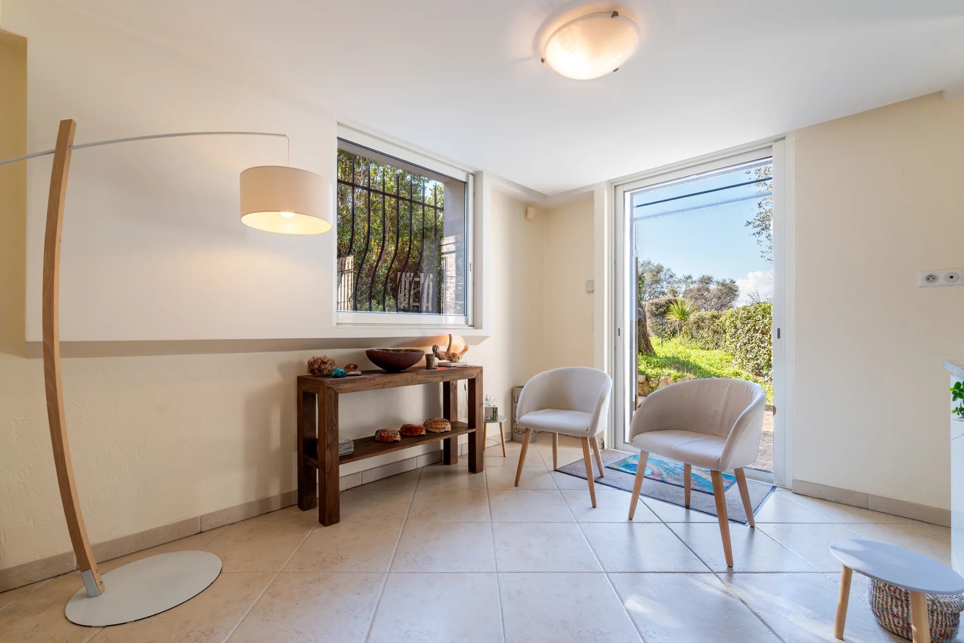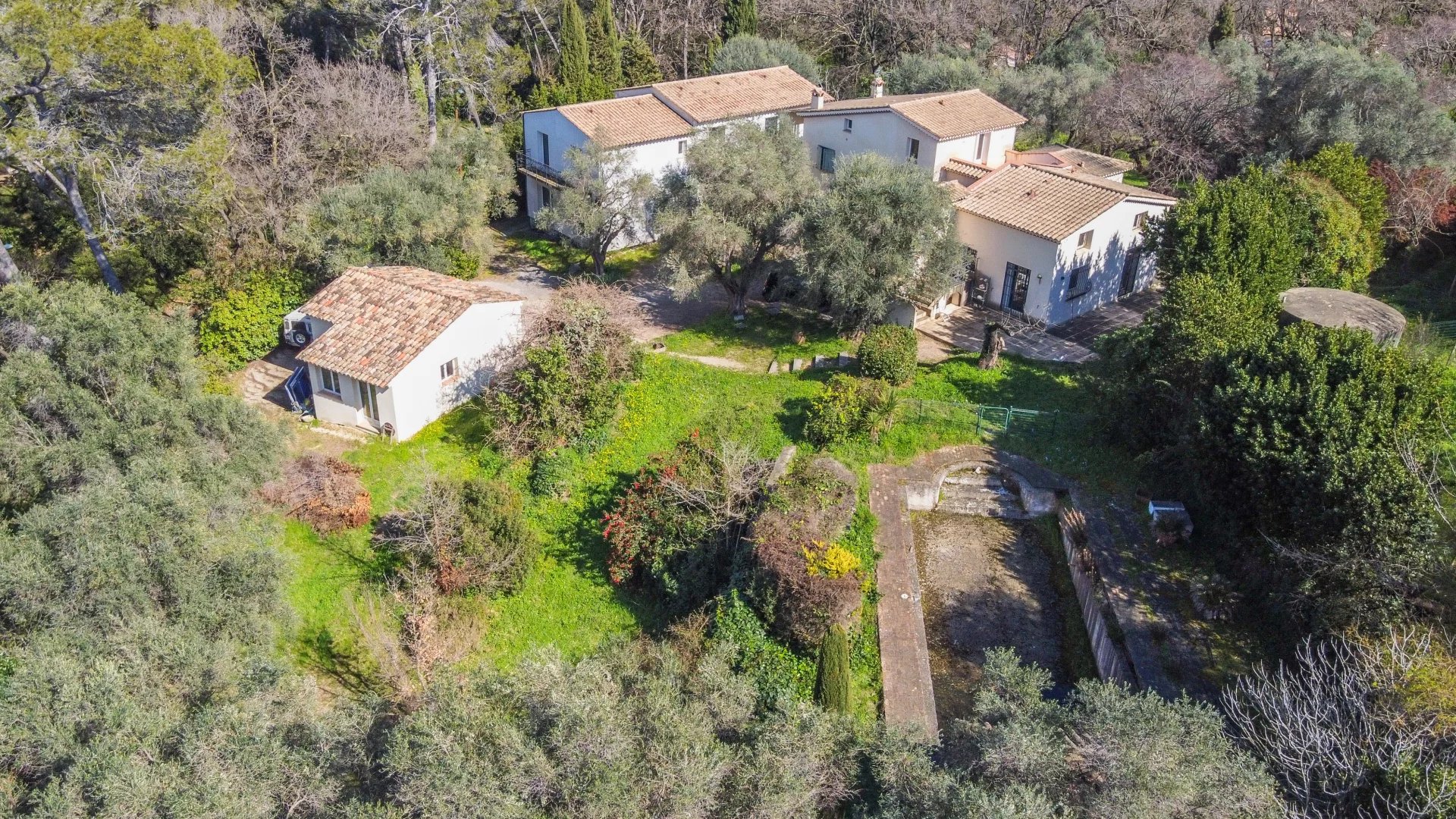 The main residence includes a spacious entrance hall, a bright living room opening onto a south-facing terrace and a beautifully wooded garden, an independent kitchen, and a ground-floor bedroom with en-suite shower room. An adjoining studio-style space offers a living room with kitchen and two additional bedrooms – ideal for hosting guests or as a rental opportunity.