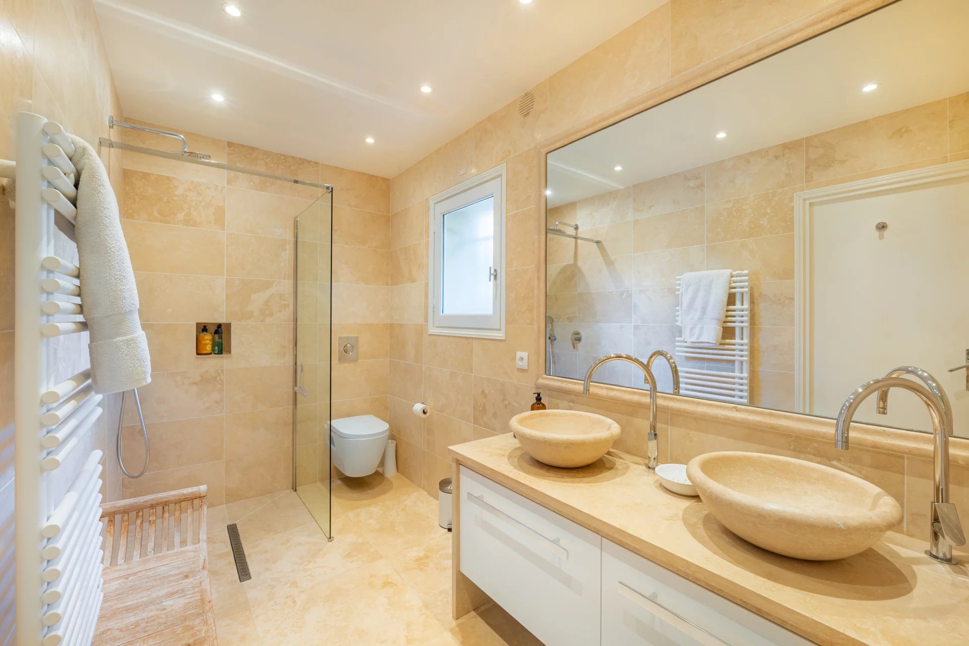 At the entrance level a beautiful hallway leads to the fully equipped open kitchen that joins the dining area and an exquisite salon with panoramic windows with a view over the bay of Cannes and the Esterel Mountains. You also find two of the bedrooms located on this floor with their own balconies or access to the terrace as well as a shared bathroom.
