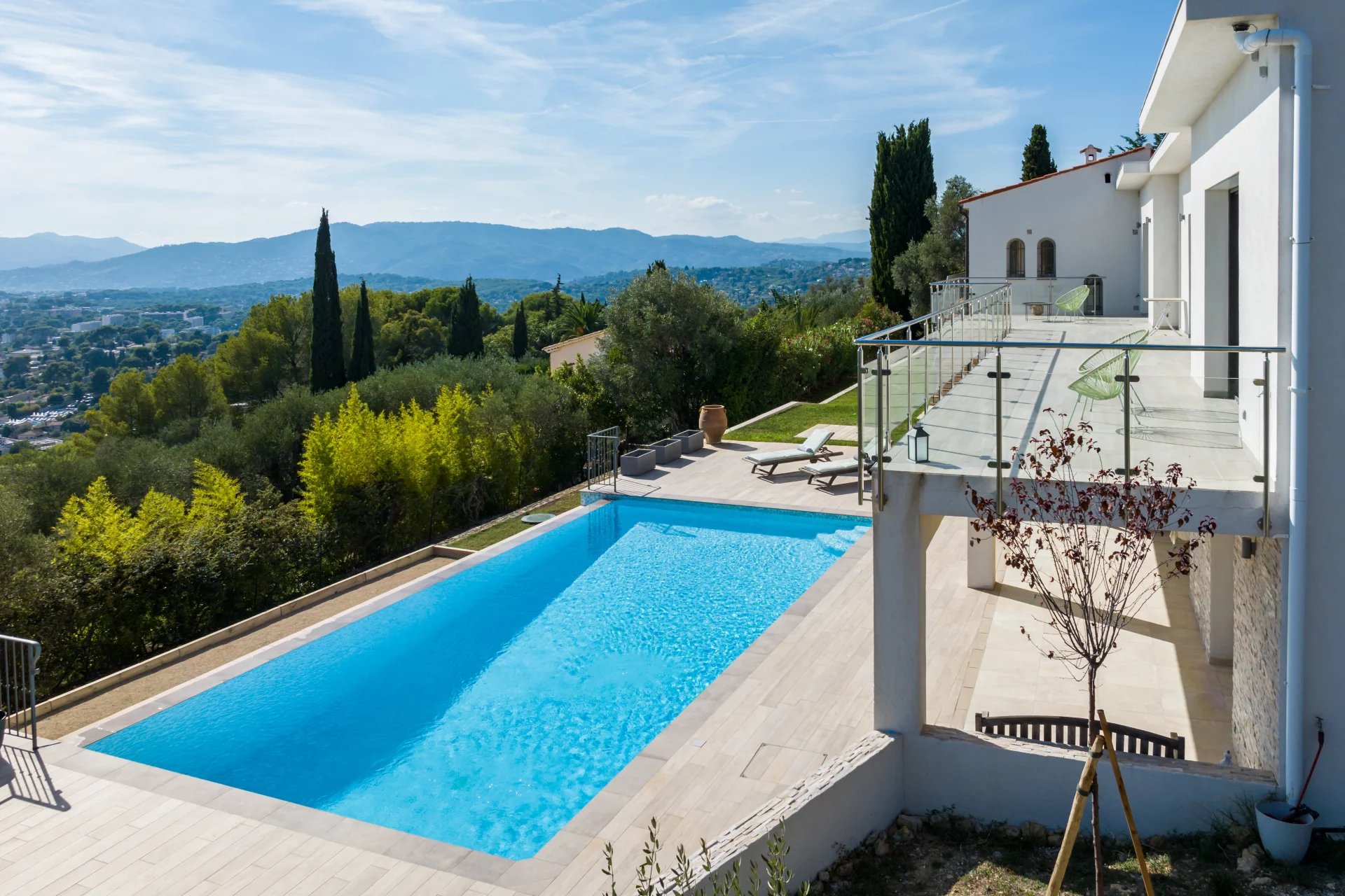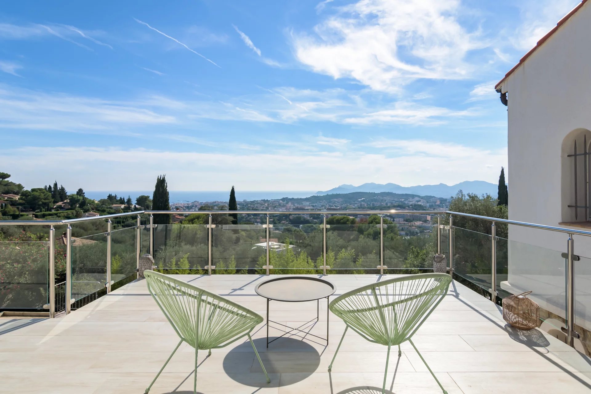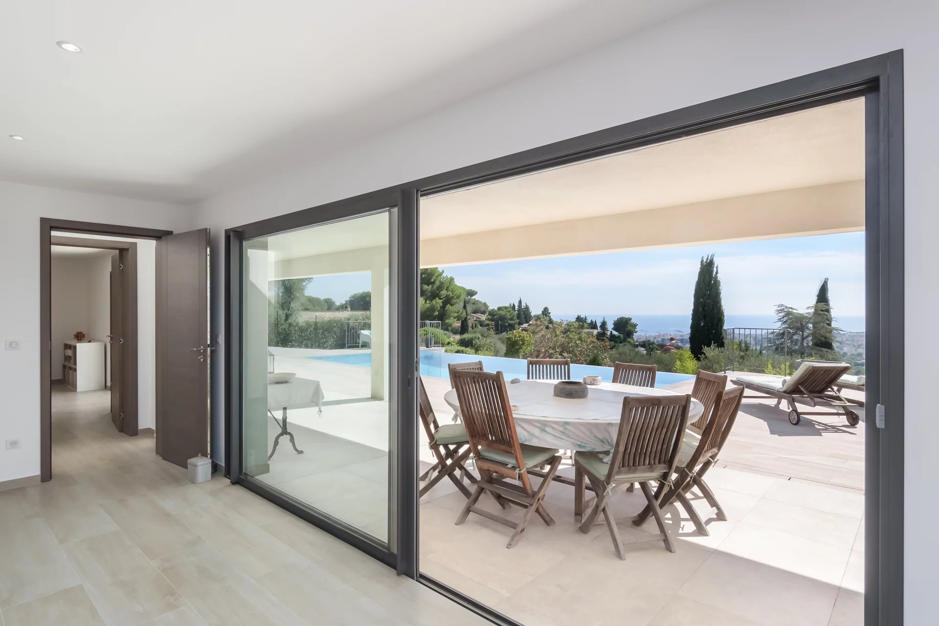 Nestled in the hills of Mougins, this stunning contemporary property bathed in natural light, offers panoramic views on Cannes and the sea.