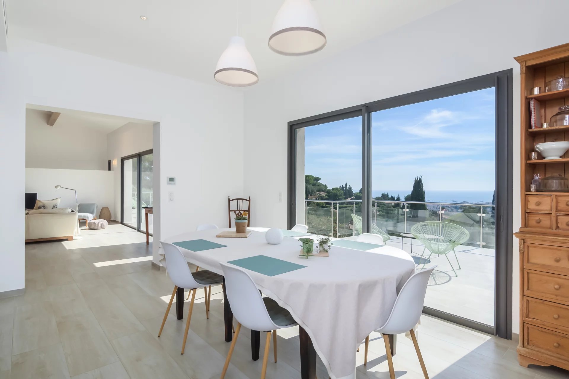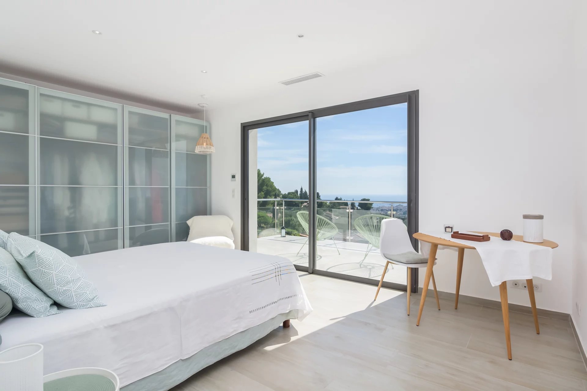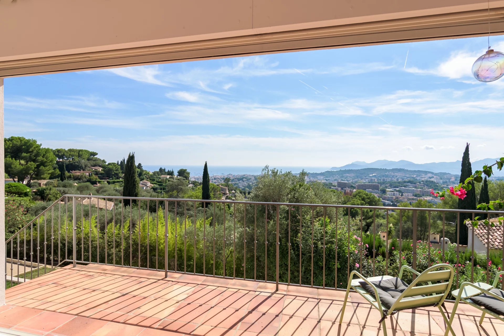 Nestled in the hills of Mougins, this stunning contemporary property bathed in natural light, offers panoramic views on Cannes and the sea.
