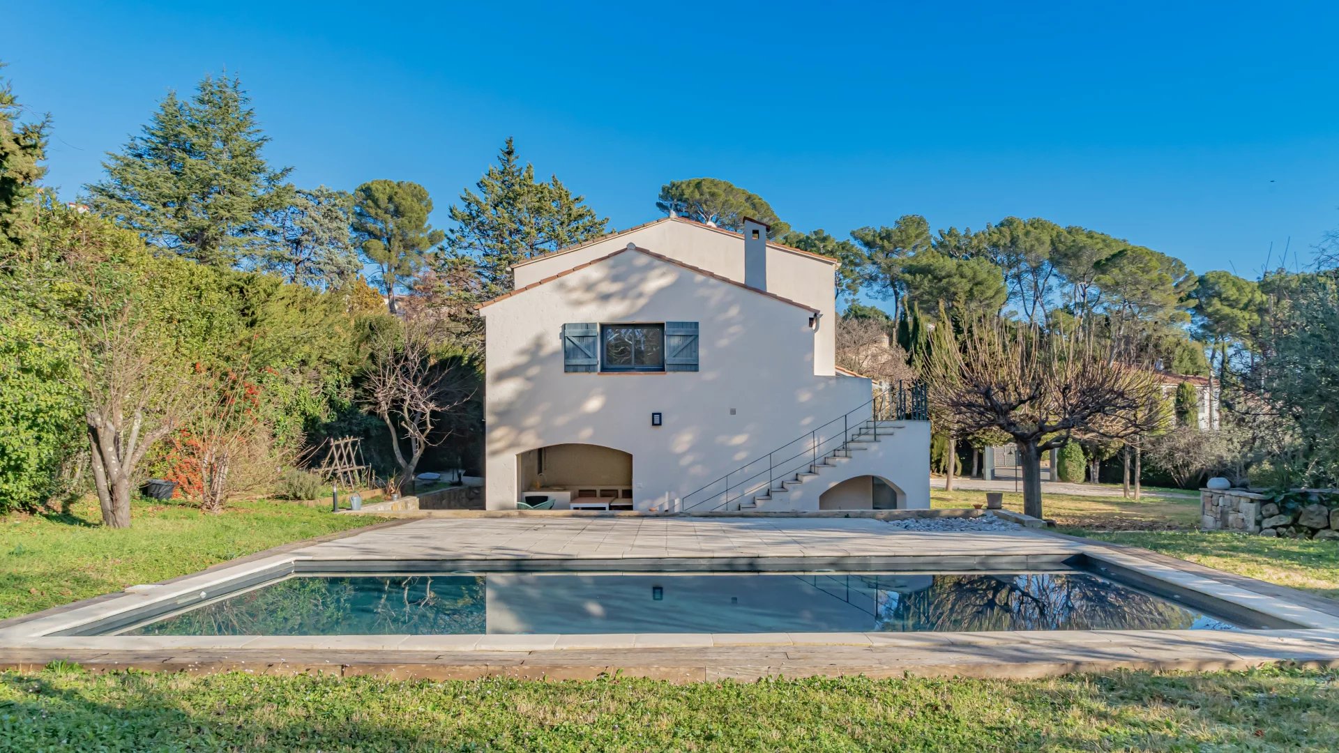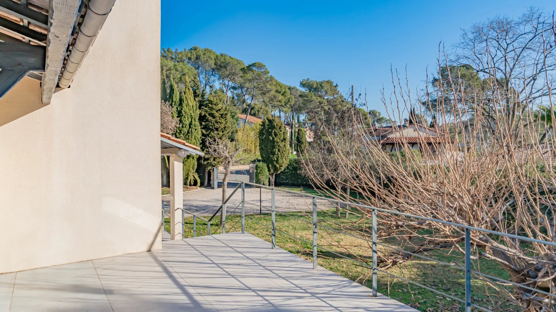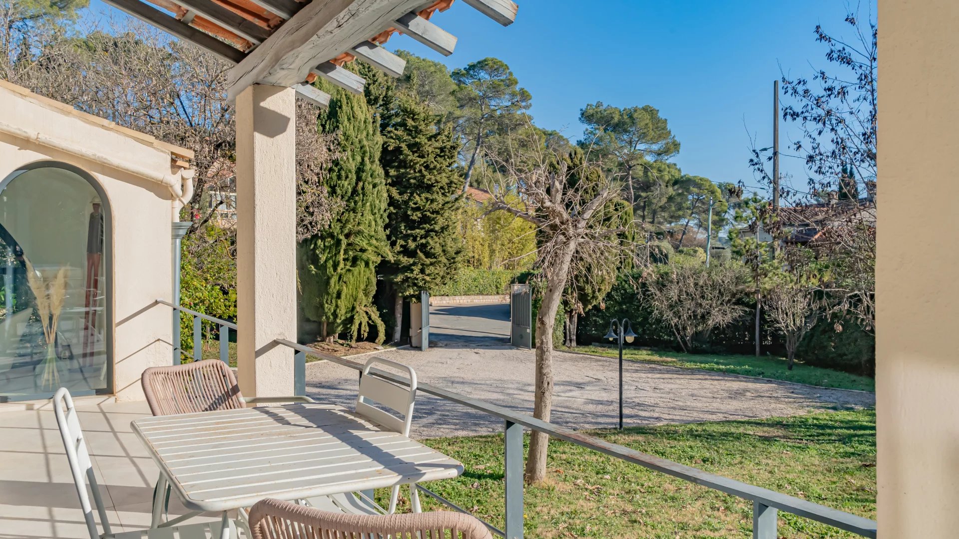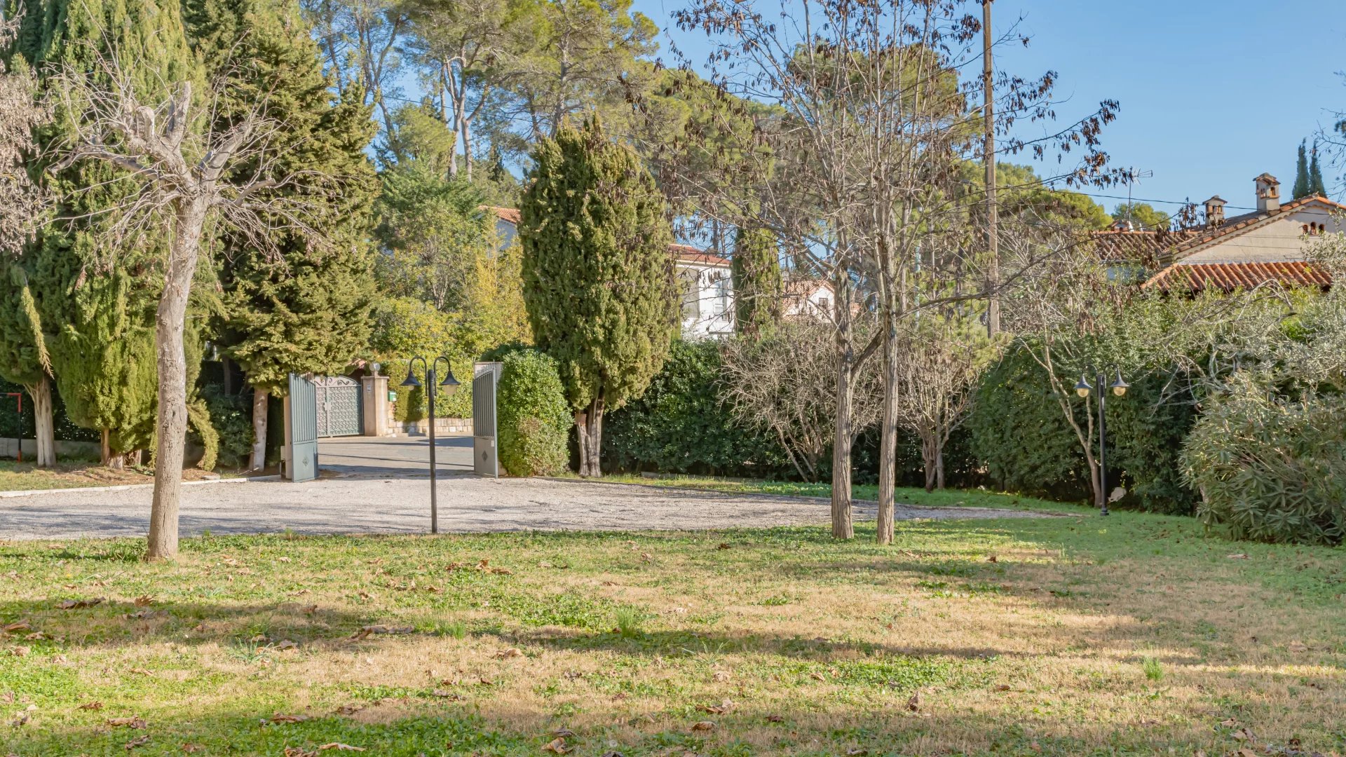 Nestled in a gated and sought-after domain, this villa enjoys a serene setting while being ideally located near a renowned golf course, Mougins School, and Sophia Antipolis.