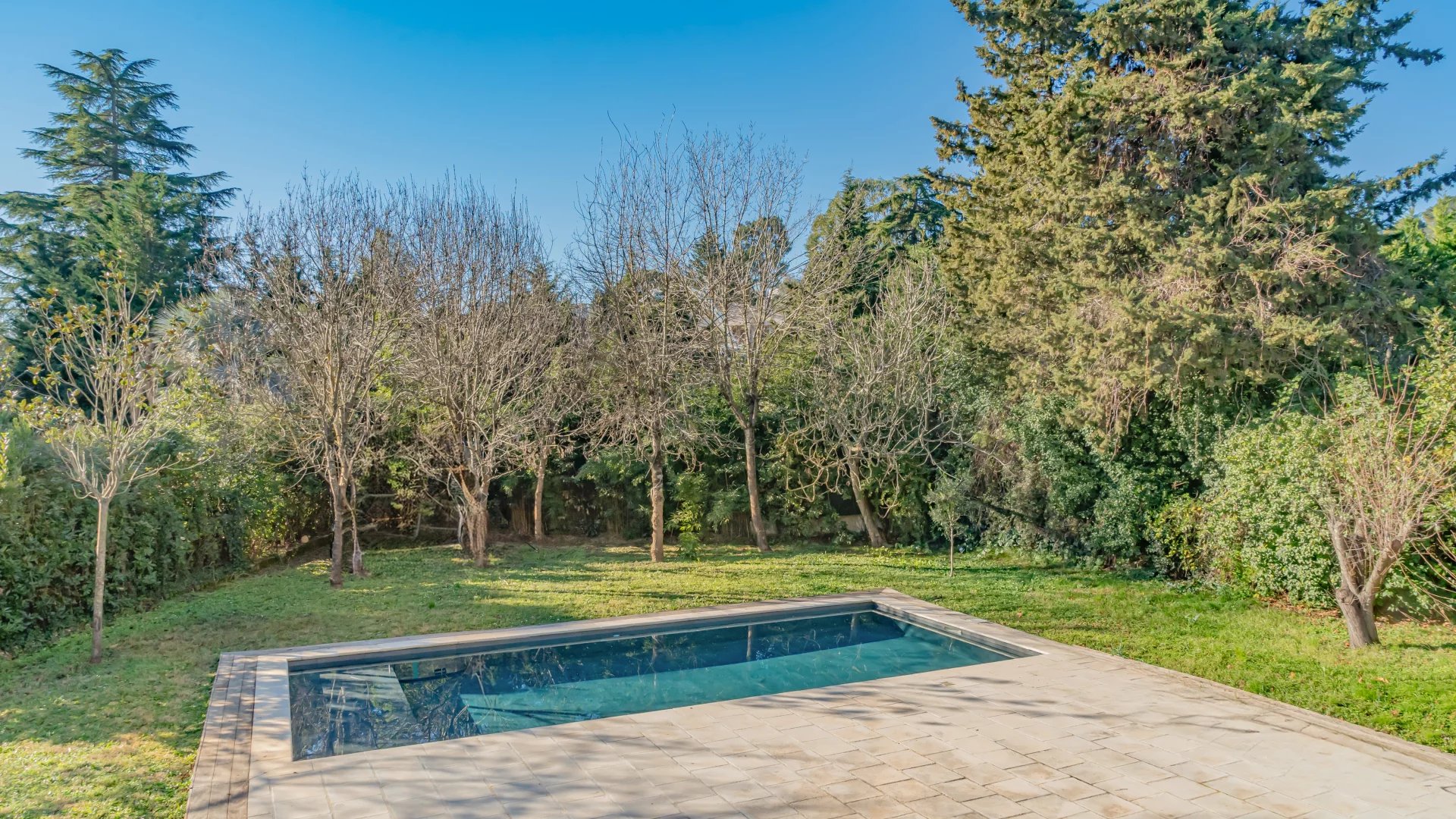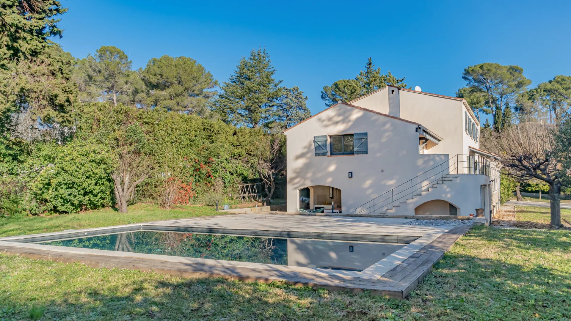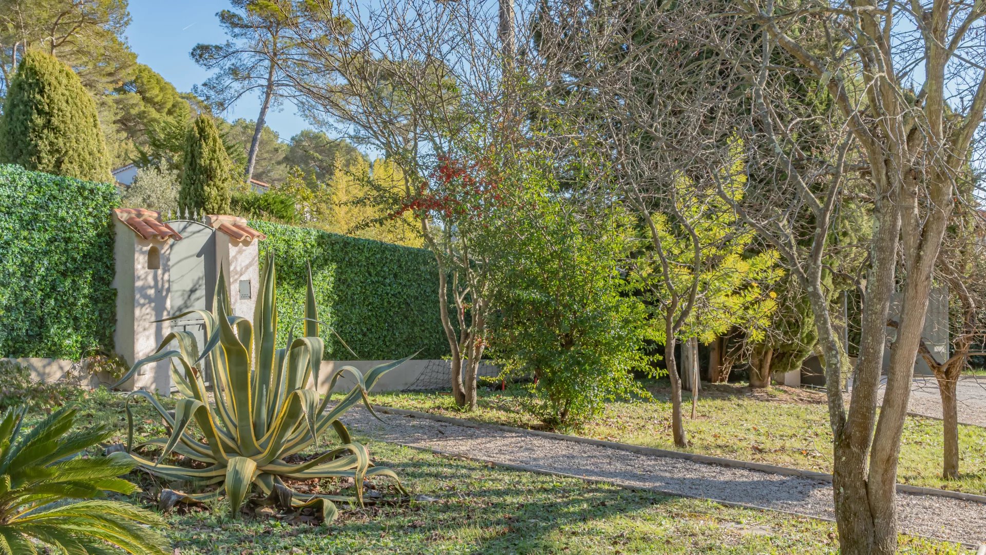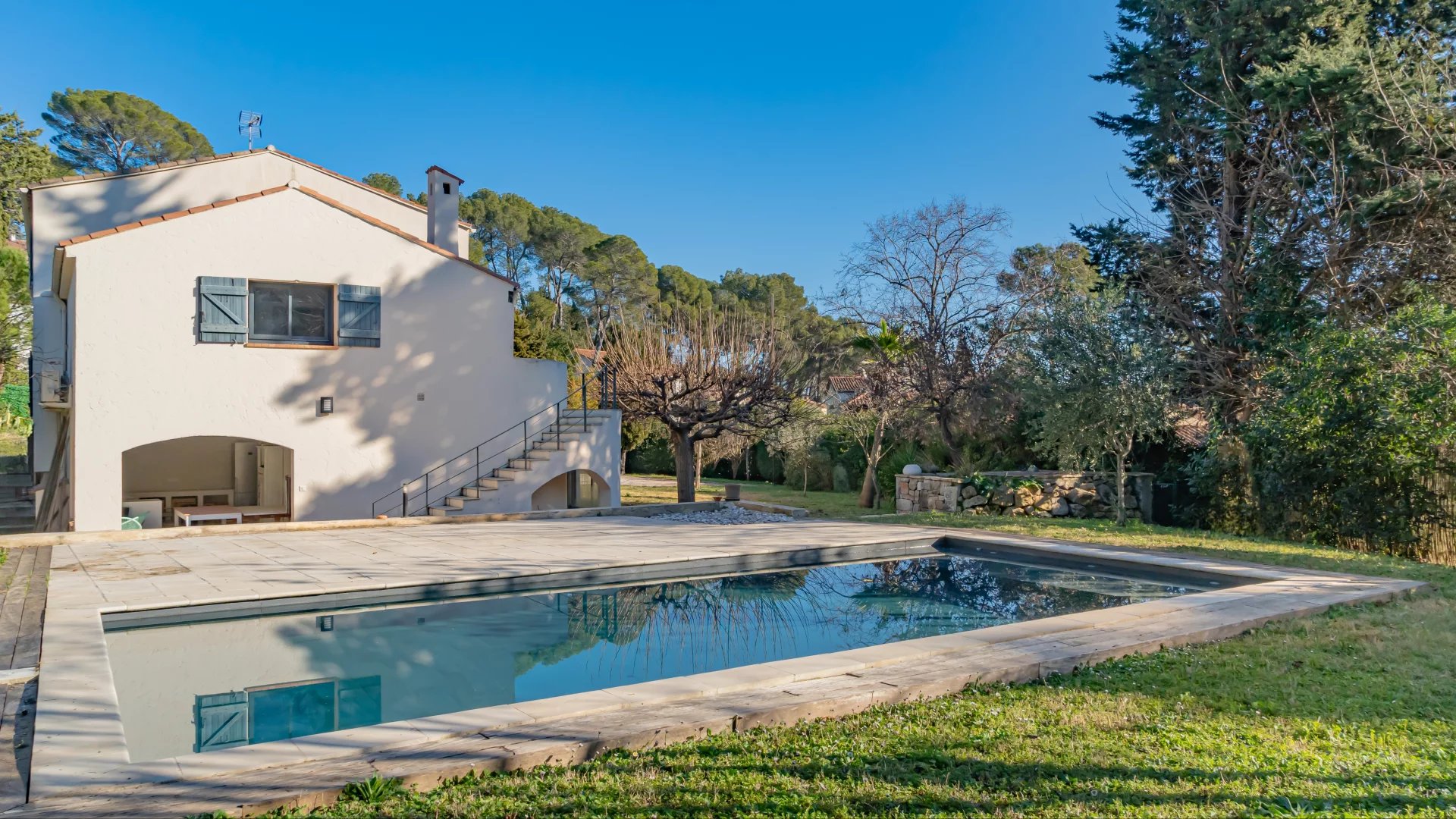Nestled in a gated and sought-after domain, this villa enjoys a serene setting while being ideally located near a renowned golf course, Mougins School, and Sophia Antipolis.