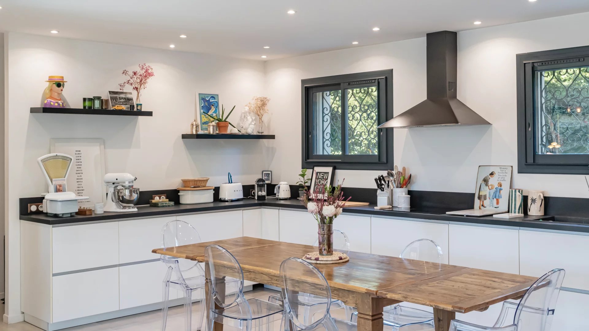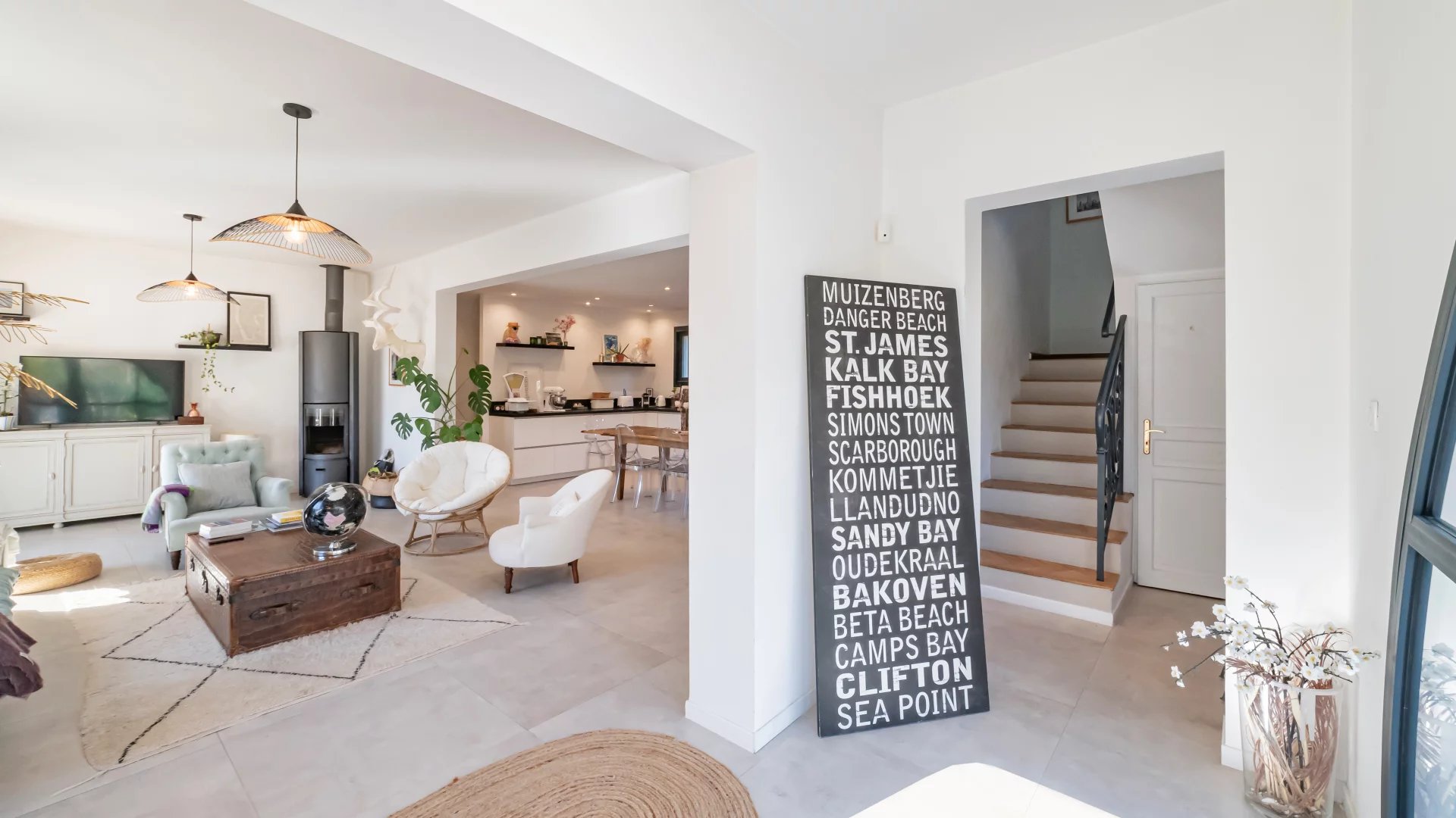 Upstairs, four air-conditioned bedrooms share a bathroom and a shower room, ensuring comfort and privacy for the entire family.