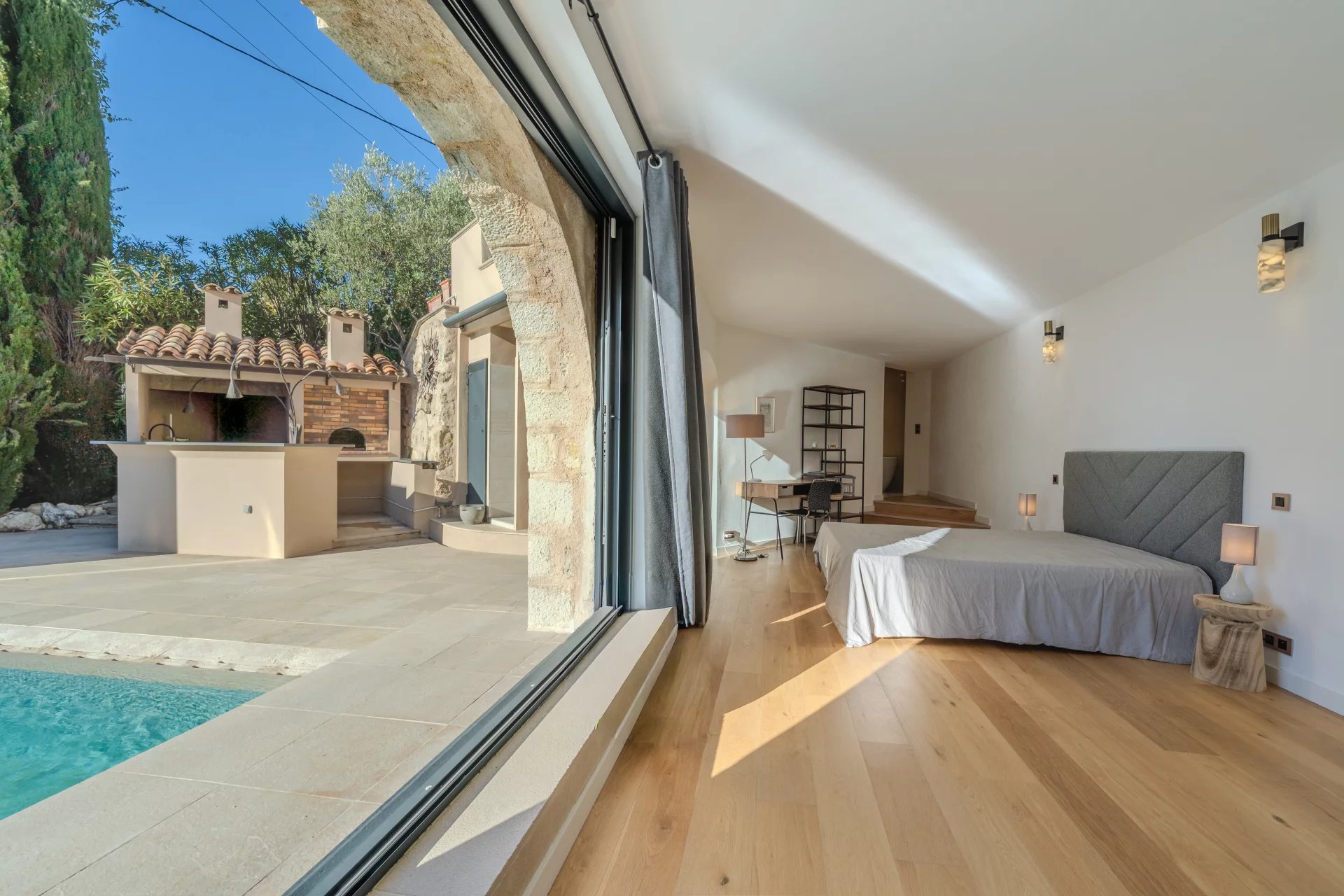 Outside, a spacious garage, a heated swimming pool with pool-house and summer kitchen, a bioclimatic terrace and a petanque court create an exceptional setting for enjoying the panoramic views and Mediterranean climate.