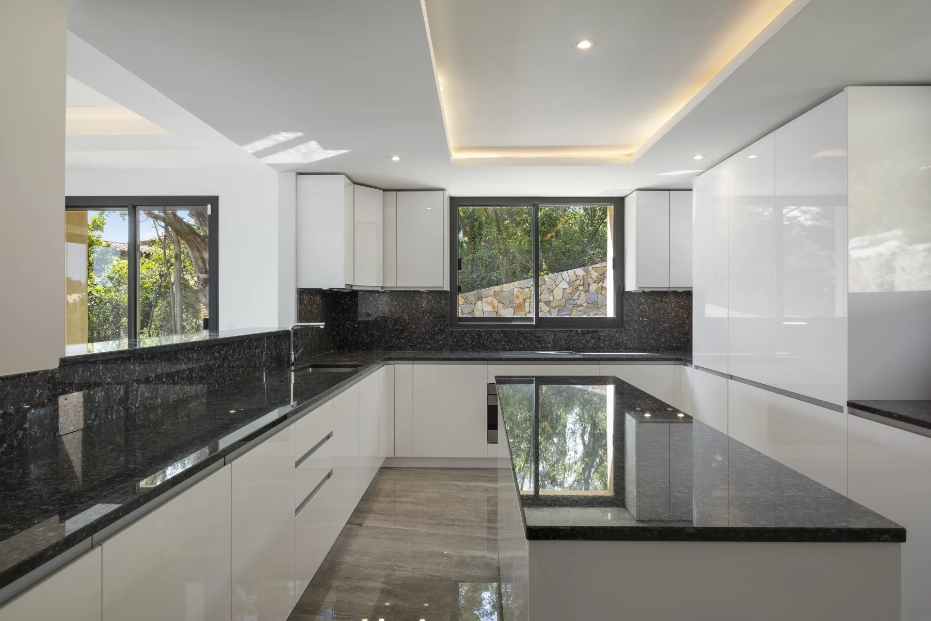 Located on the outskirts of Mougins, on the heights of Cannes, this contemporary 370 m2 villa, completely renovated in 2023 and designed by a well-known architect, boasts spectacular sea views over the Lerins islands, the Esterel mountains and the Bay of Cannes.