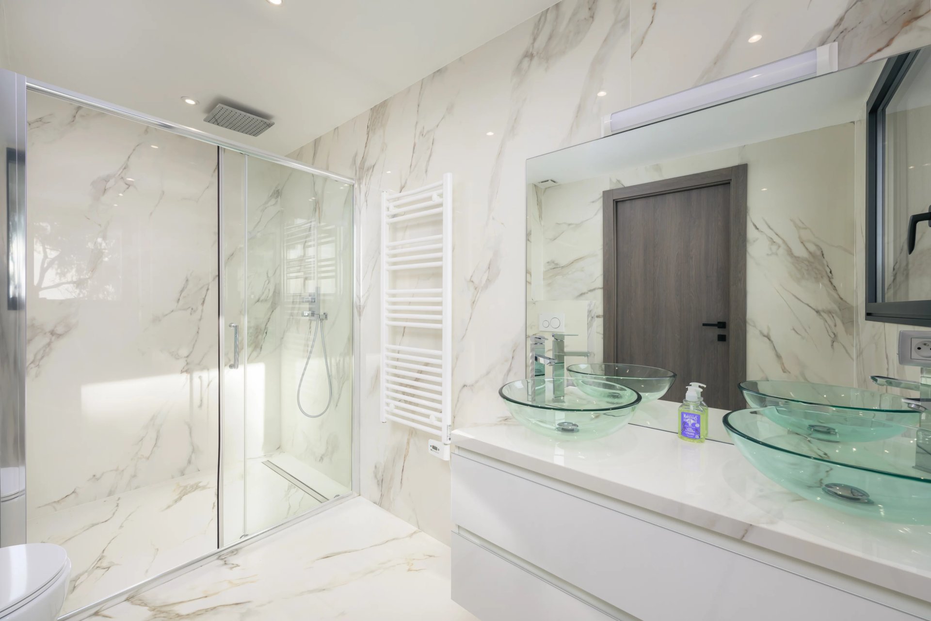 On the ground floor, the space revolves around a majestic 90 m2 living room with a designer American kitchen, opening to the outdoors through bay windows that capture the sea view. This level also houses two sumptuous suites, each with its own bathroom and dressing room, offering comfort and refinement.