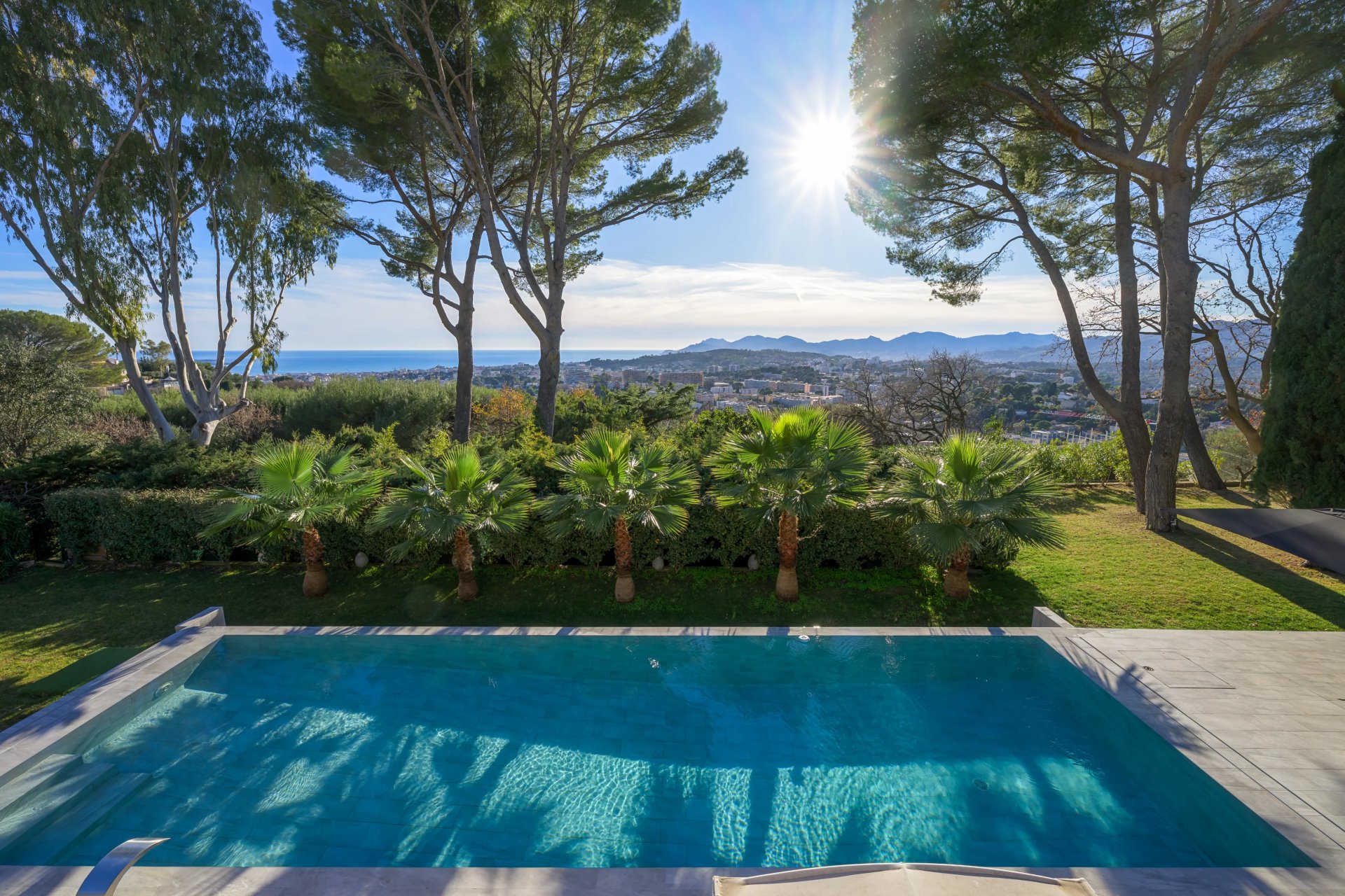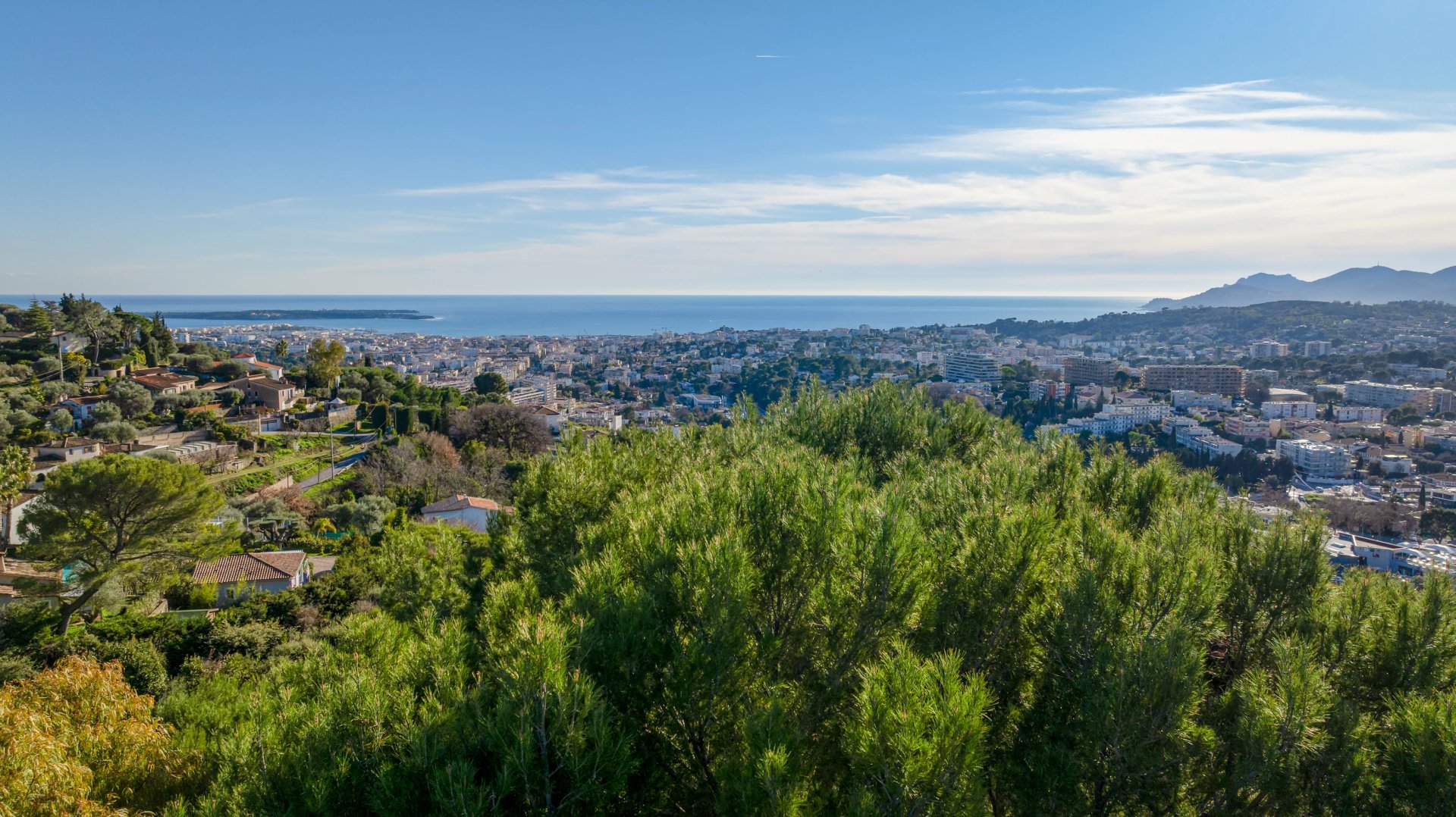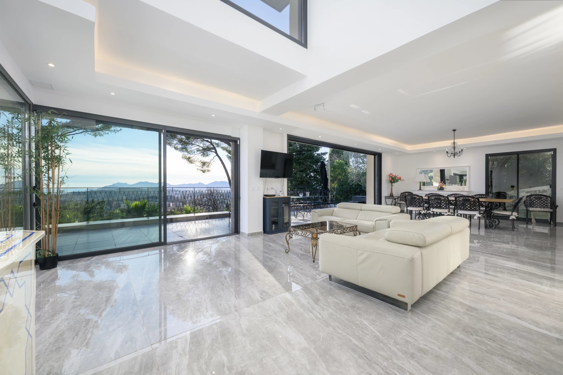 Perched on a 2130 m2 plot, this residence boasts a breathtaking panoramic view of the sea and Cannes, harmoniously blending into its verdant surroundings.