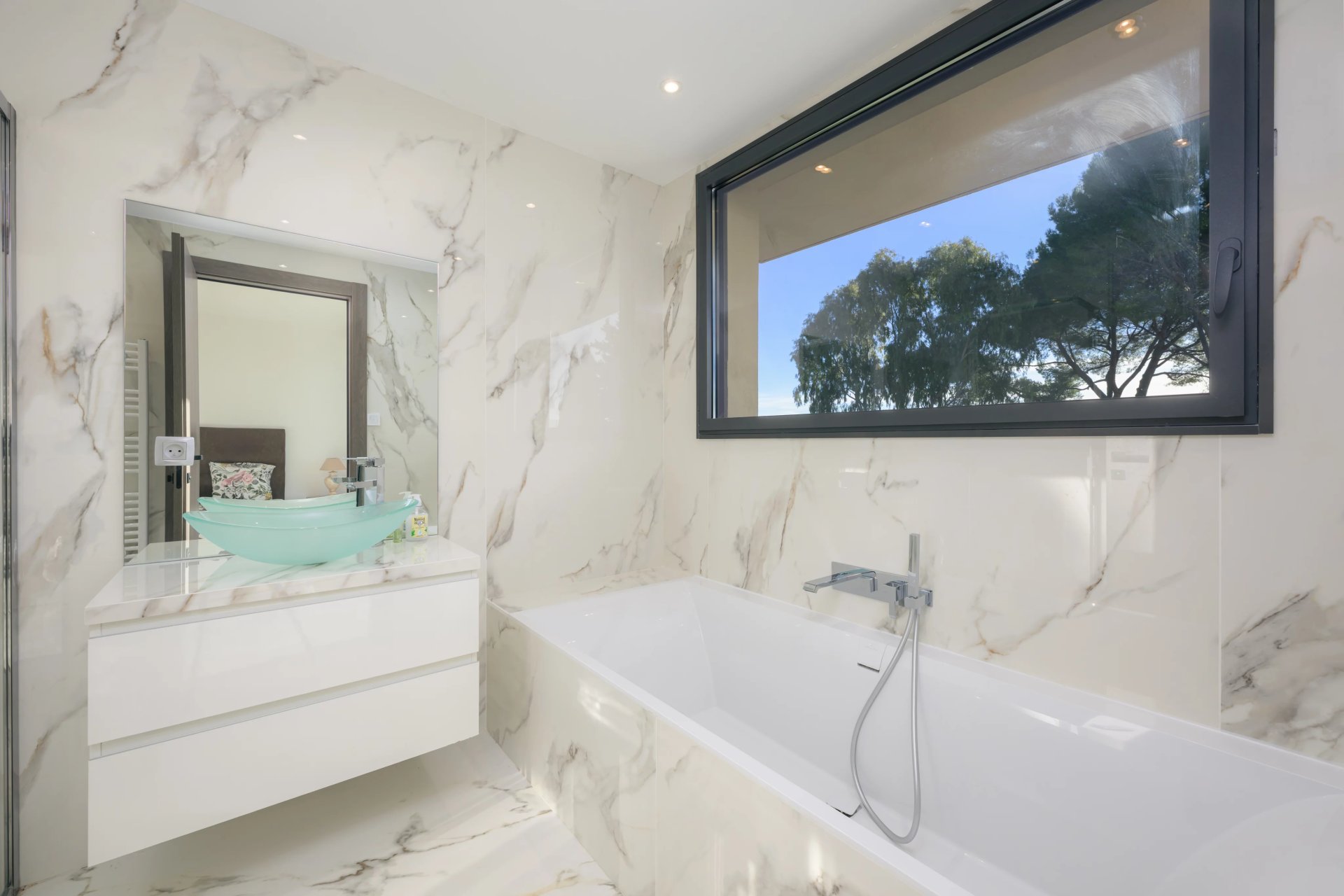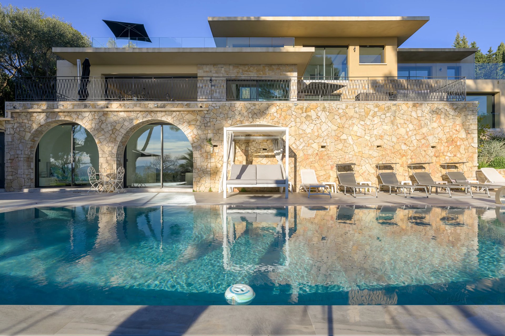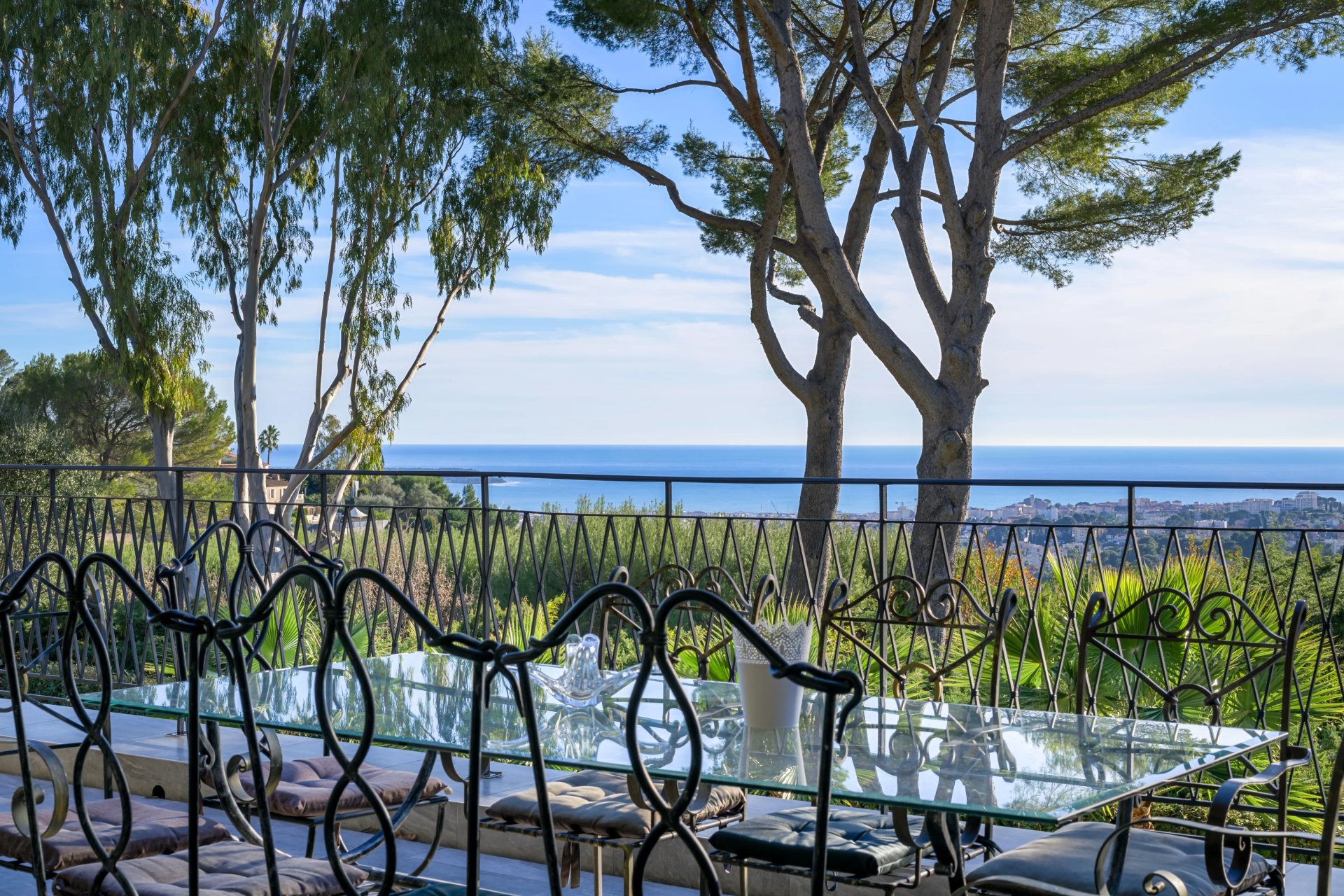 Perched on a 2130 m2 plot, this residence boasts a breathtaking panoramic view of the sea and Cannes, harmoniously blending into its verdant surroundings.