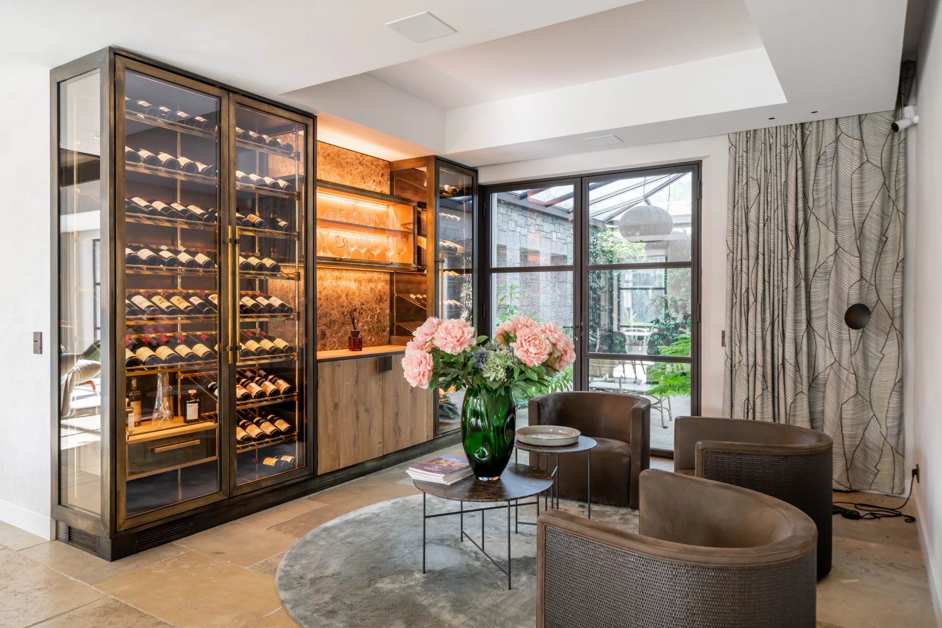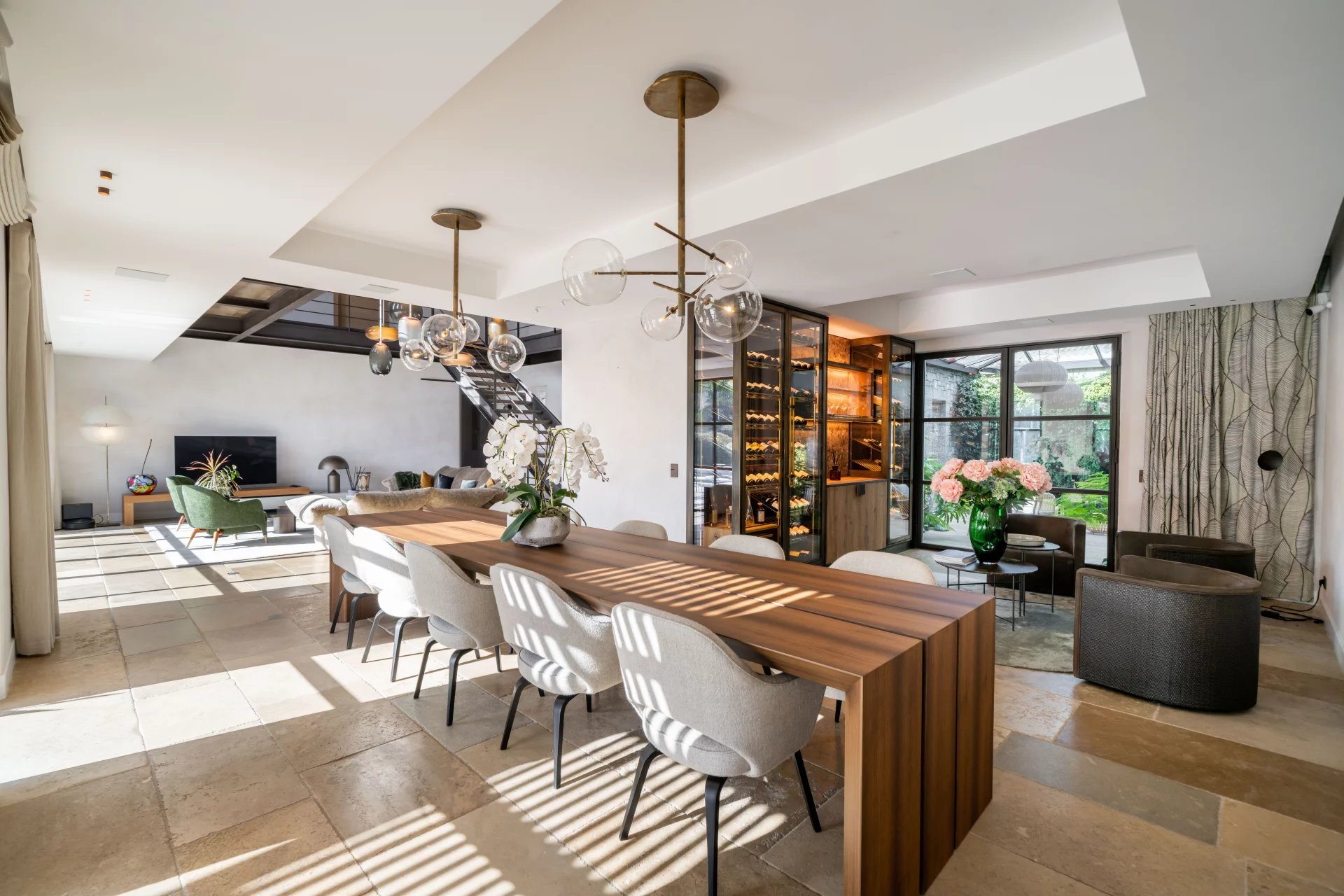 The main house comprises: an entrance hall, cloakroom and guest toilets, a reception room with double-height ceiling, dining room, fully equipped kitchen (Gaggenau appliances), and a boudoir with direct access to the patio and its water garden. One ground-floor guest suite.
