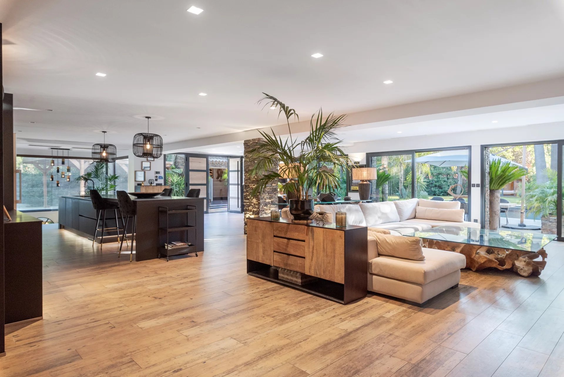 Located in a sought-after residential area of Mougins, close to main roads, this mostly single-level villa offers a peaceful, green setting.