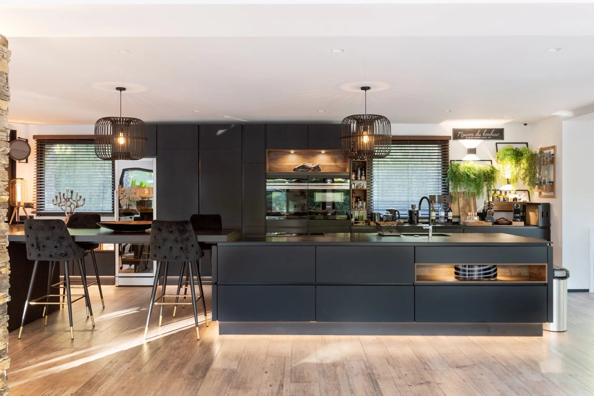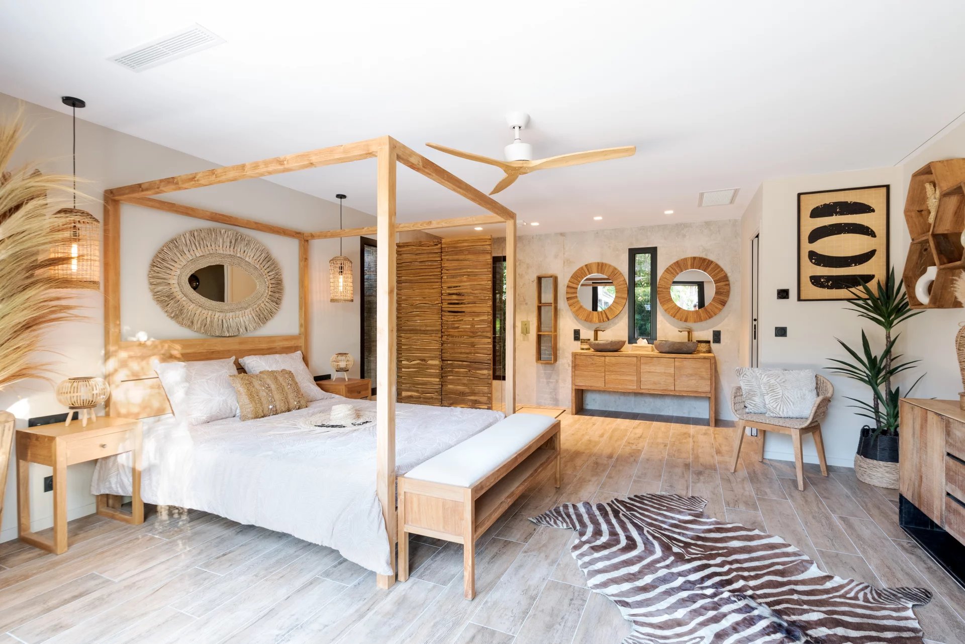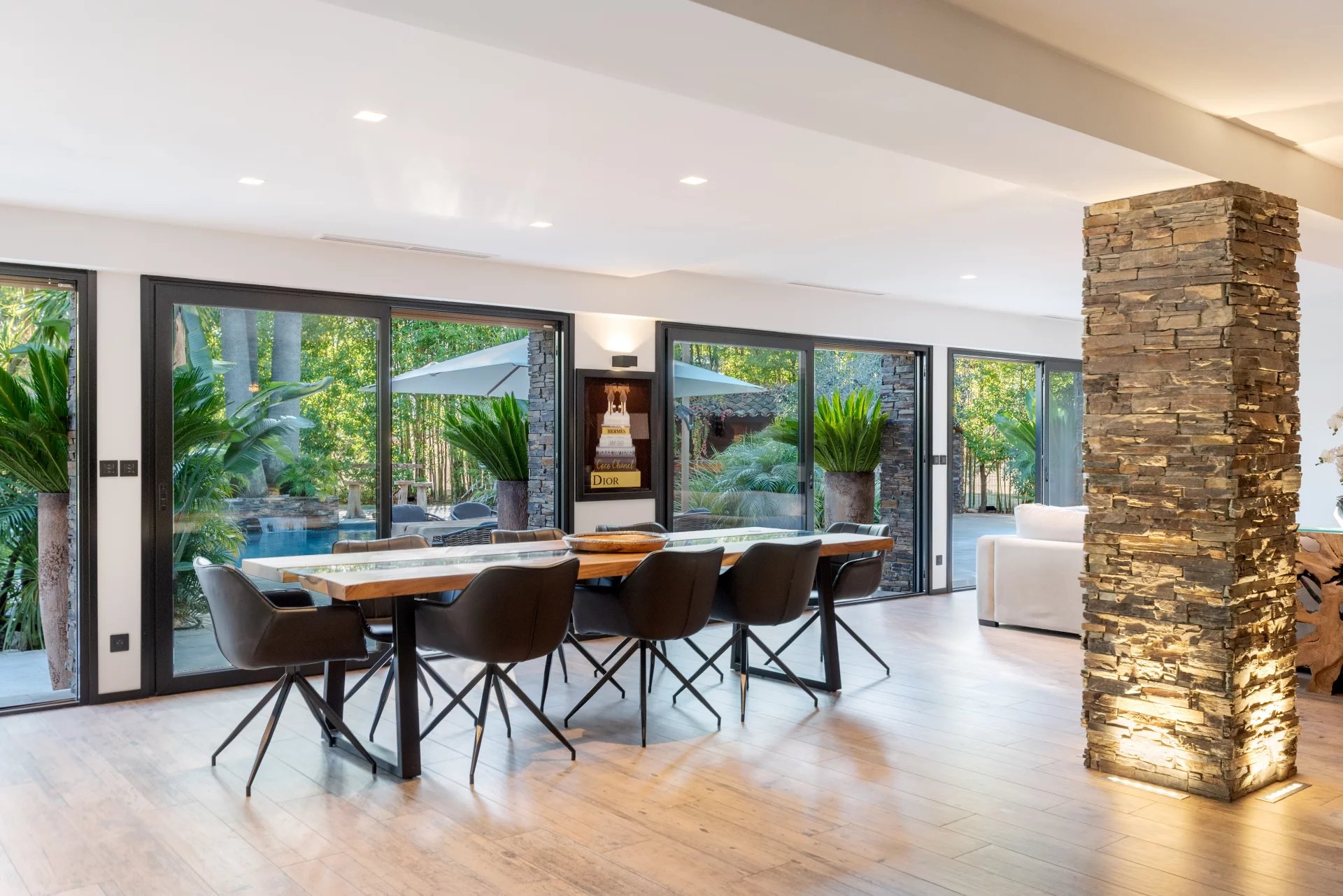 The main house features a bright, spacious living room opening onto terraces and landscaped gardens, as well as six en-suite bedrooms, including a separate guest suite at the end of the garden.