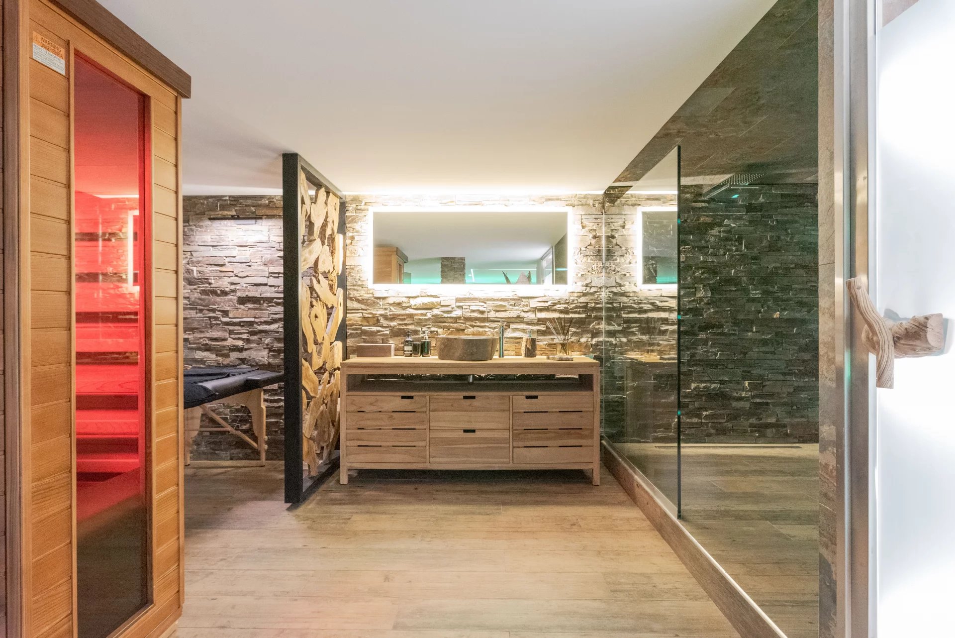 The property includes two swimming pools (indoor and outdoor), a spa area with sauna, and a fully equipped pool house.