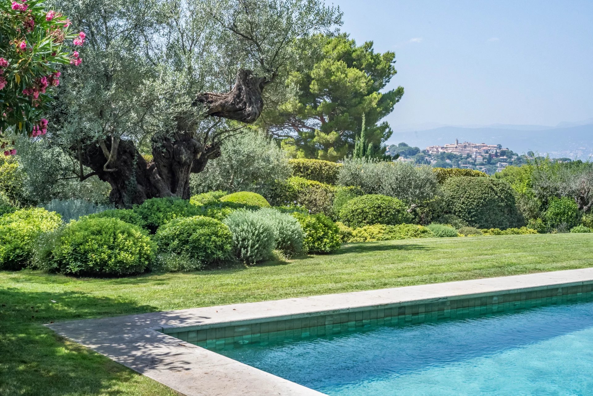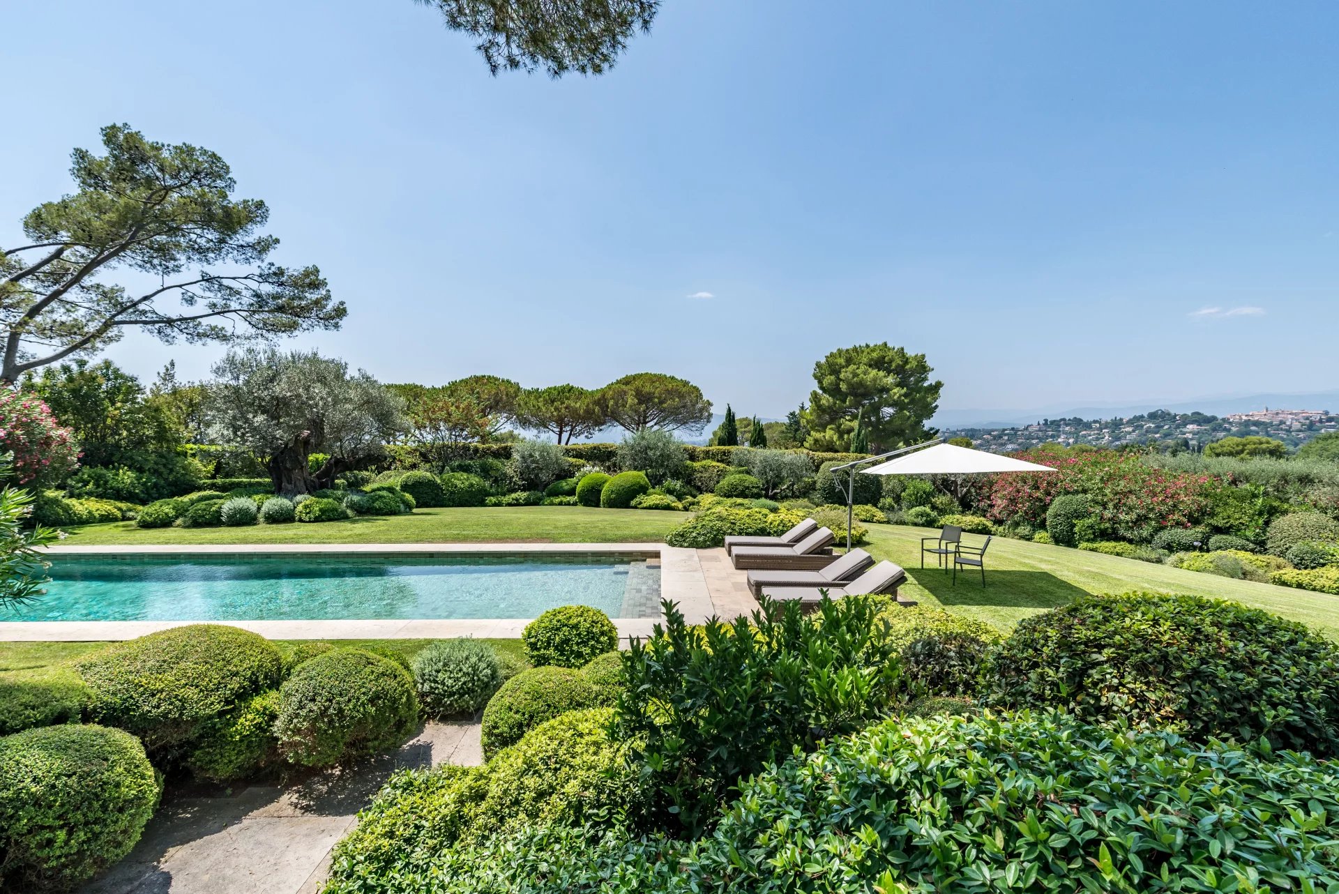 The property enjoys magnificent views over the village of Mougins and the Esterel and is totally private and not overlooked