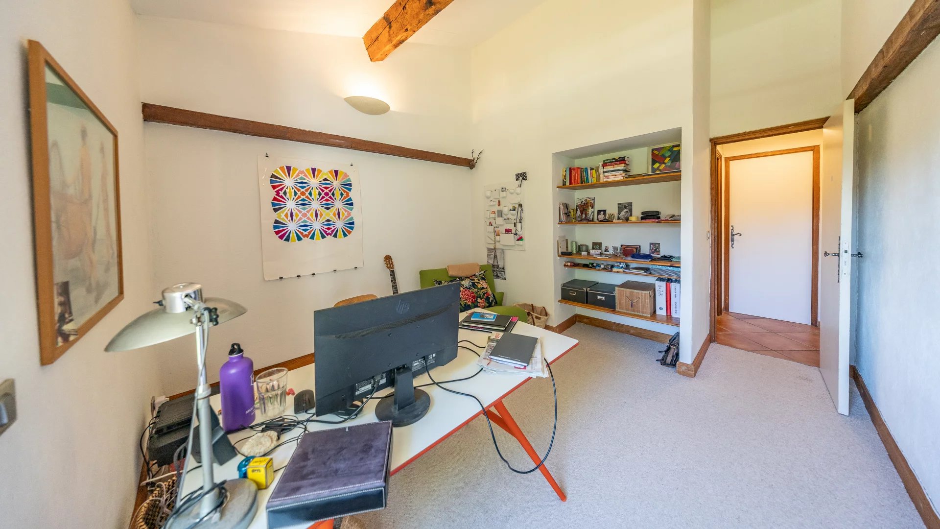 The ground floor of this welcoming home comprises an entrance hall, a spacious and convivial 55 m2 living room with high ceilings (3 metres), a kitchen with utility room, a bedroom, a study and a shower room.