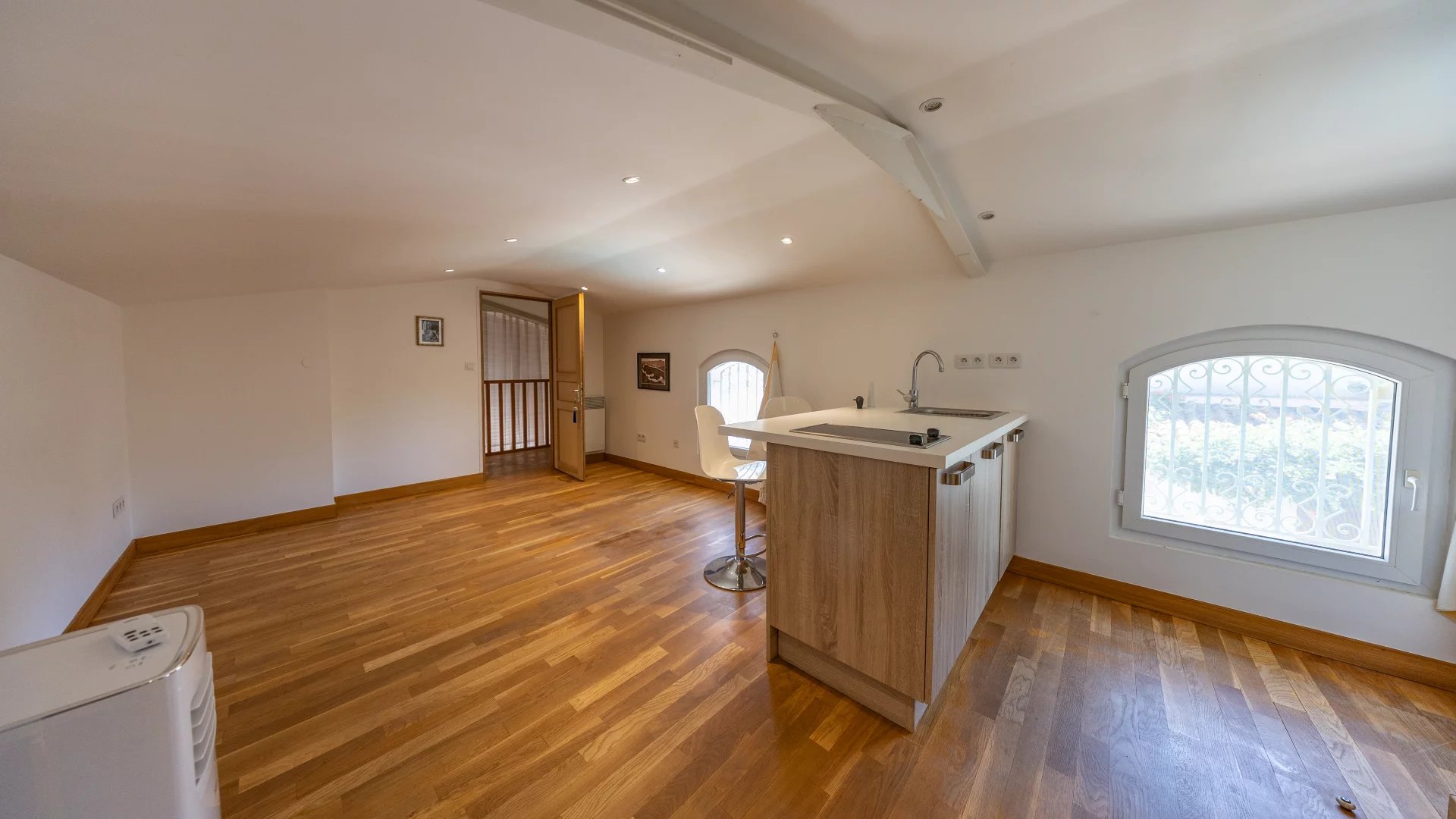 At the rear of the farmhouse, there is an outbuilding / garage (70 m²), an independent one-bedroom apartment, a yoga room, a painting studio and a storage room.