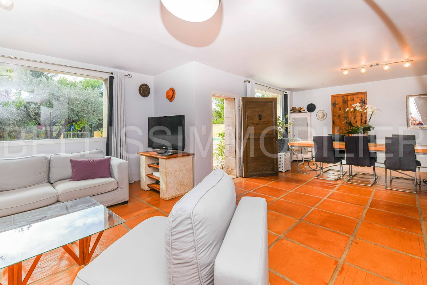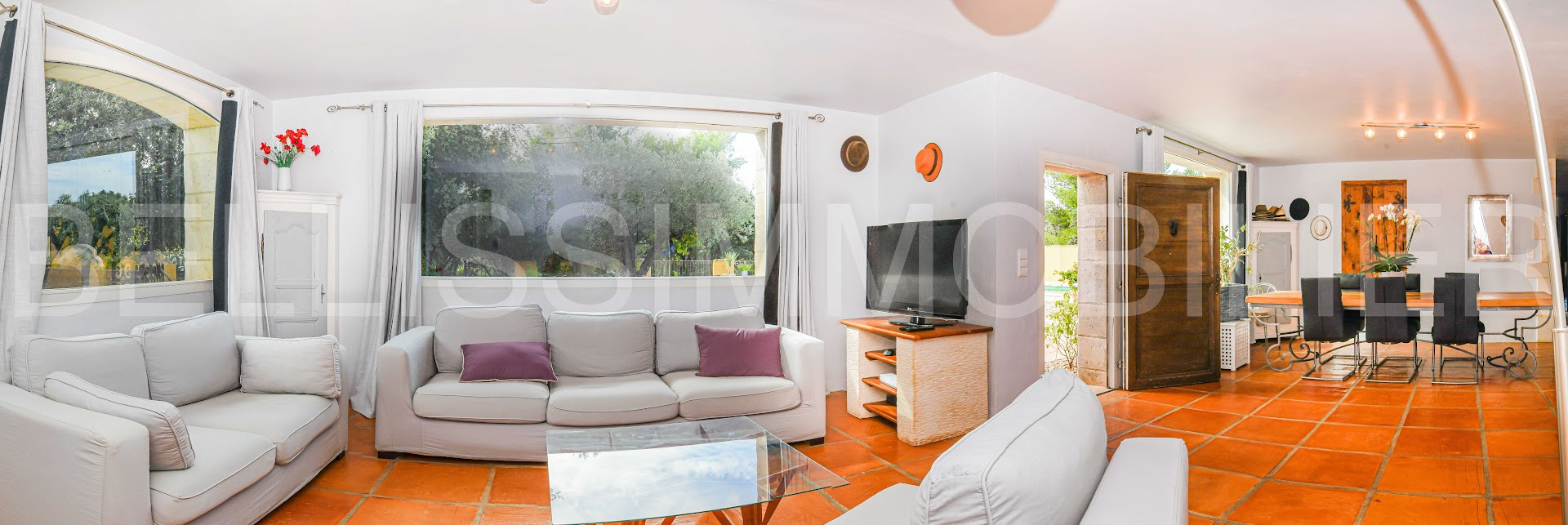 In absolute calm without visible neighborhood, surrounded by olive trees, holm oaks and other Provencal species, the main house (2000-2003), on one level, offers 3 bedrooms, one with shower room, a 2nd bathroom. Pantry-laundry room. The kitchen area, open to a warm living room and the dining room communicate on a vast terrace designed as a patio, embellished with an elegant basin to cool off. Ideal for relaxing and welcoming family and friends in a friendly atmosphere.