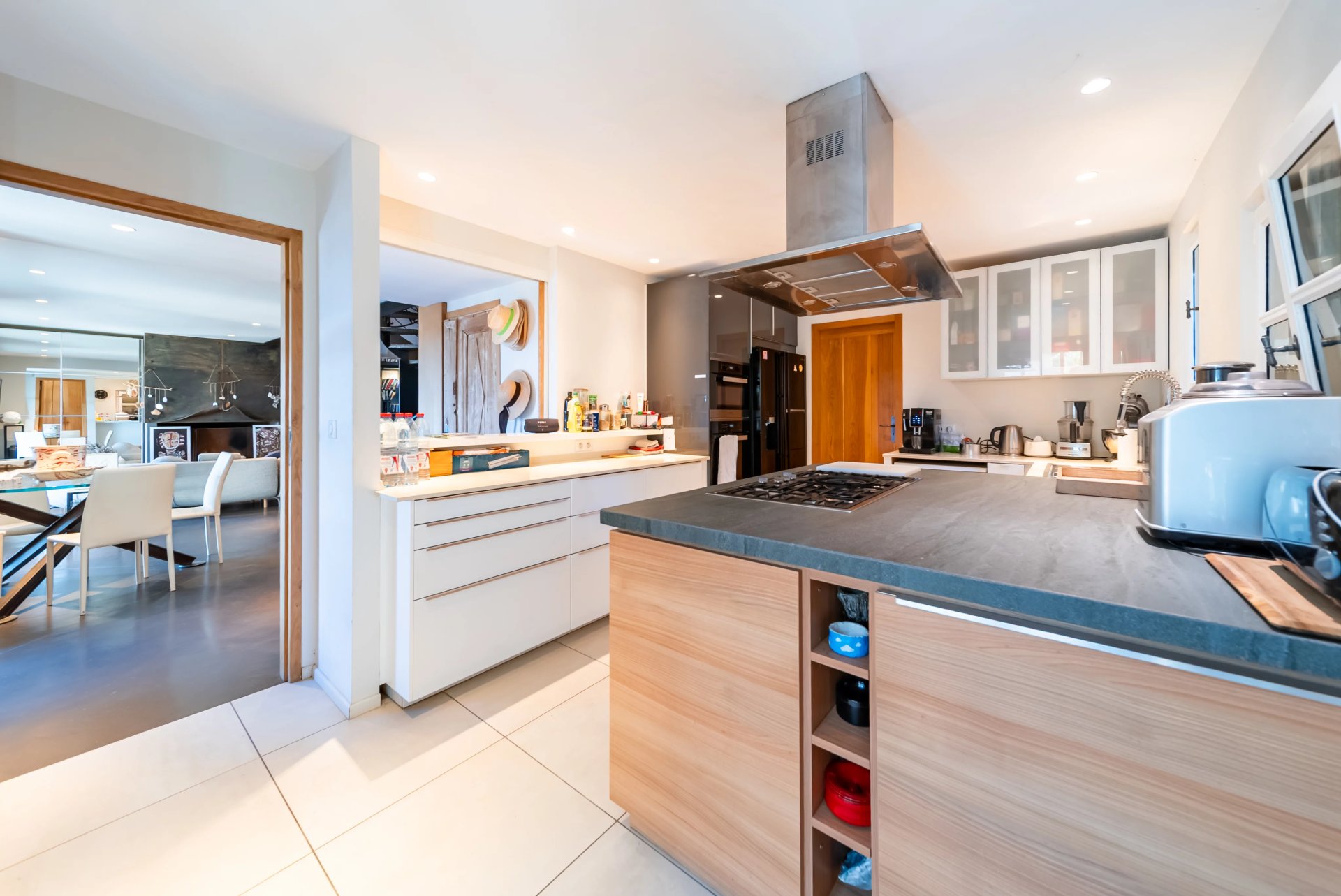 The accommodation includes several reception areas, a dining space and a kitchen opening onto the outdoor living areas. A veranda extends the main rooms and allows comfortable year-round use.