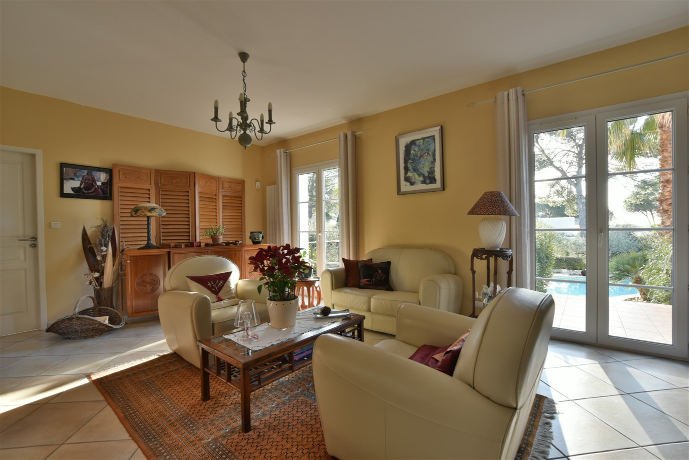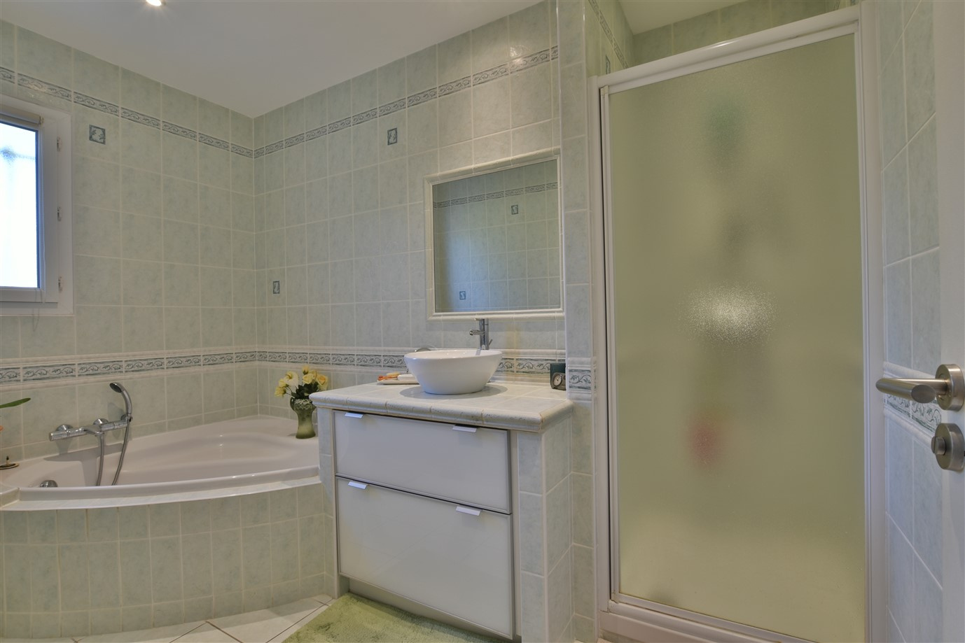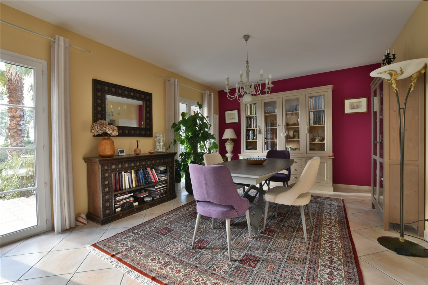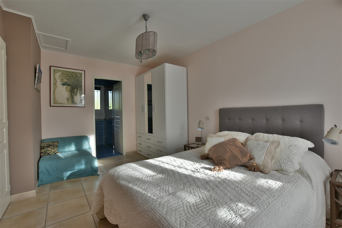 Outside, the property is beautifully landscaped, offering complete privacy with open views. The villa enjoys a large terrace of over 50 m2, partly covered and partly equipped with a large retractable awning, an inviting pool area with sunbathing deck, and a manicured garden. A constructible and detachable plot of approximately 400 m2 adds potential for expansion.