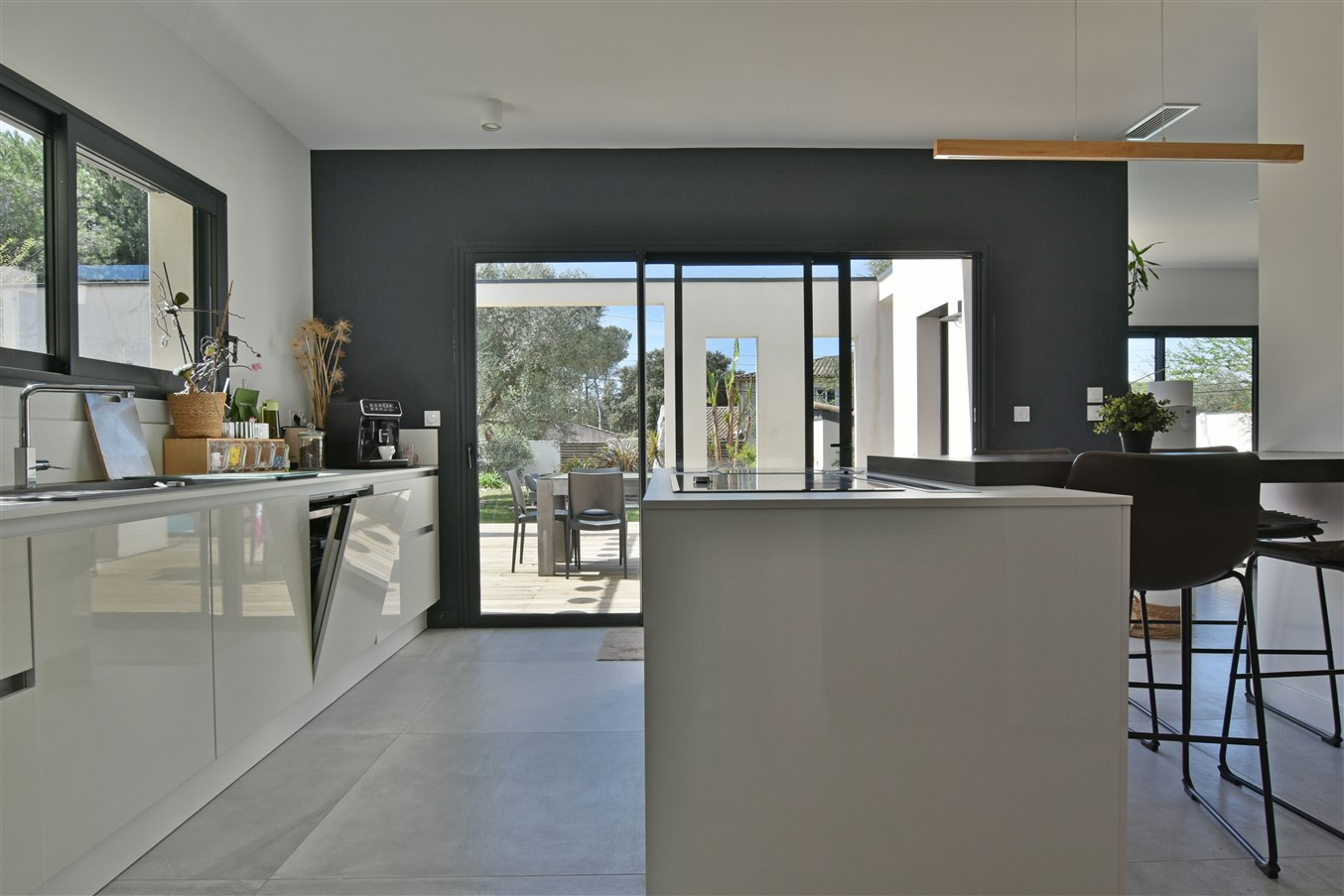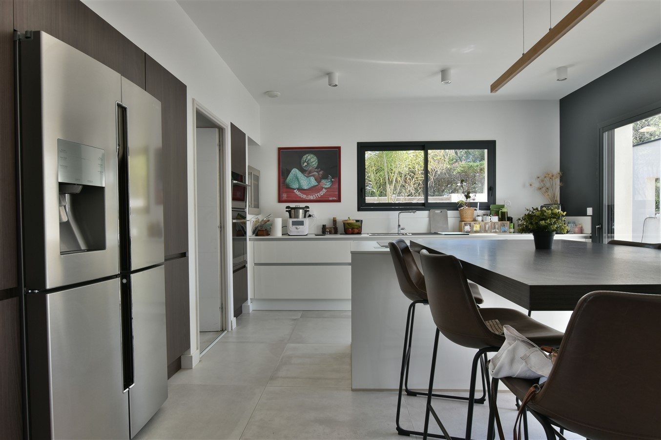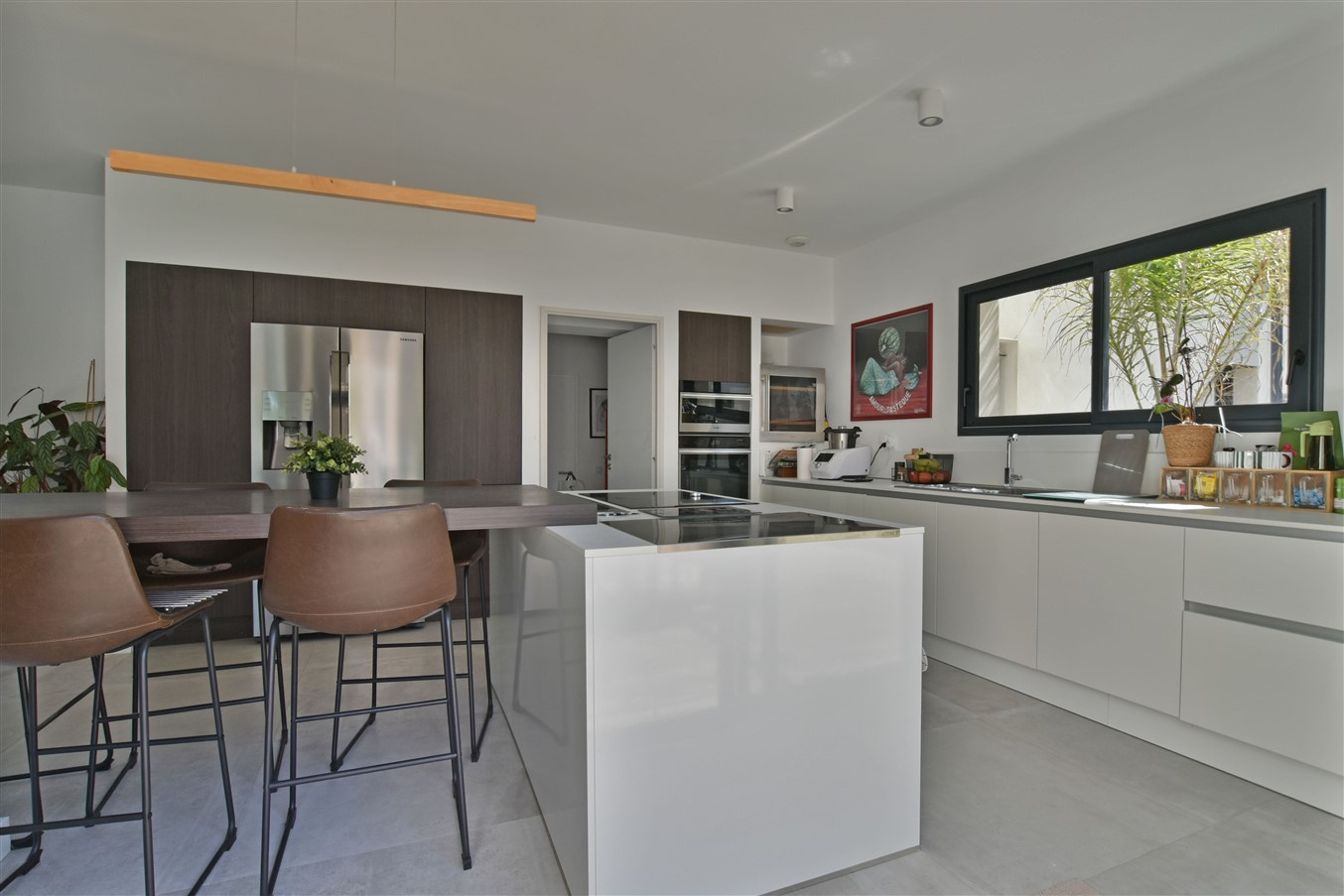 From the moment you enter, you are welcomed by 2.70-metre ceiling heights and abundant natural light, enhanced by premium aluminium joinery, tilt-and-turn windows, and centrally controlled electric shutters. The impressive 67 m2 living area opens seamlessly onto the outdoors through large sliding glass doors fitted with adjustable sunshades (BSO) for optimal thermal comfort. The prestigious Leicht kitchen features a central island, retractable extractor hood, and a striking 3-metre bay window.