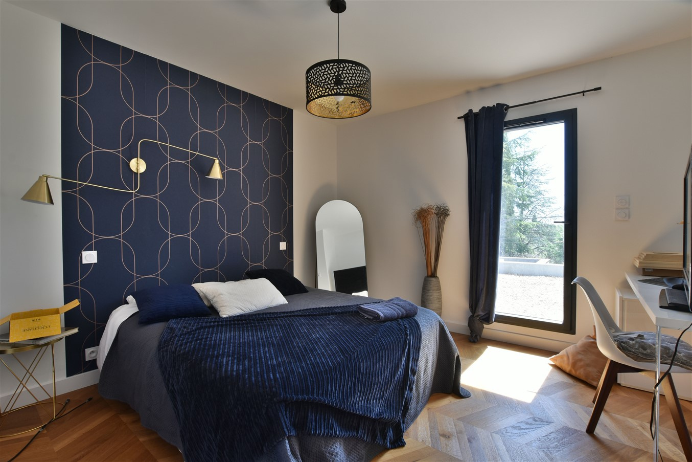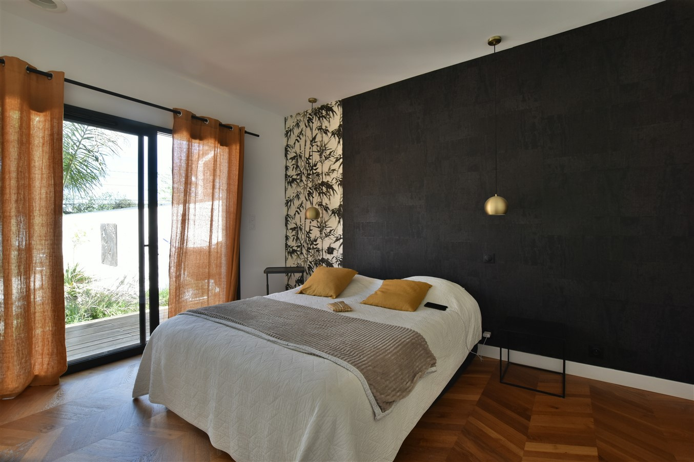 The sleeping quarters include, on the ground floor, a suite with private shower room and direct garden access. Upstairs, three spacious bedrooms are finished with authentic oiled oak parquet flooring laid in a herringbone pattern, adding warmth and refinement throughout. A cleverly designed laundry room with laundry chute, suspended toilets, and a contemporary bathroom complete the main accommodation.