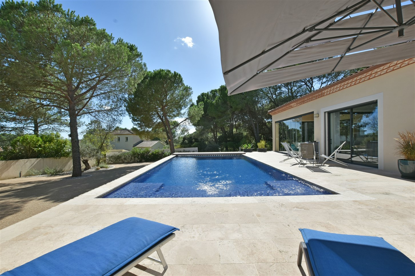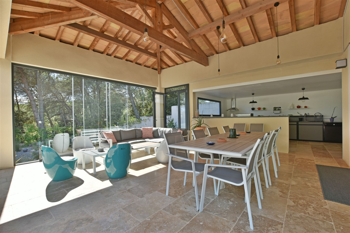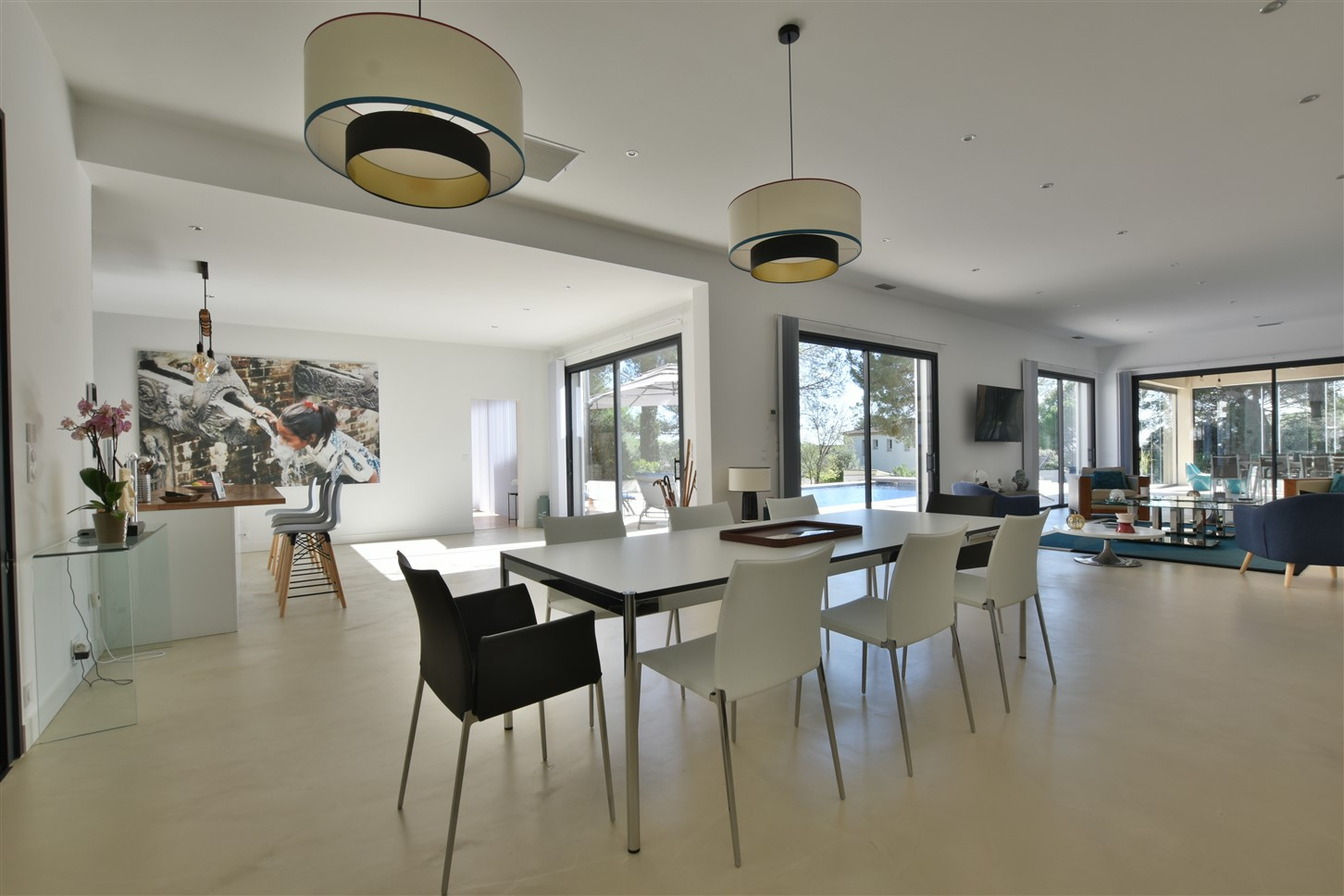Located in the heart of the pine forest of Nages and Solorgues, in a privileged environment and absolute calm, this superb villa of 288 m2 of living space (P8) is located on a landscaped plot of 1,638 m2 with swimming pool and double garage.