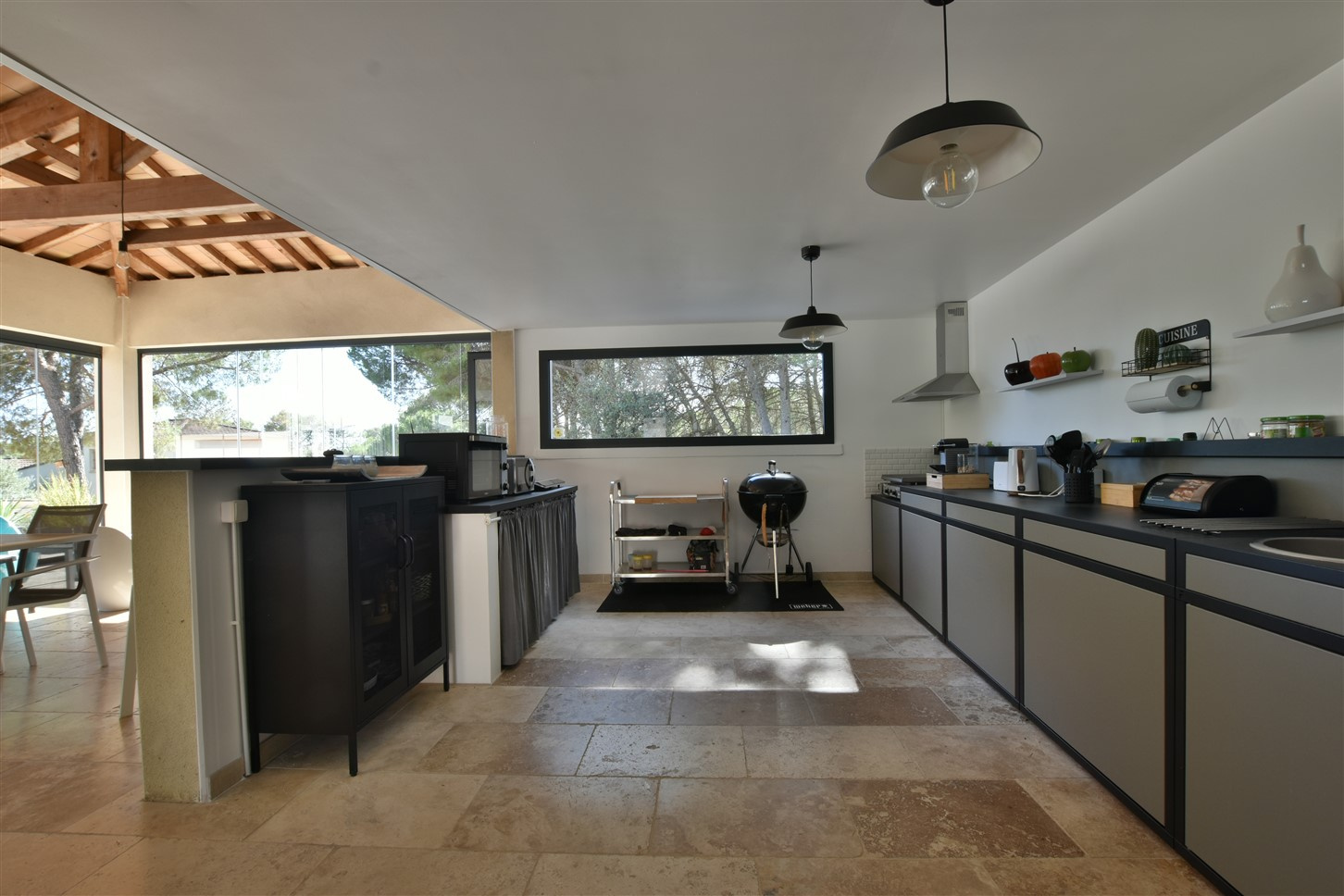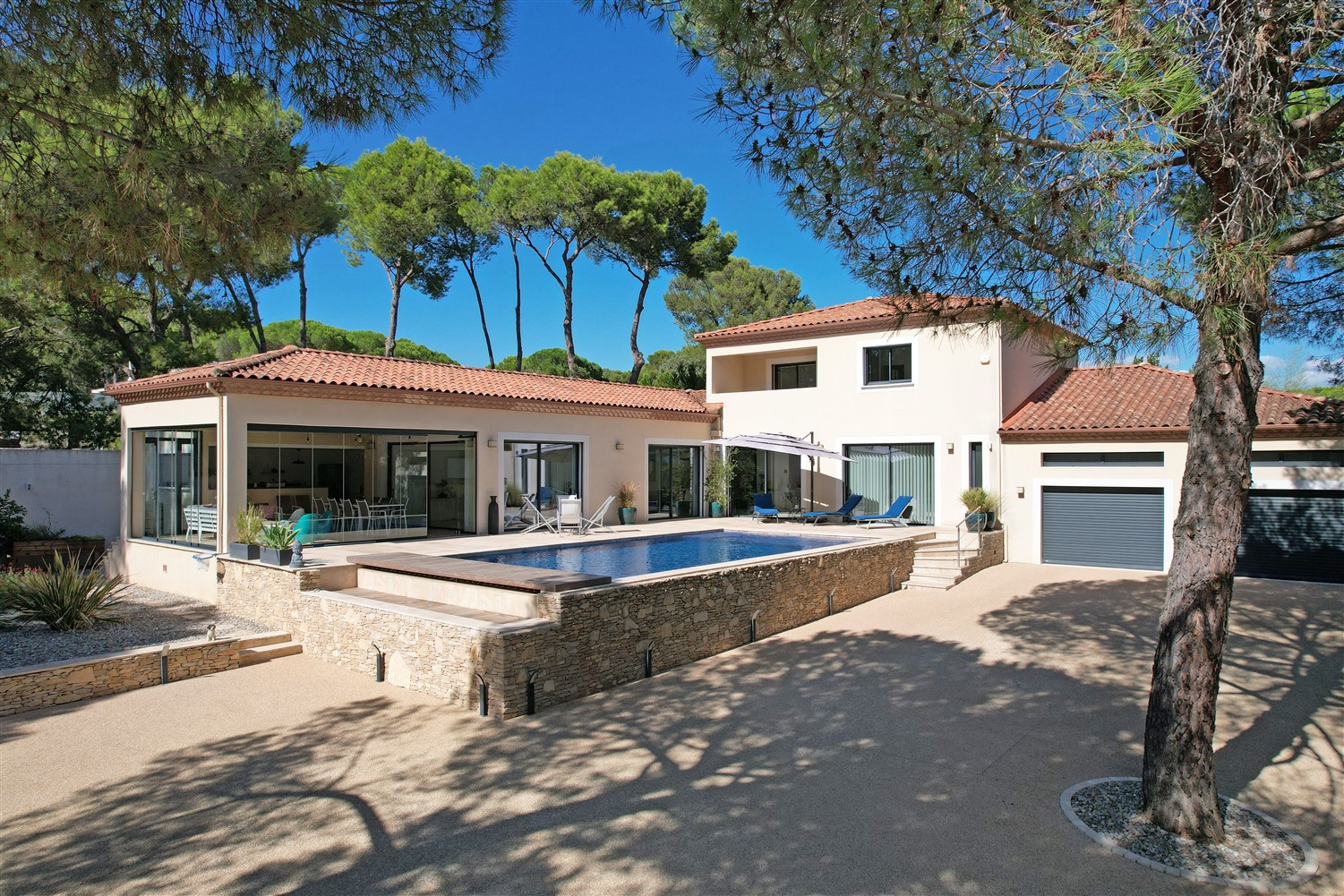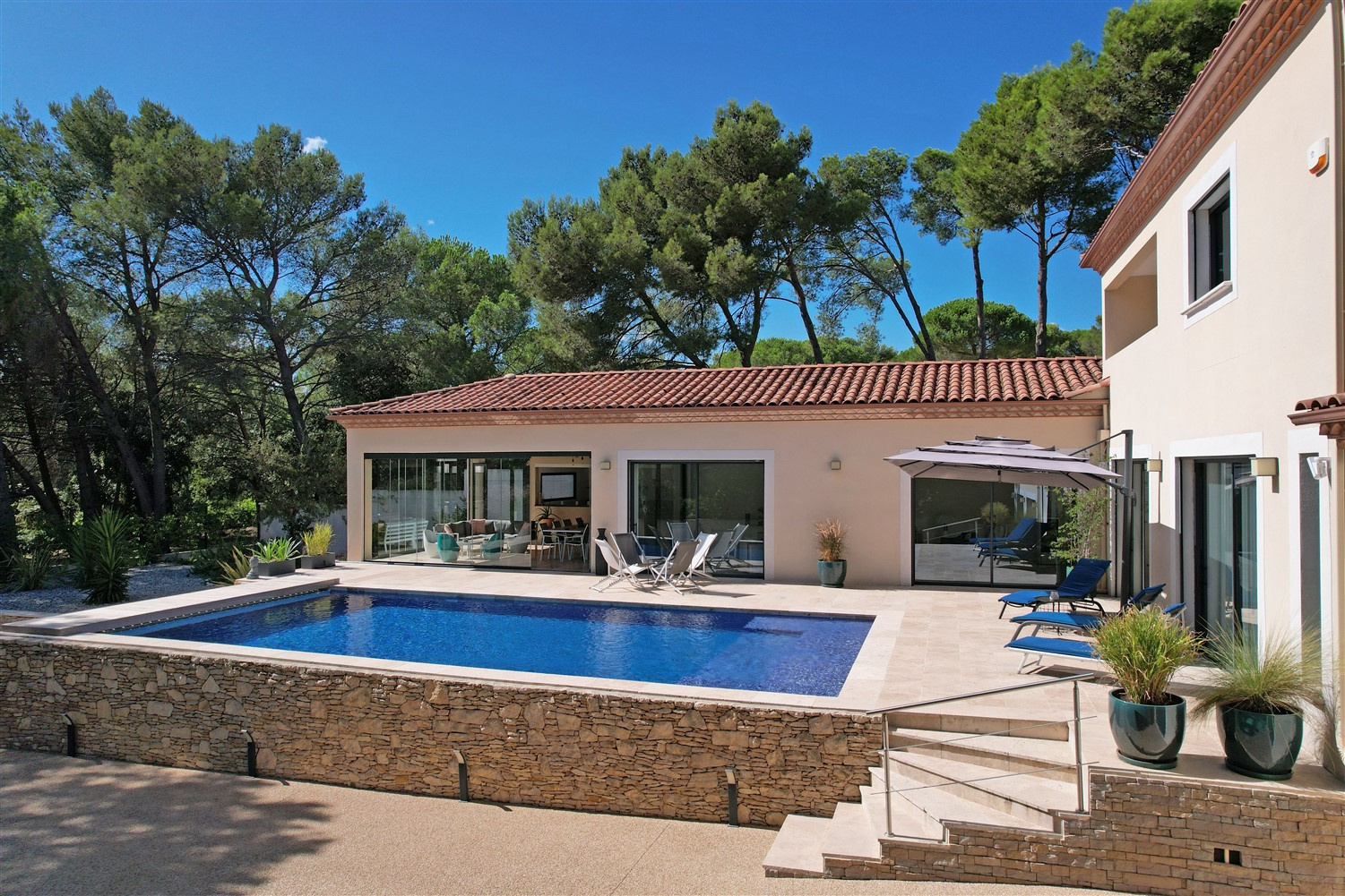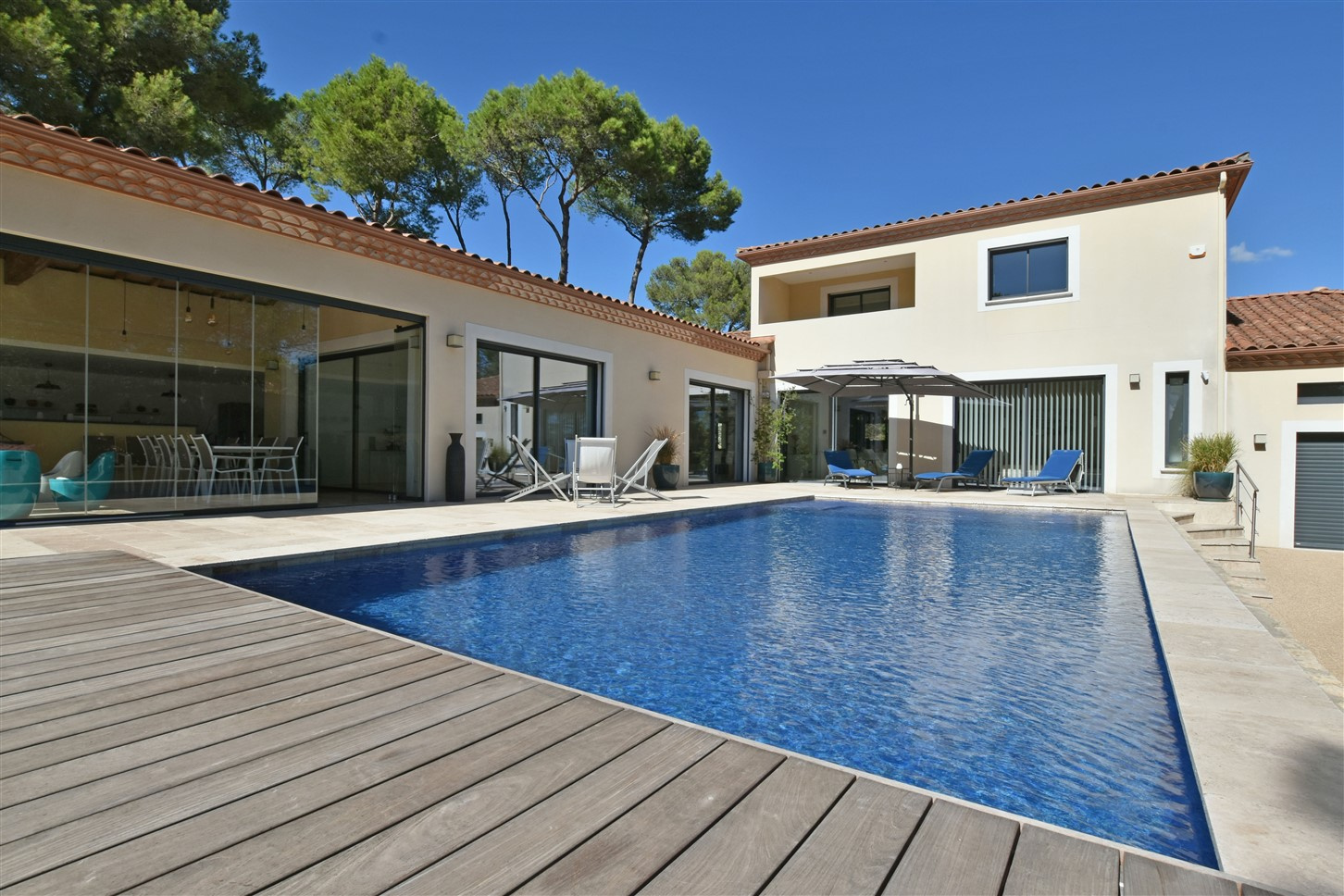 Located in the heart of the pine forest of Nages and Solorgues, in a privileged environment and absolute calm, this superb villa of 288 m2 of living space (P8) is located on a landscaped plot of 1,638 m2 with swimming pool and double garage.