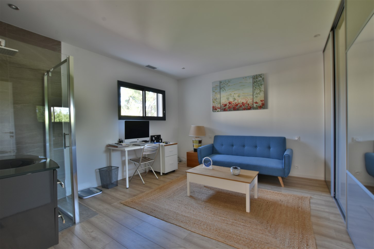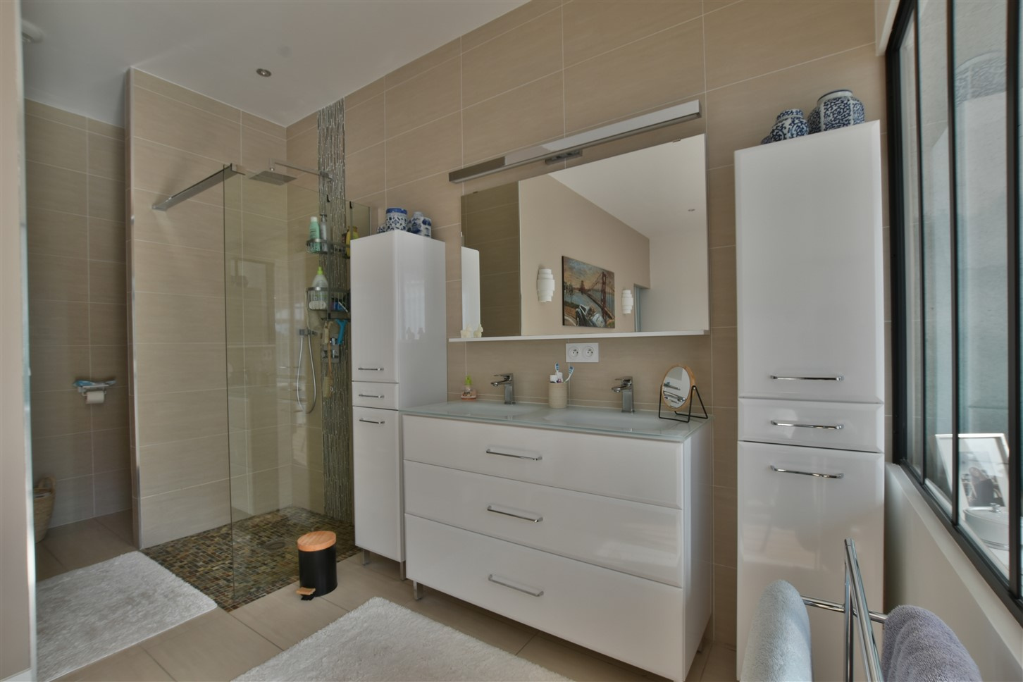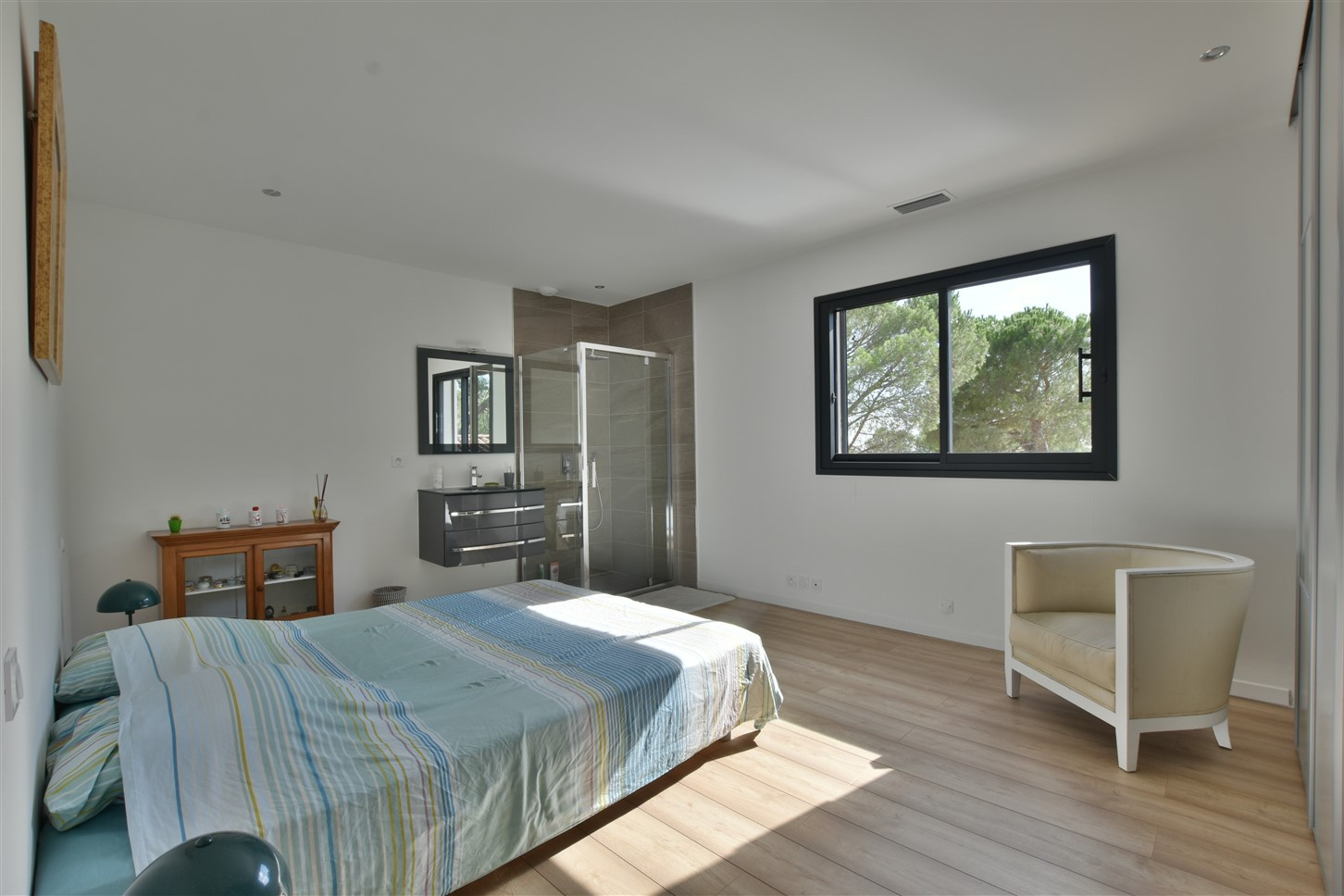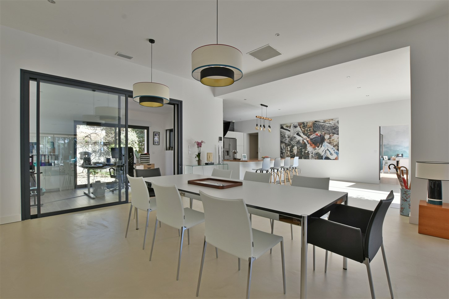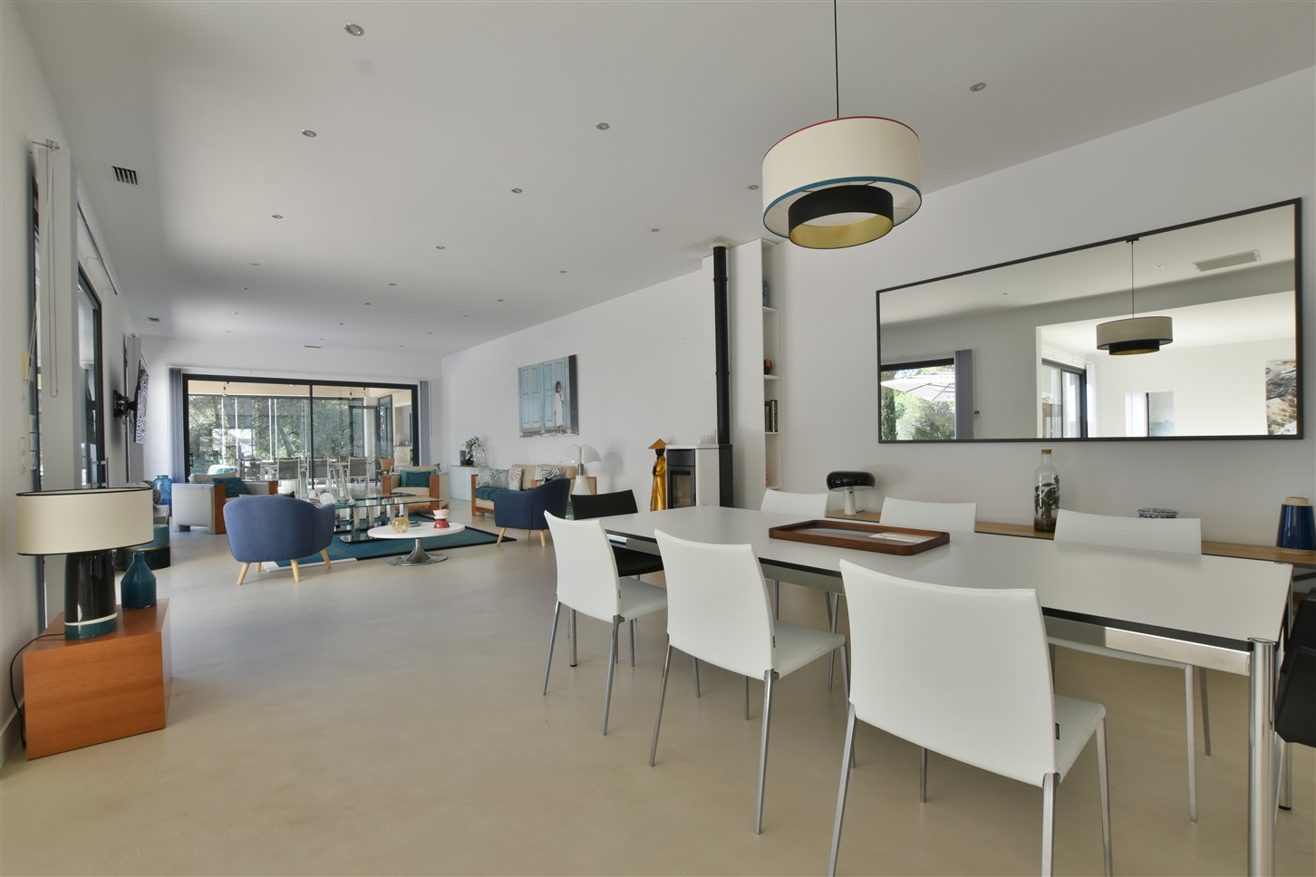 It offers very beautiful volumes and exceptional brightness thanks to its large bay windows. Living room of 108 m2 with high ceilings and polished concrete floors, opening onto the terrace and the swimming pool. Adjoining summer kitchen of 60 m2, opening onto the terrace by a large folding bay window with fully opening leaves, travertine floor and beams attached with under roof in fire-resistant, equipped kitchen. For the night area, a master suite of 32.64 m2 on the ground floor, completed by a very bright office of 14.6 m2.