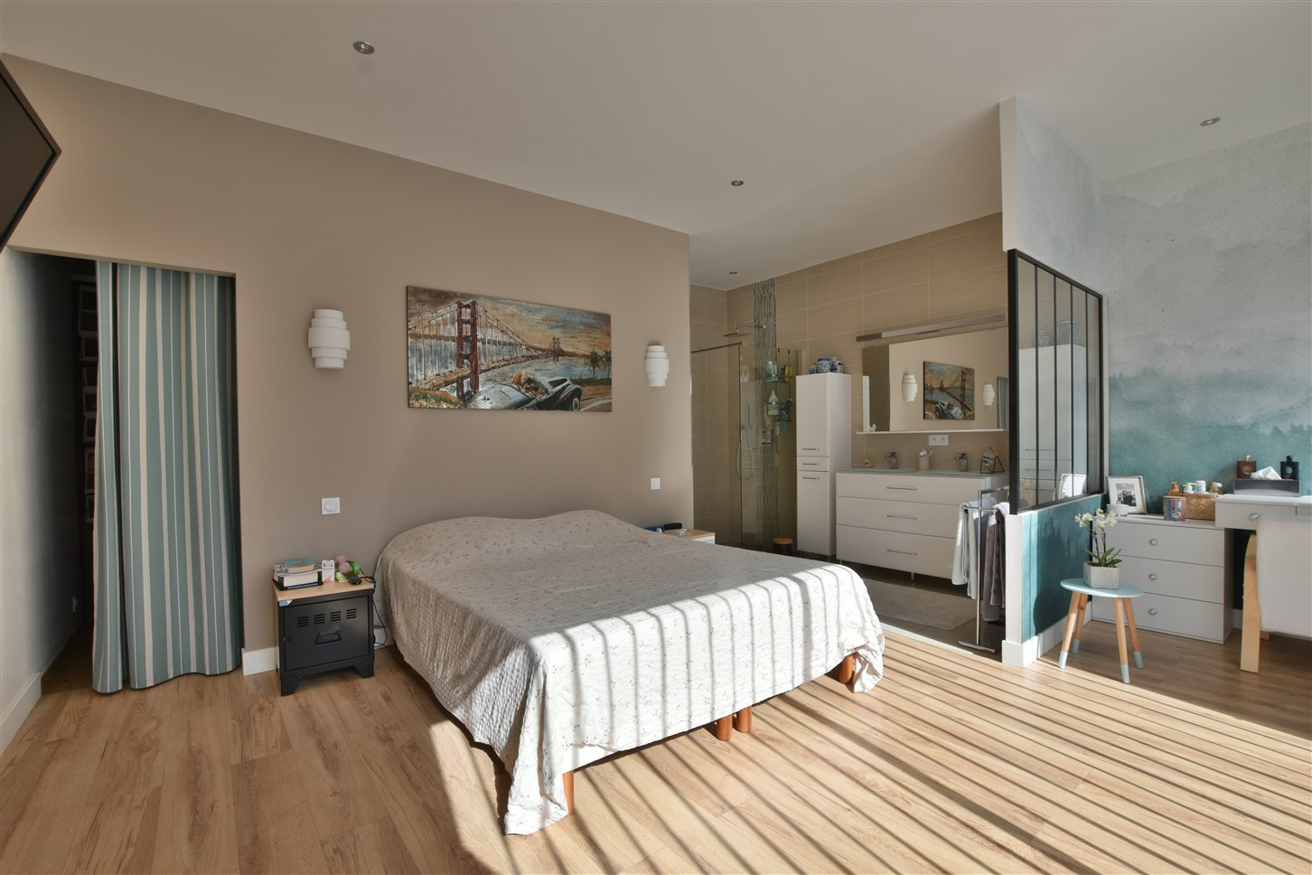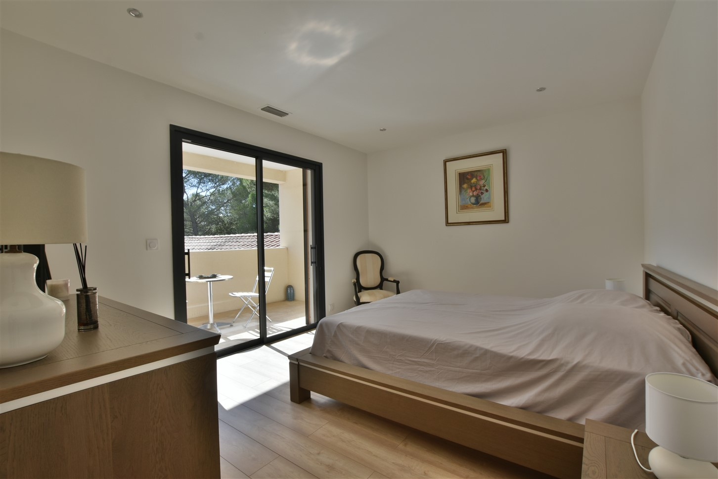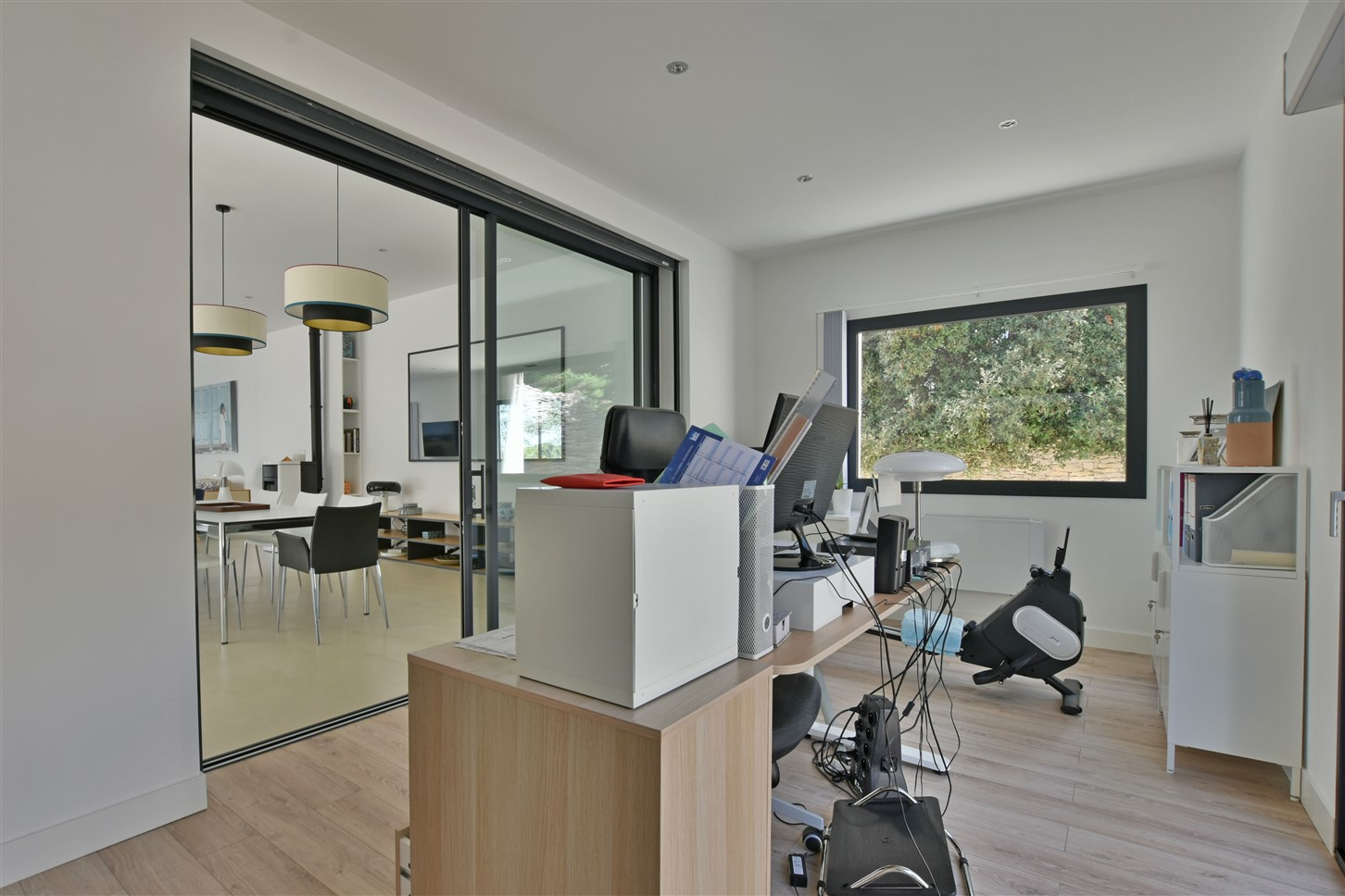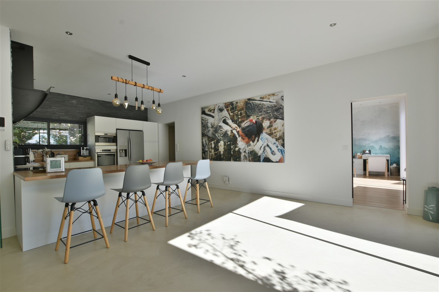 It offers very beautiful volumes and exceptional brightness thanks to its large bay windows. Living room of 108 m2 with high ceilings and polished concrete floors, opening onto the terrace and the swimming pool. Adjoining summer kitchen of 60 m2, opening onto the terrace by a large folding bay window with fully opening leaves, travertine floor and beams attached with under roof in fire-resistant, equipped kitchen. For the night area, a master suite of 32.64 m2 on the ground floor, completed by a very bright office of 14.6 m2.
